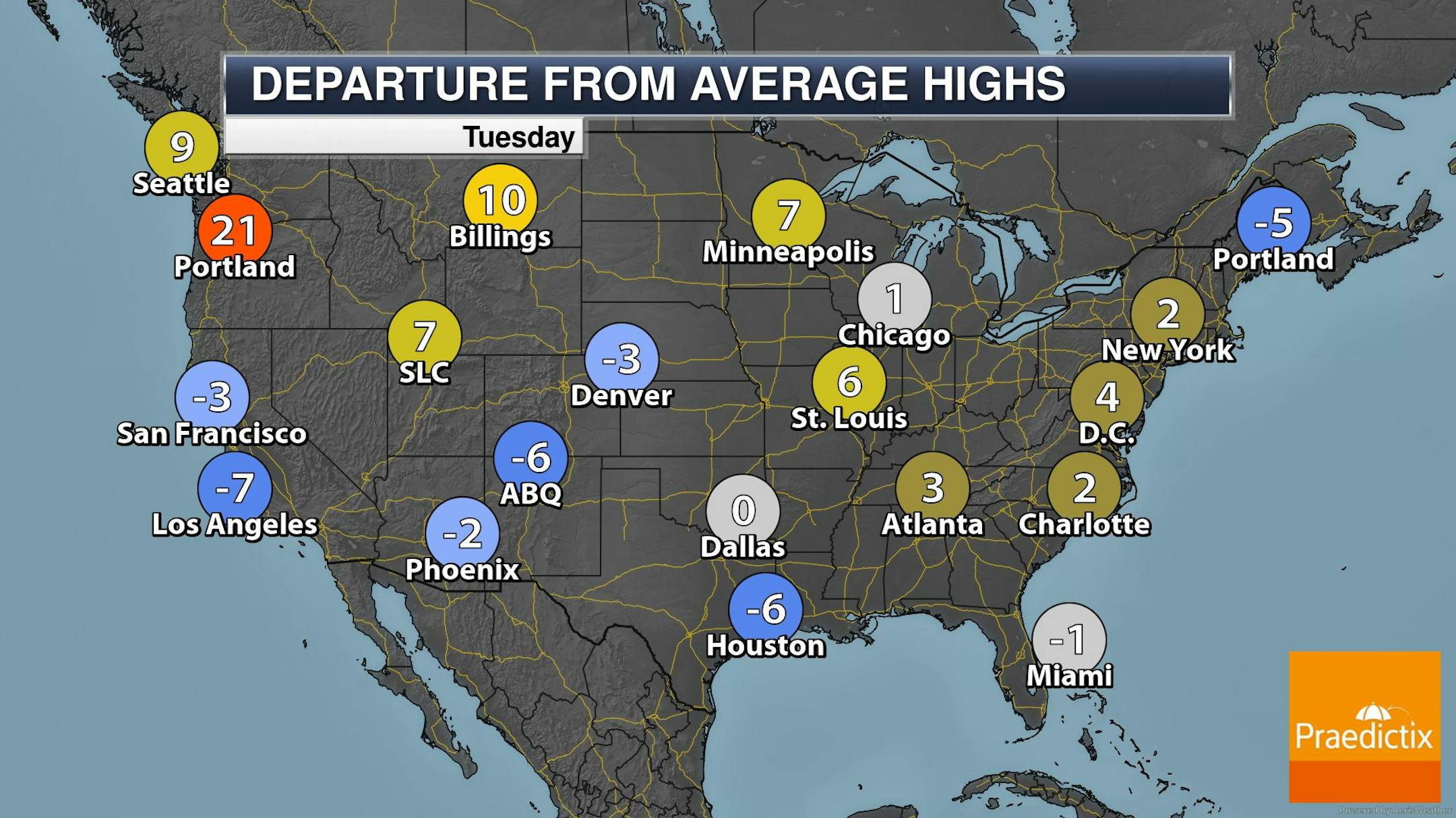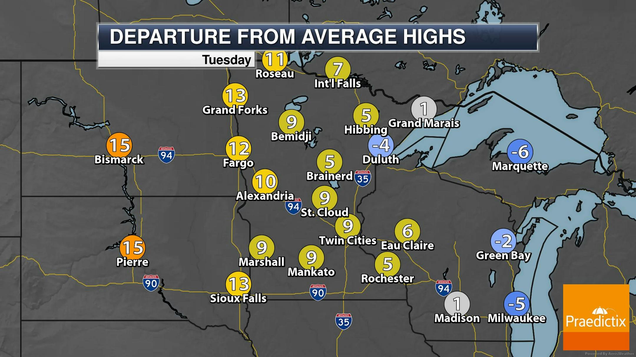 Here's the weather outlook across the region for Tuesday. High temps generally warm into the 80s across the state, which will still be nearly +5F to +15F above average. However, and easterly wind off of Lake Superior will keep temps in the 60s, which will be at or slightly below average for early June.