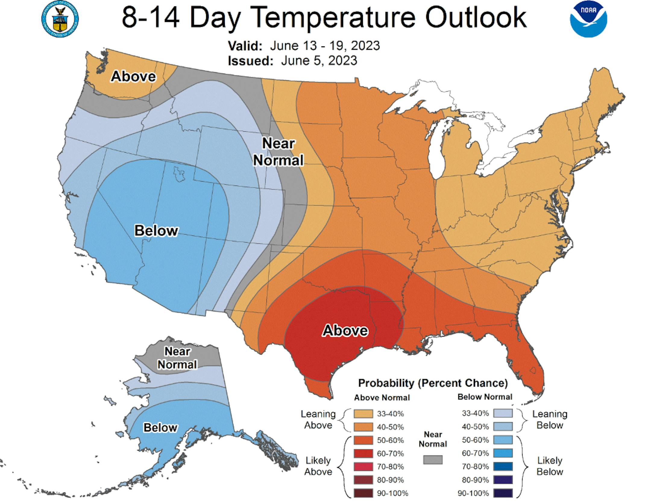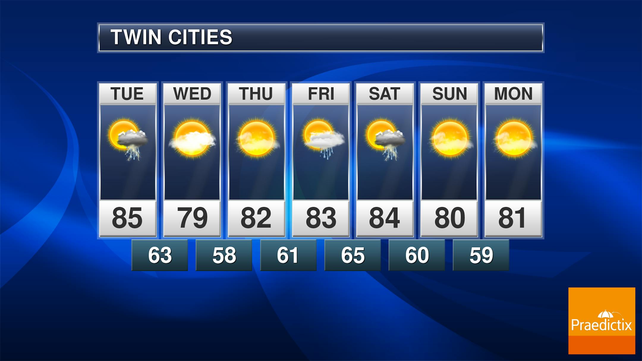 The extended weather outlook for the Twin Cities looks a little cooler through the 2nd half of the week. There could be a few spotty t-storms PM Tuesday into Wednesday and again a better chance Friday into Saturday.