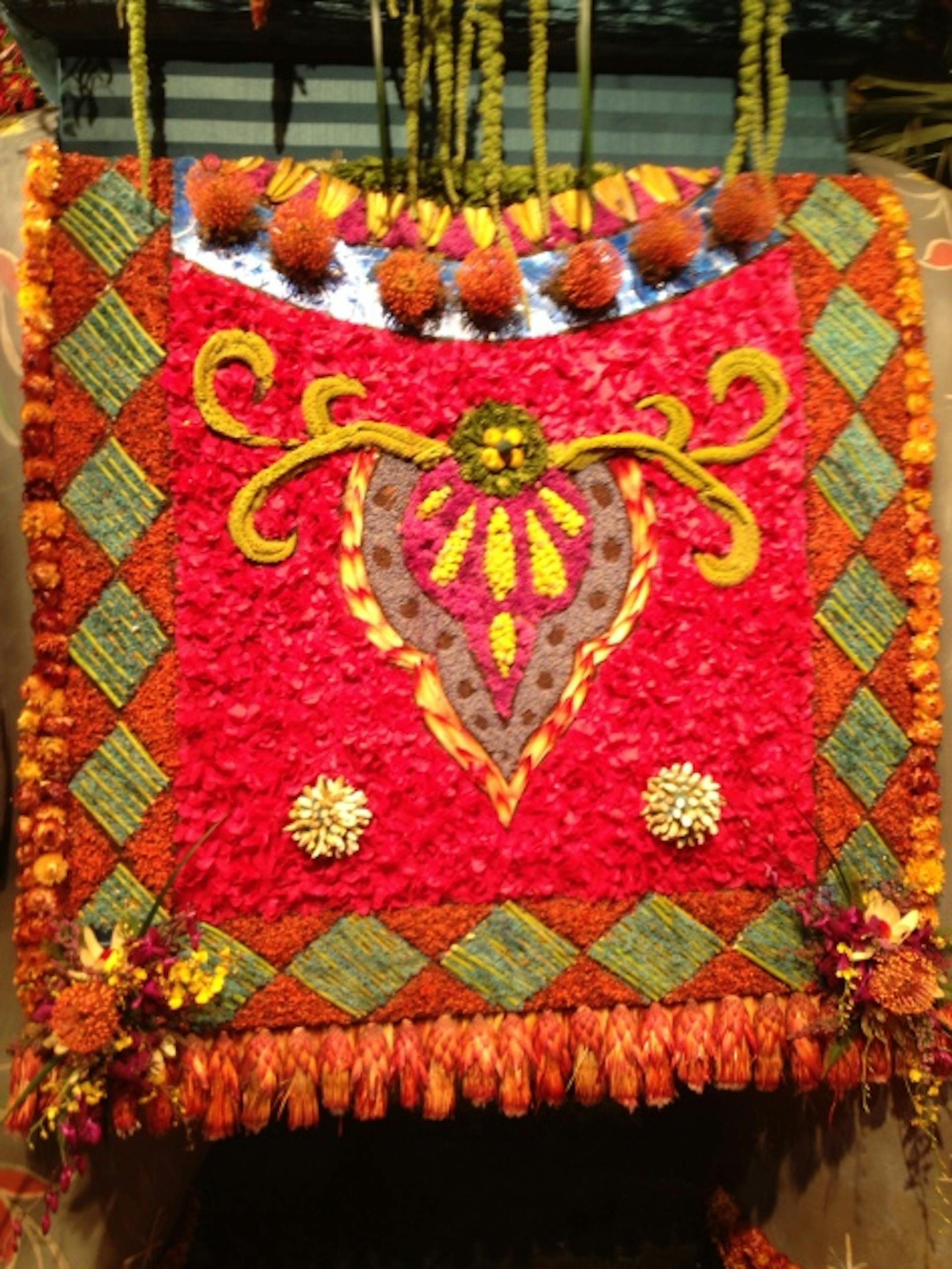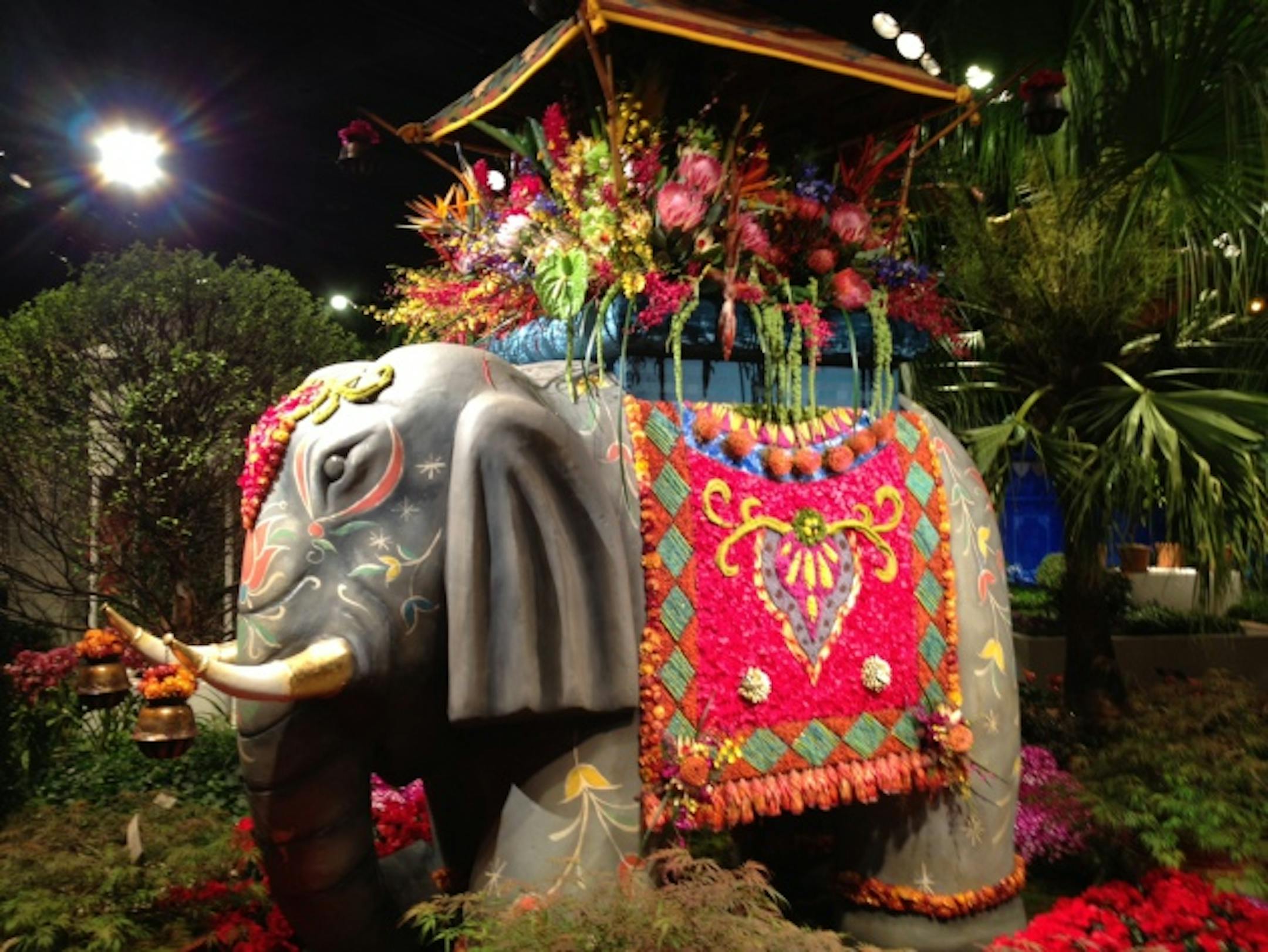 The centerpiece of the show is a giant Asian elephant statue covered with a blanket of dried and fresh plants and flowers and bearing a howdah (Indian carriage) filled with dozens of tropical blooms.