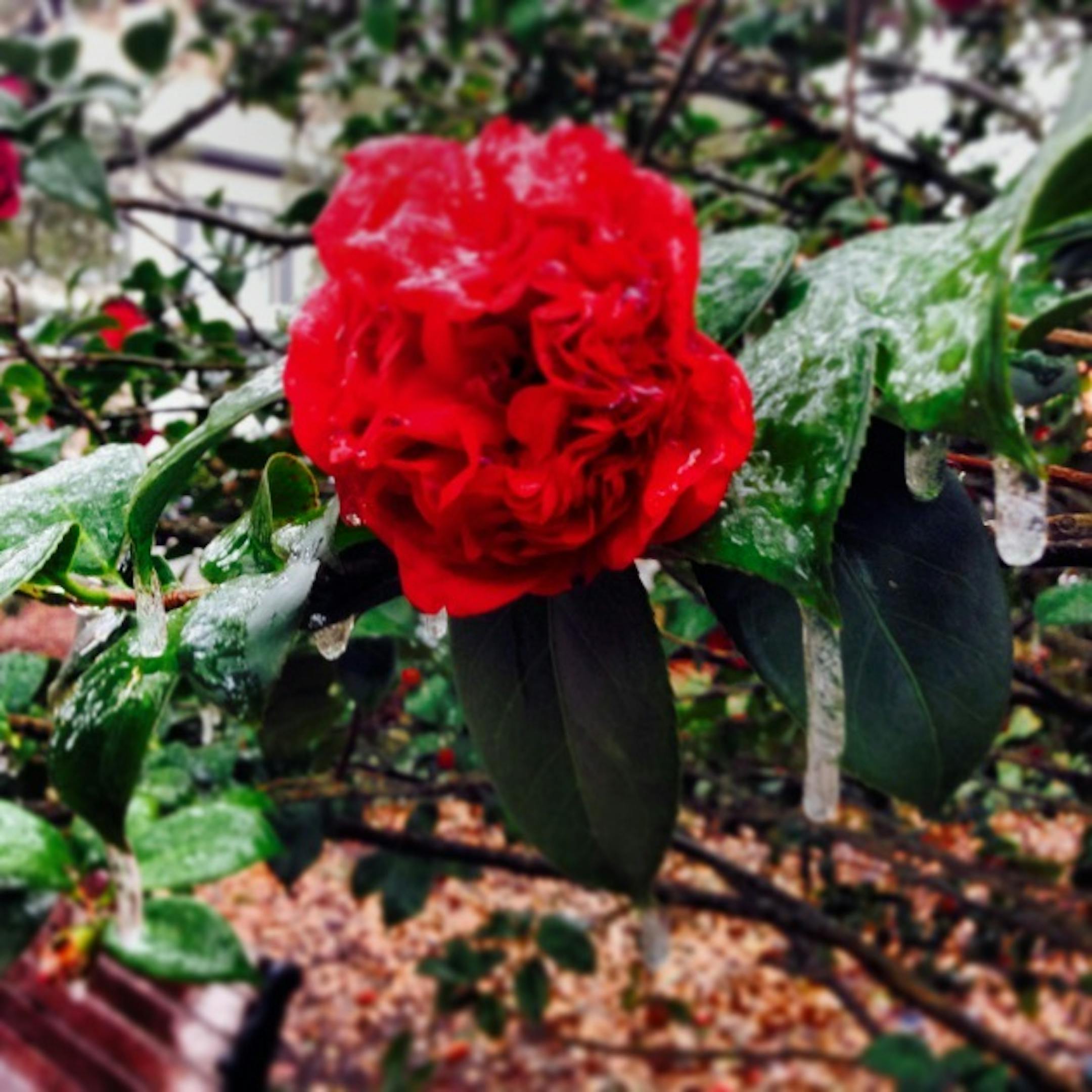 With schools and businesses wisely shut, the historic district felt like an abandoned movie set as I wandered the lonely streets. Ice accumulated on camellias and ironwork in the squares. Beads of ice upholstered the empty benches and Spanish moss sagged under its frozen weight.