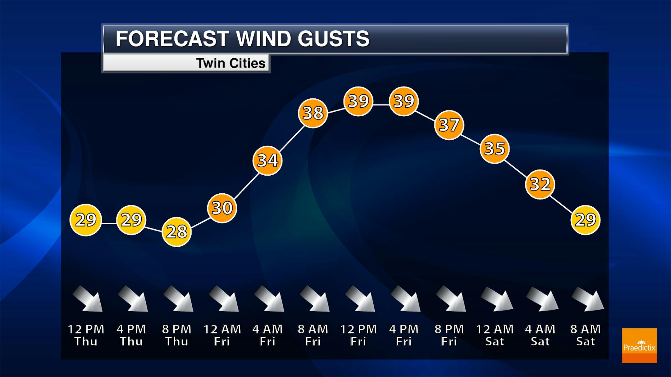 The strongest winds in the metro are expected during the day Friday when wind gusts could reach 40 mph. However, from Thursday through at least early Saturday wind gusts of 30+ mph will be possible, causing blowing and drifting snow.