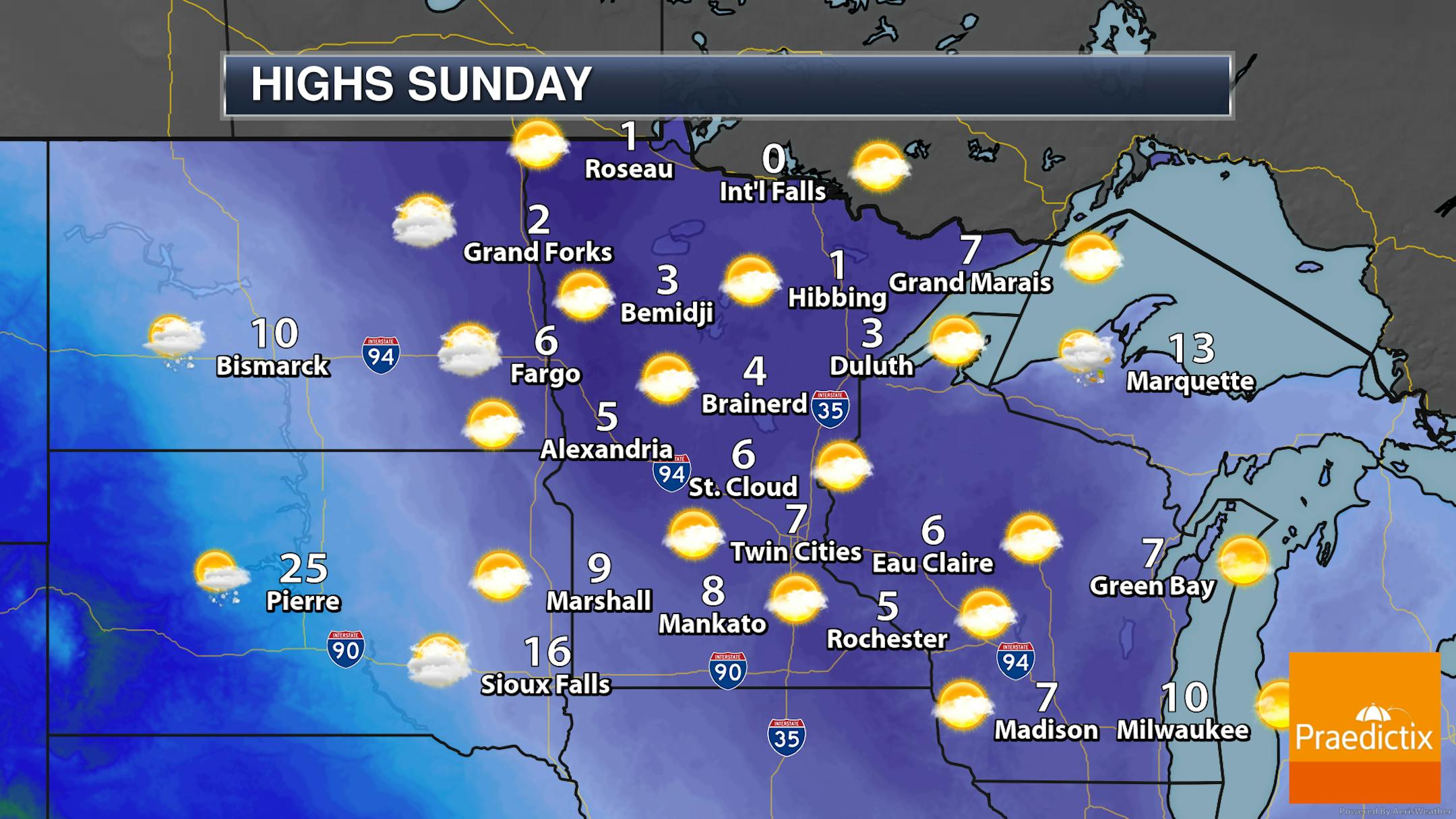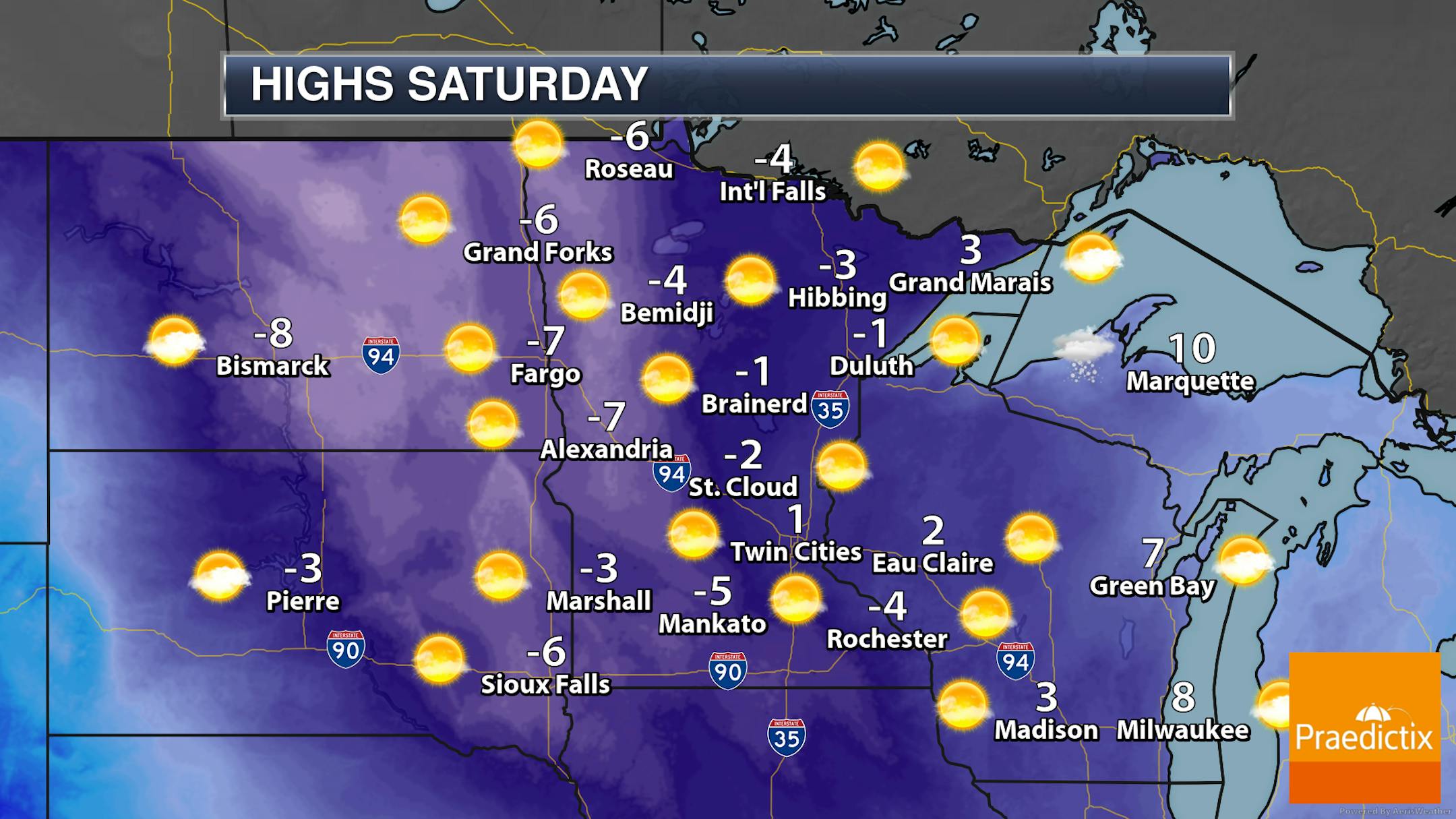 - Cold weather sticks around through the holiday weekend. Wind chills of -40F or below possible in western Minnesota, and around -30F in the metro.