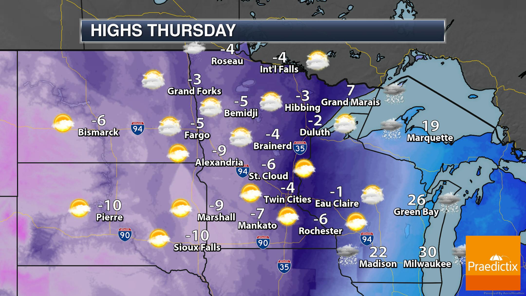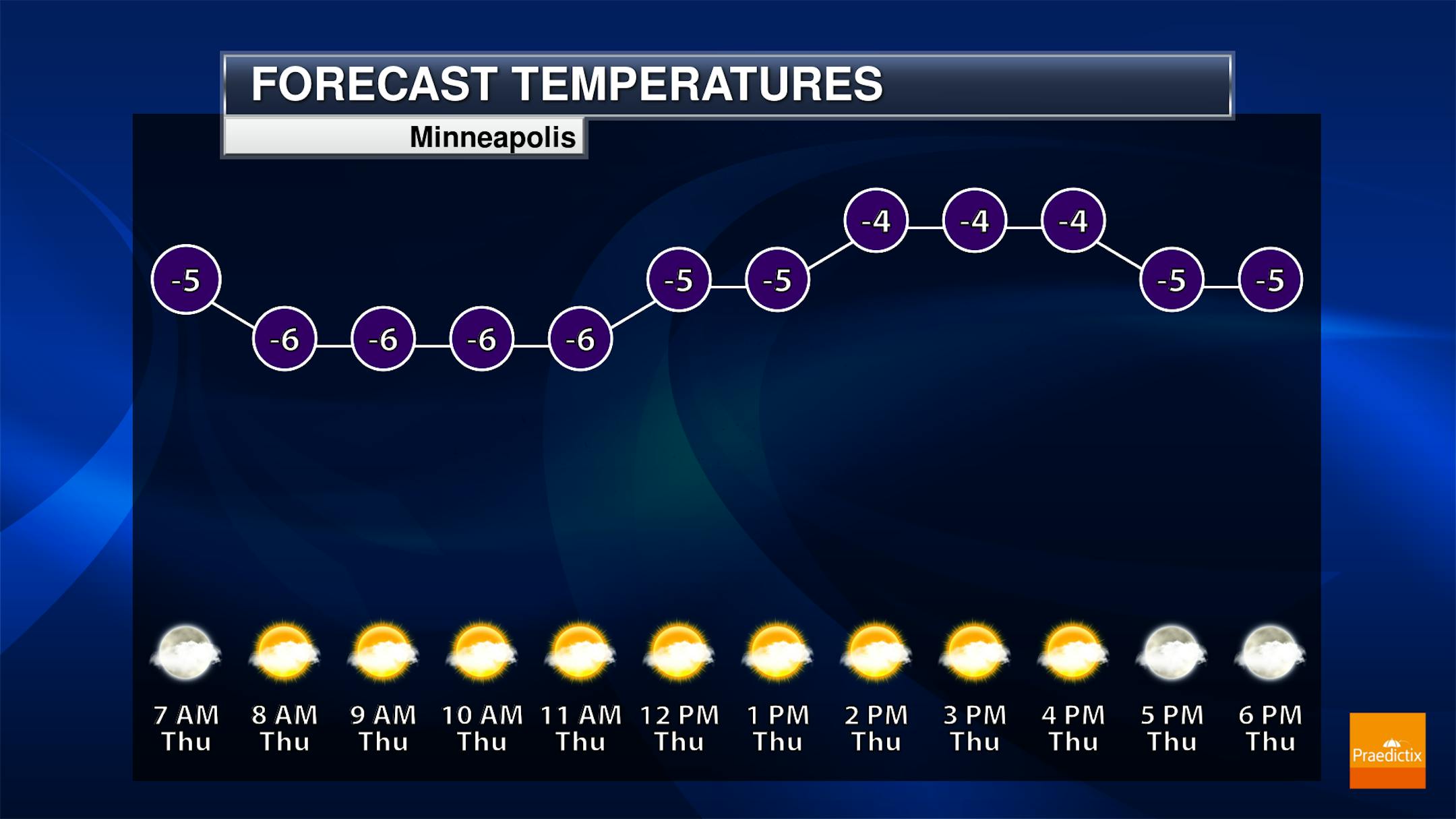 You can see those northwest winds start to increase on Thursday here in the metro with cold conditions in place. Temperatures will stay fairly steady in the mid-single digits below zero throughout the day with wind chill values in the -20s.