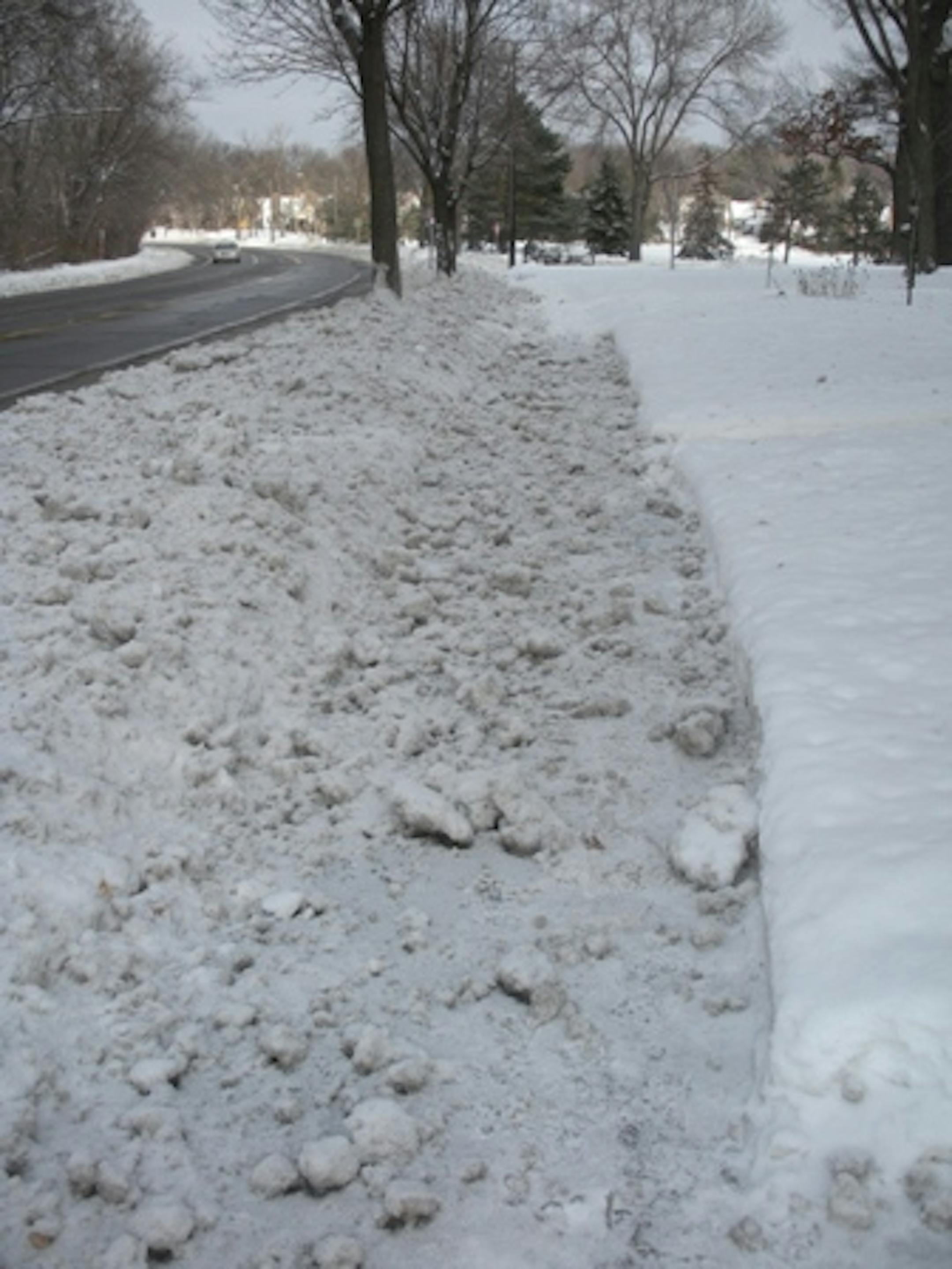 This one hits home for me, I must say, given that I nearly toppled into the street while scaling the snow berm at my bus stop this morning. Floersch and I learned simultaneously that his initial frustration with the city of Minneapolis was misdirected - responsibility for plowing his street lies with Hennepin County. Mike Legg, the county's district maintenance supervisor, still thinks it might have been somebody else's plow at fault, because his workers are instructed to give up a little road width rather than sacrifice the sidewalk.