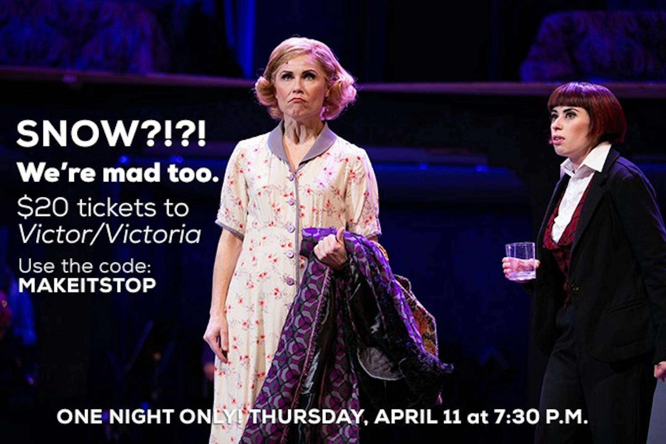 NEW: Artistry Theater in Bloomington is offering $20 tickets (reg. $41-$46) to Victor/Victoria, the Blake Edwards/Henry Mancini musical that deduted in Minneapolis in 1995 based on the 1982 movie, The discount is good Thursday night only. Purchase tickets on the website or at the door using code MAKEITSTOP. The theater is in the Bloomington Center for the Arts in Bloomington at 1800 W. Old Shakopee Rd.