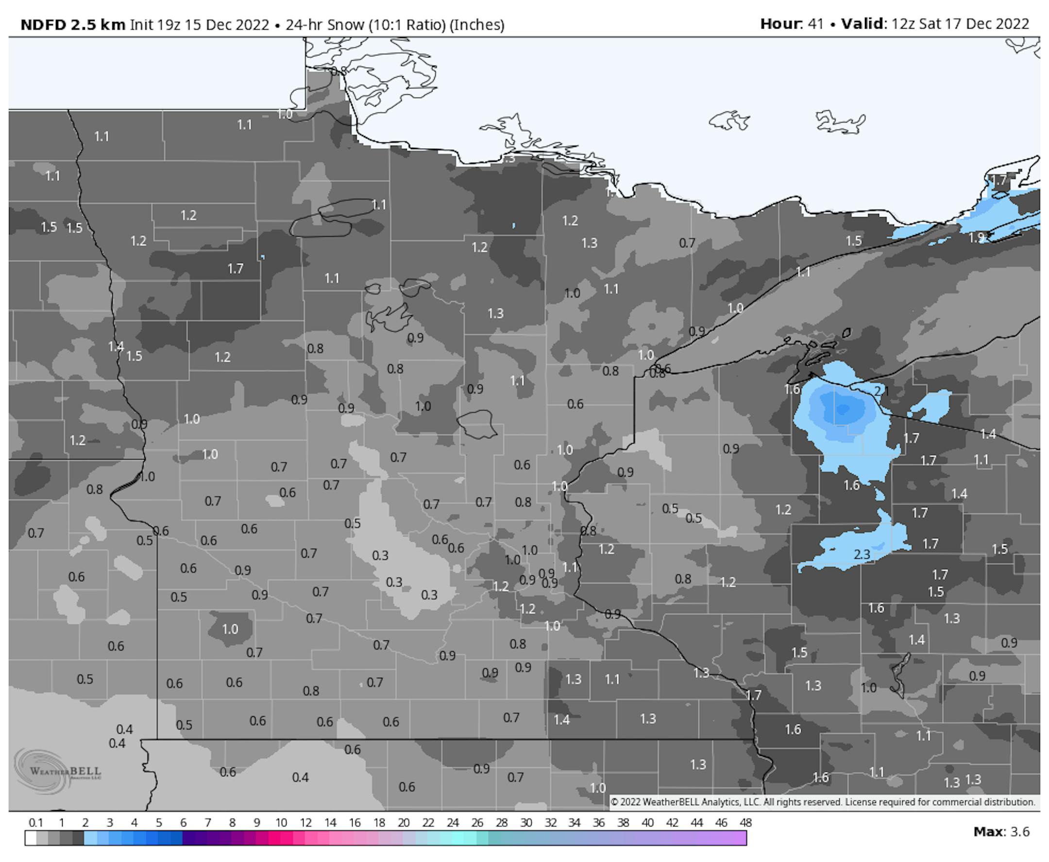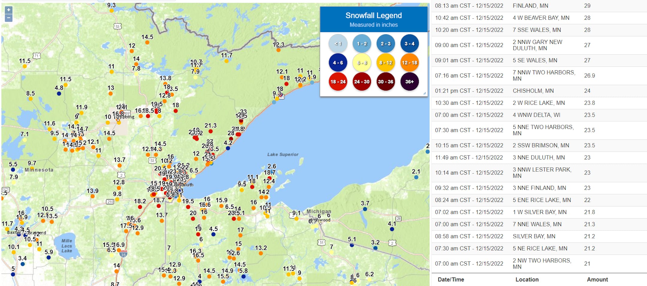 The snow has been piling up on the North Shore, where over two feet has been reported! The top total out has been out of Finland where 29" of snow was reported Thursday morning. Through about 11:30 AM, the official reporting station in Duluth (at the NWS) reported 22.7" of snow - making it the 7th largest 2-day unique storm snow total on record (this is because if you just went with 2-day totals - without factoring out the same storm showing up twice - the Halloween blizzard falls into two spots).