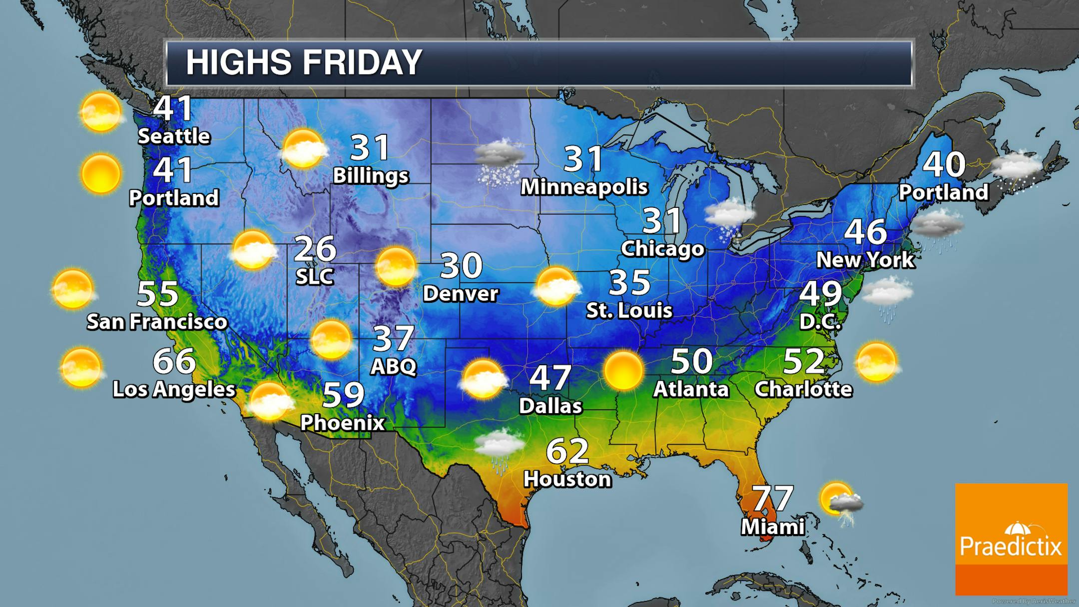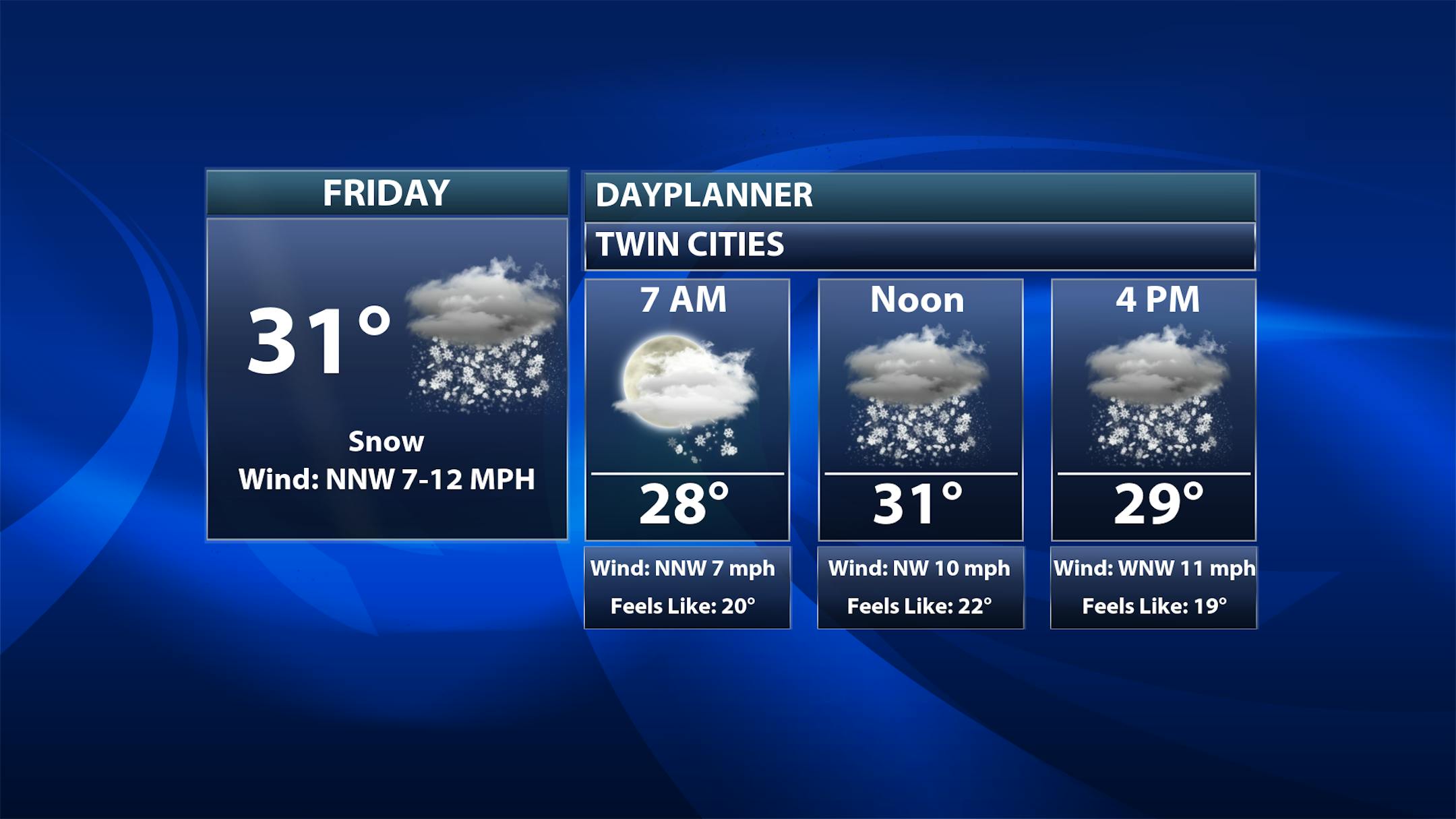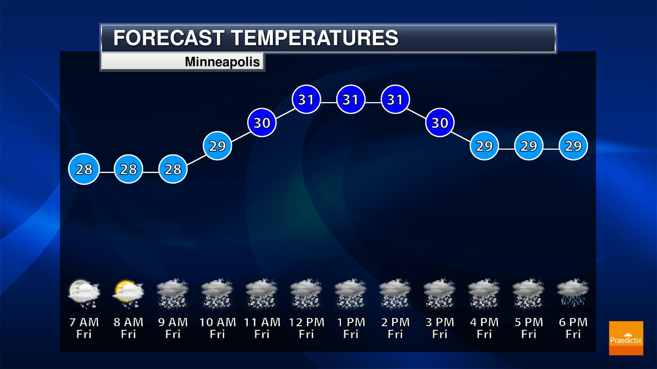 With more snow in the forecast for the metro on Friday, temperatures will be fairly steady - within a few degrees of 30F throughout the day. Winds will be a little stronger than Thursday - out of the northwest up to around 15 mph.
