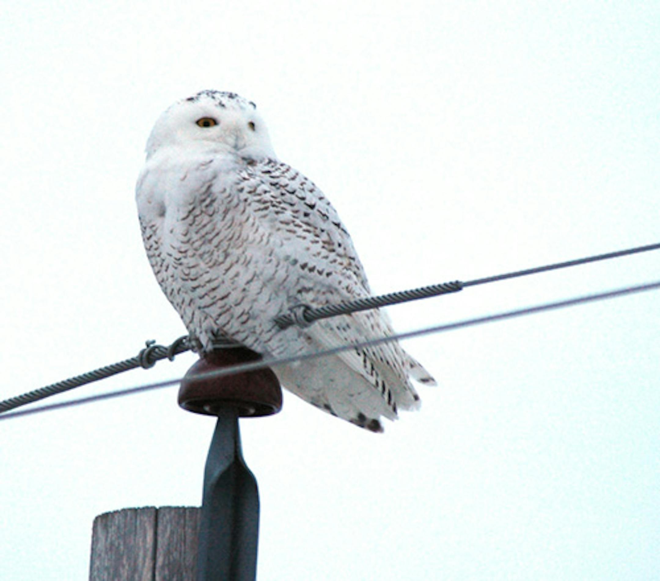 The Snowy Owl shown here is most likely a juvenile bird. The heavy dark marking is typical of young birds. Female adults are barred to a lesser degree. Adult males can be pure white. They are the grail of owl searches. This bird is atop a power-line pole. Many of the current Minnesota birds are being seen on poles.