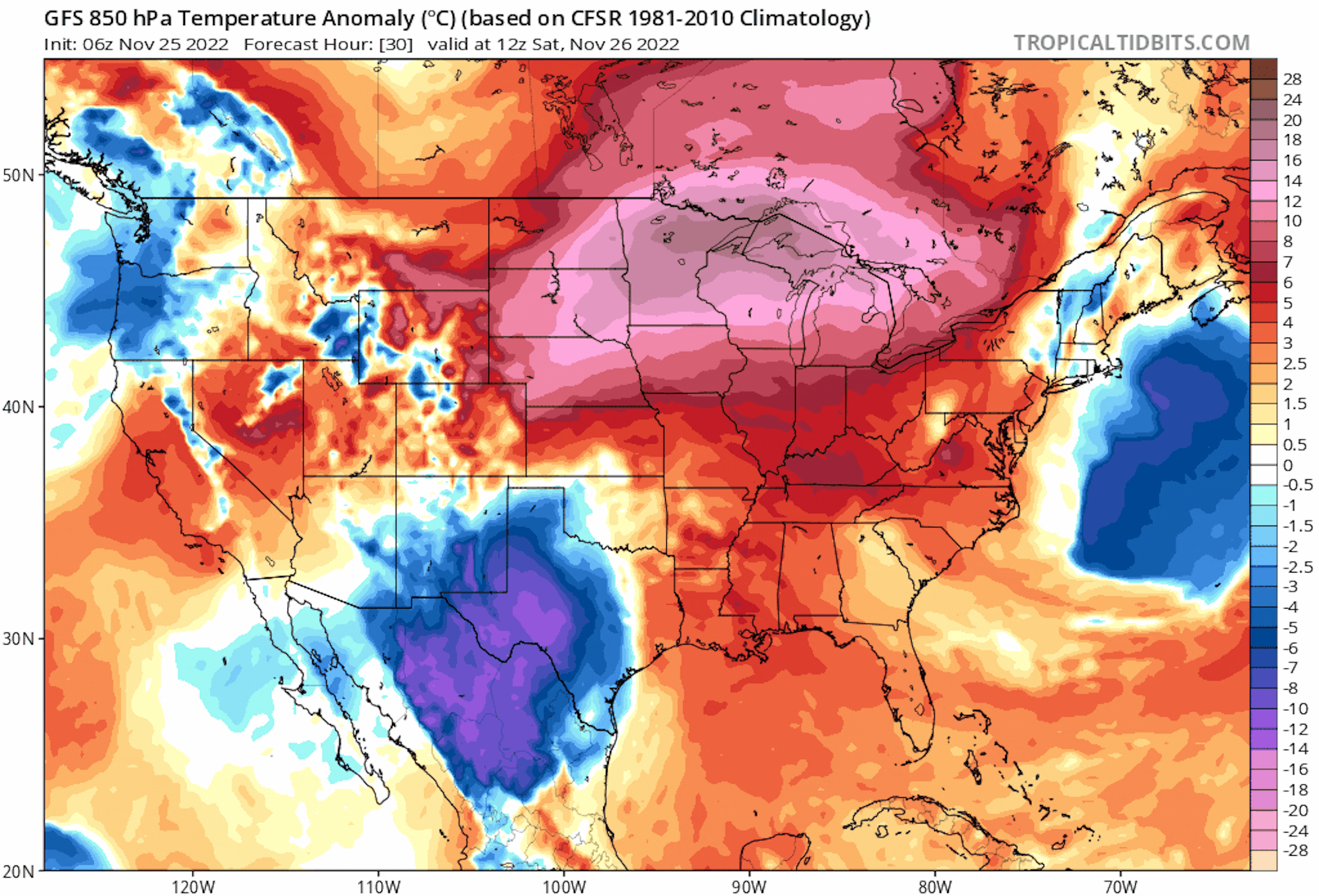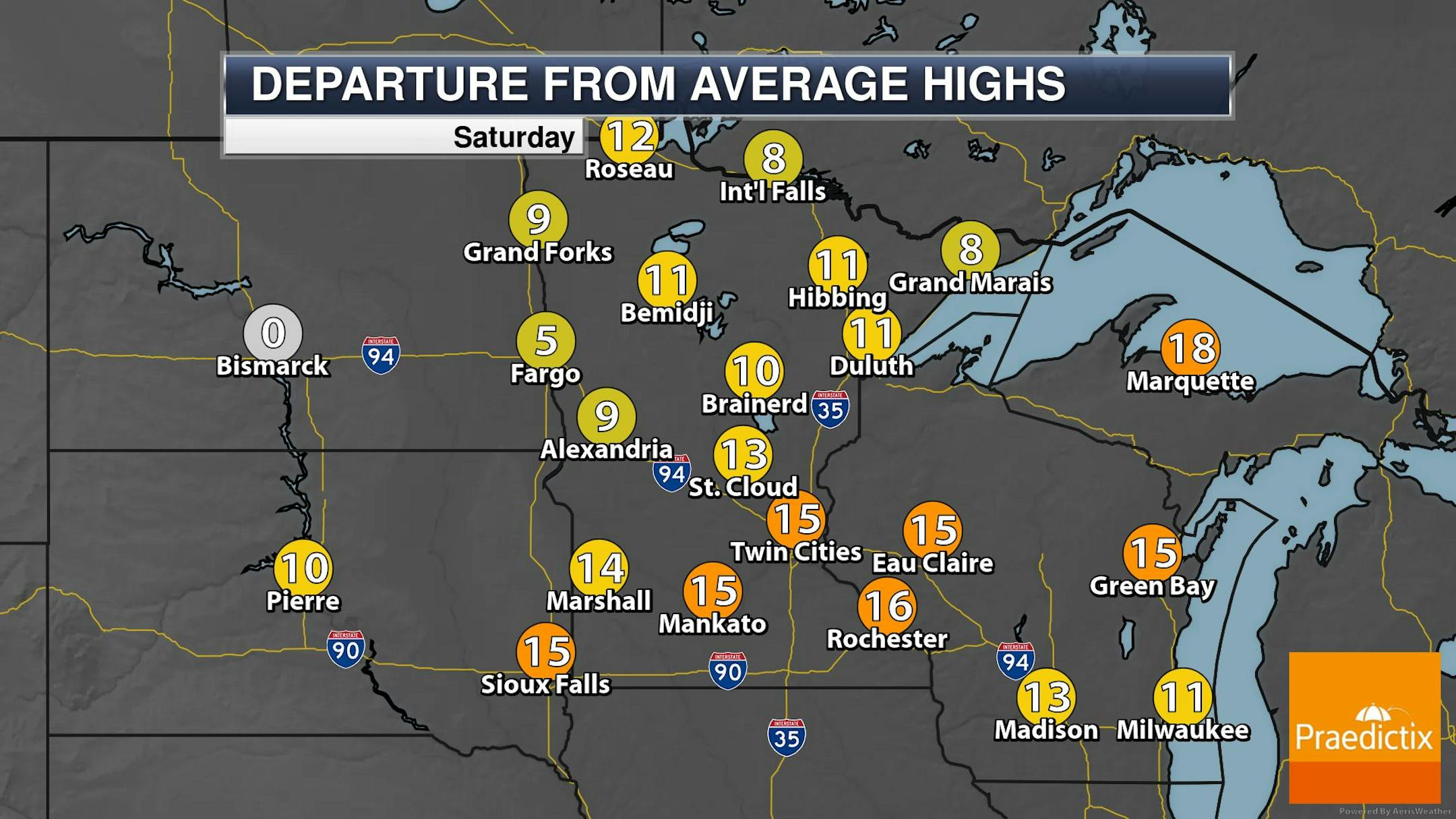 The 850mb temp anomaly through the week ahead shows warmer than average temperatures continuing on Saturday before cooler temps arrive late weekend and into most of next week.