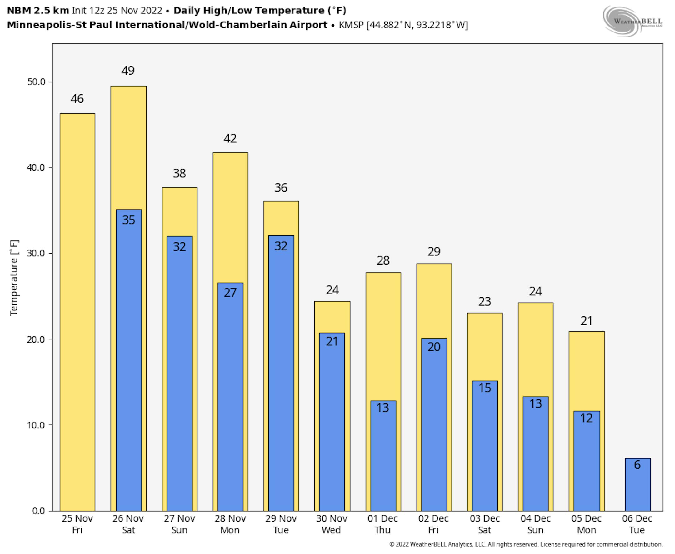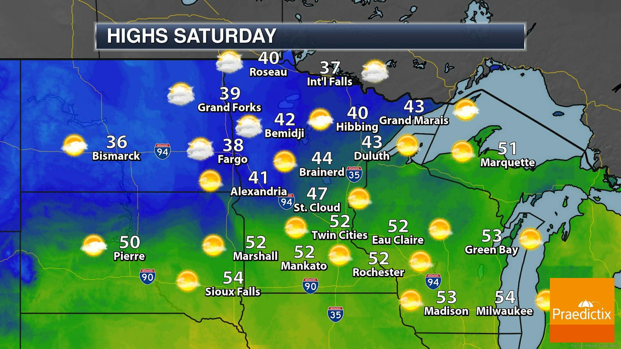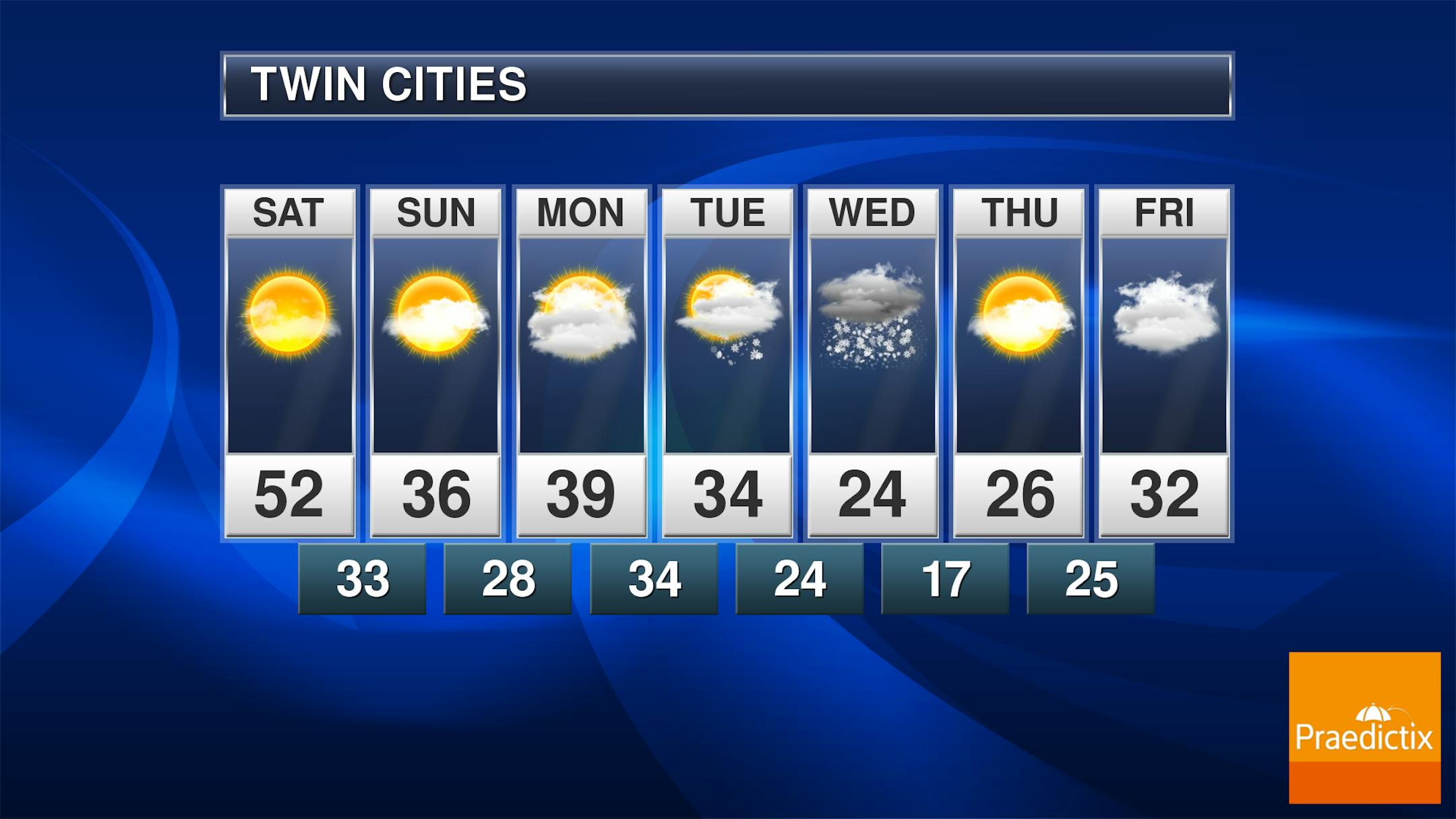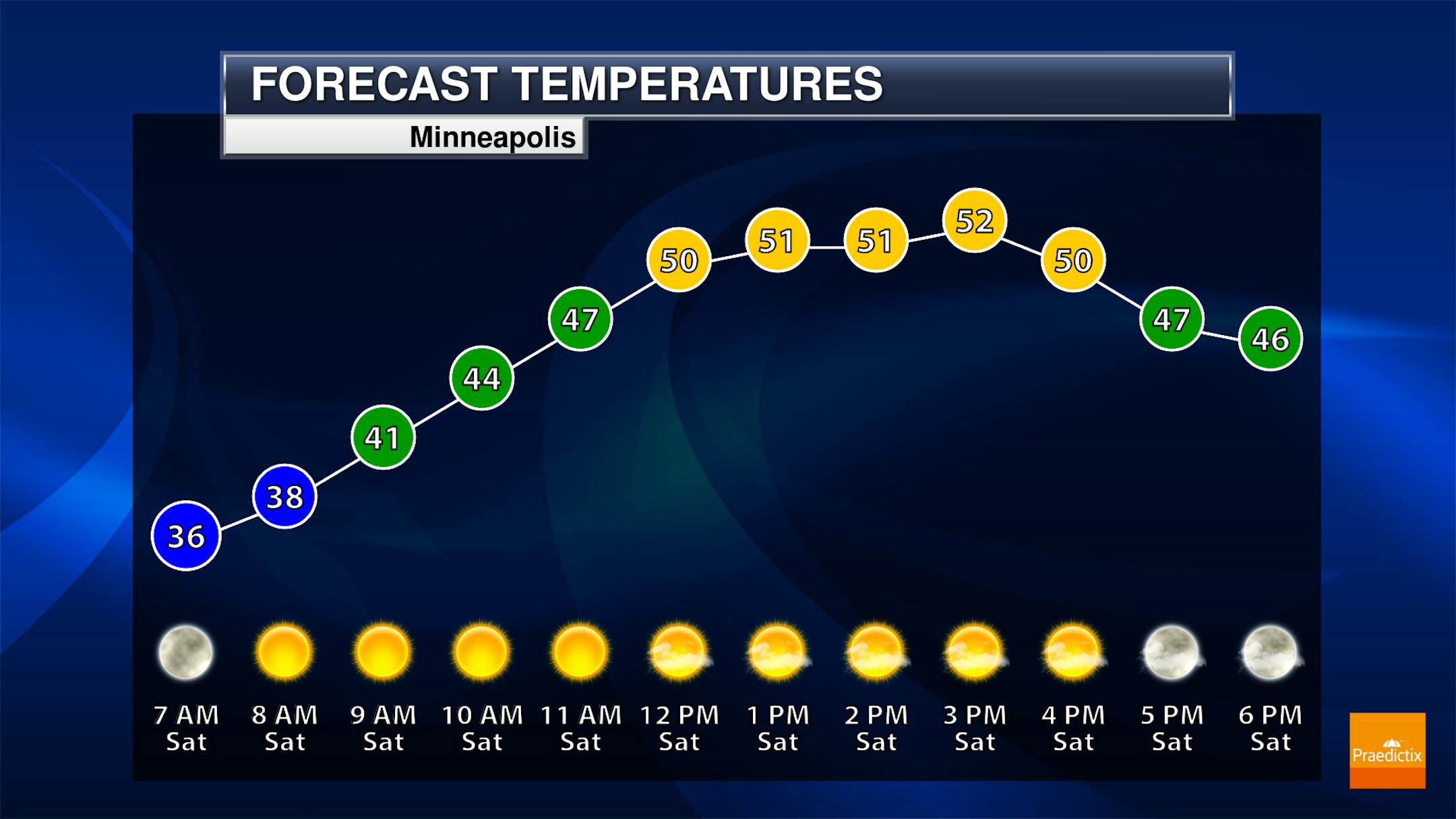 Here's the weather outlook for the Twin Cities on Saturday, November 26th. It'll be another quiet and very mild day with temps warming into the 50s by the afternoon.