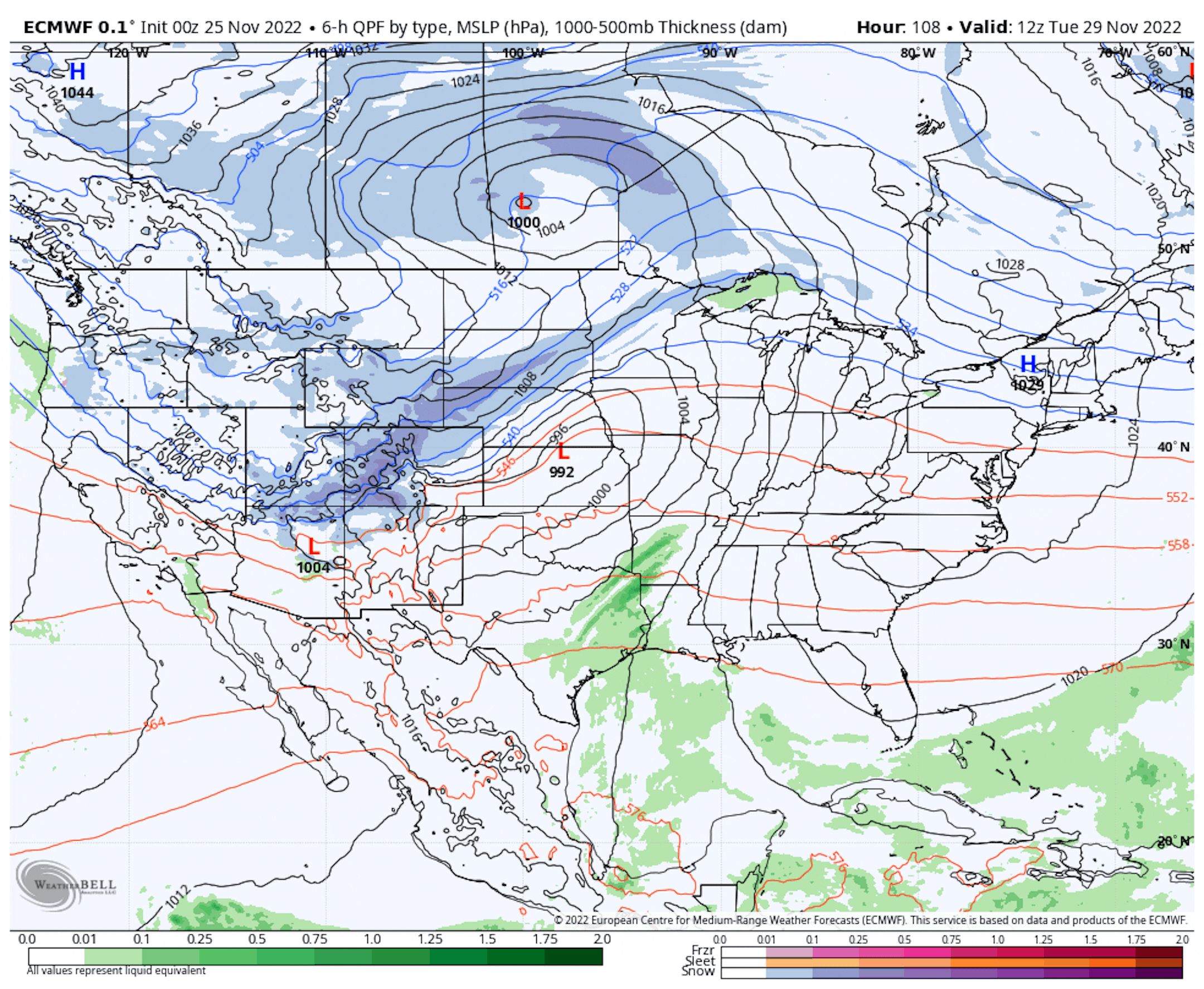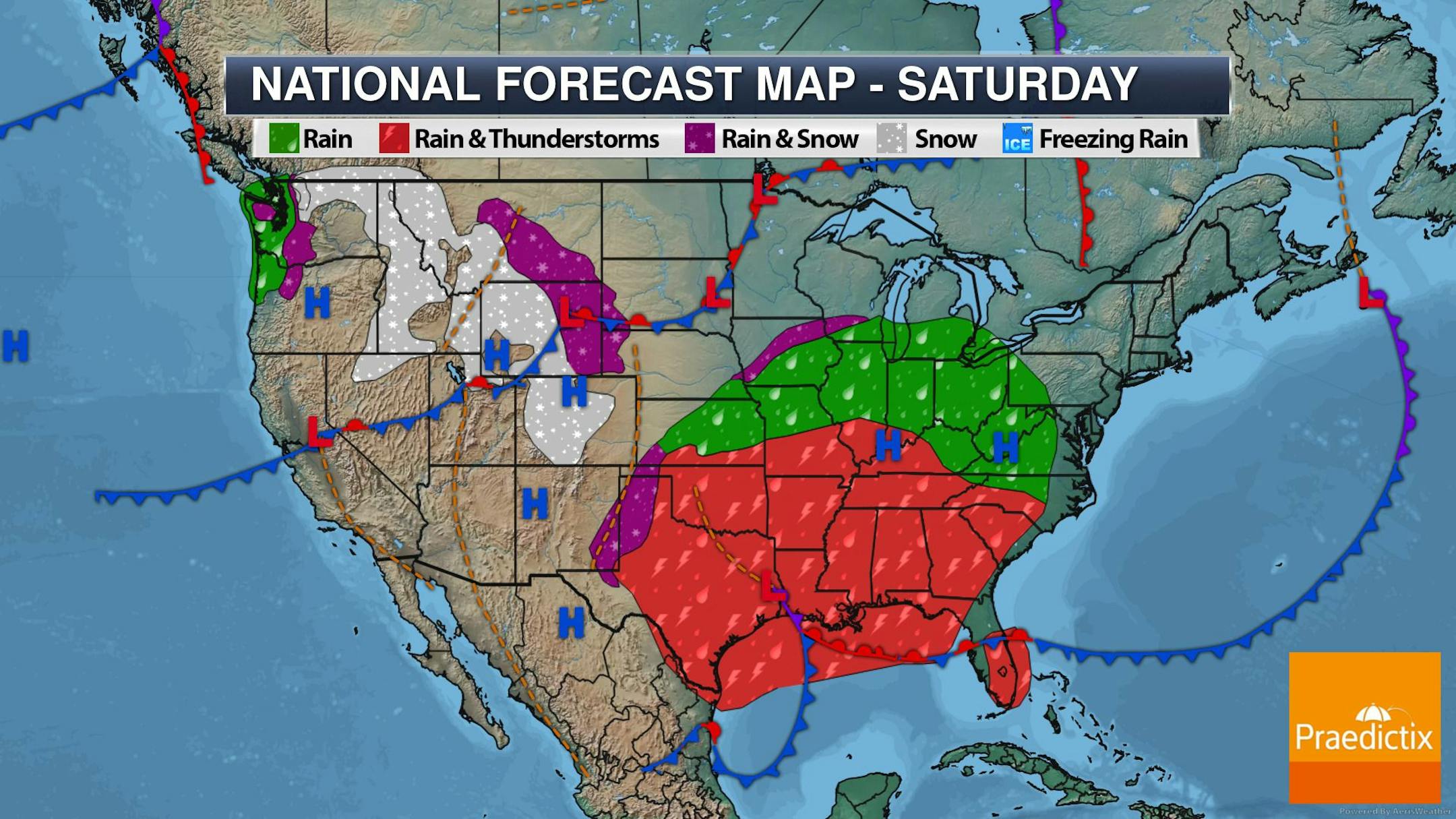 Here's the weather outlook from 7pm Monday to 7pm Wednesday, which shows a developing storm system moving through the middle part of the country through the first half of the week. Strong to severe storms will be possible across the Lower Mississippi Valley with heavy rainfall, while plowable snow will be possible the Upper Midwest.