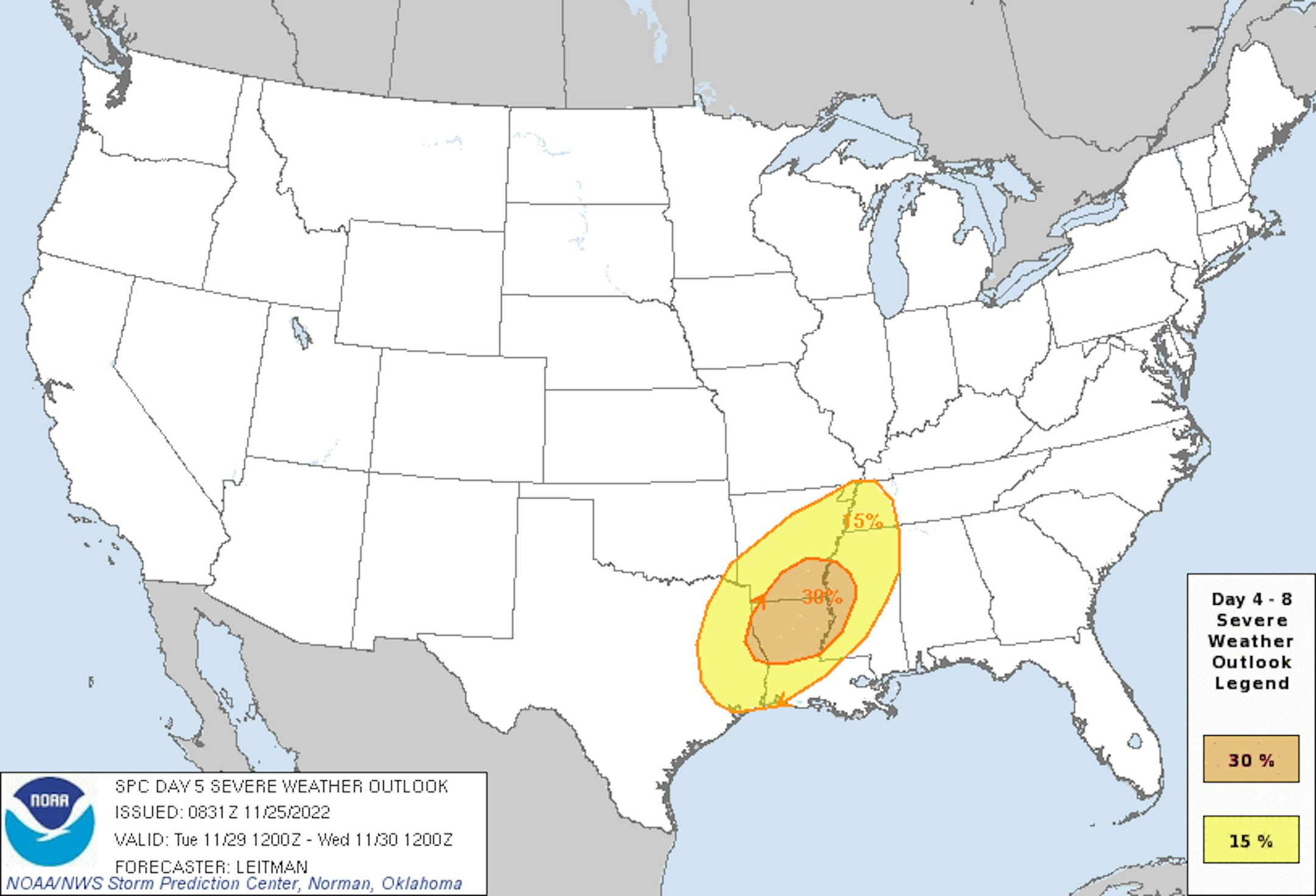 According to NOAA's Storm Prediction Center, there is a risk of strong to severe thunderstorms on Tuesday across the Lower Mississippi Valley