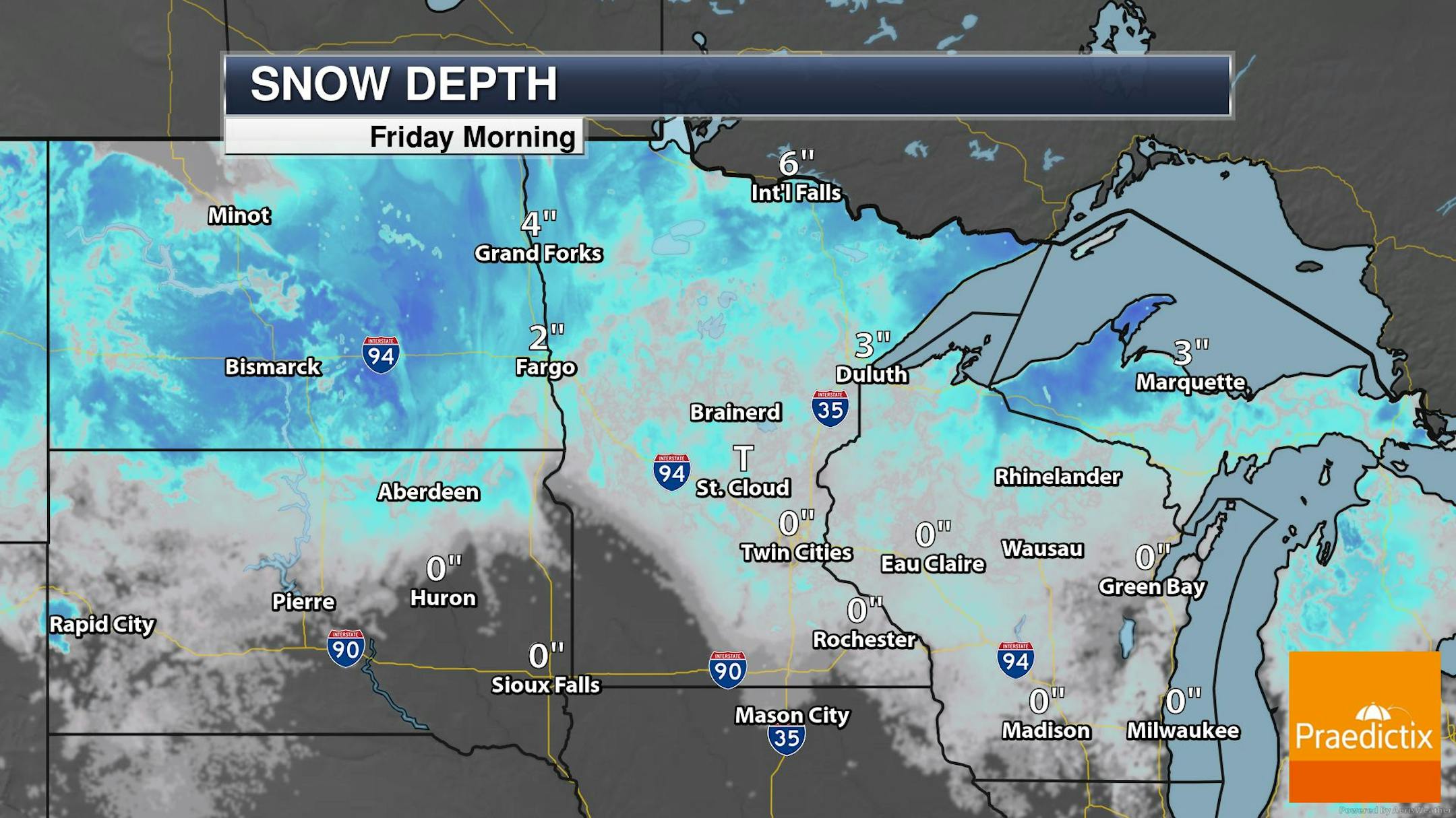 After a cold and somewhat snowy week last week, a number of locations around the region are still reporting snow on the ground. However, recent mild weather has allowed that snow to melt to a trace across much of Central and Southern MN. Far northern Minnesota is still reporting a decent amount on the ground with 6" in International Falls.