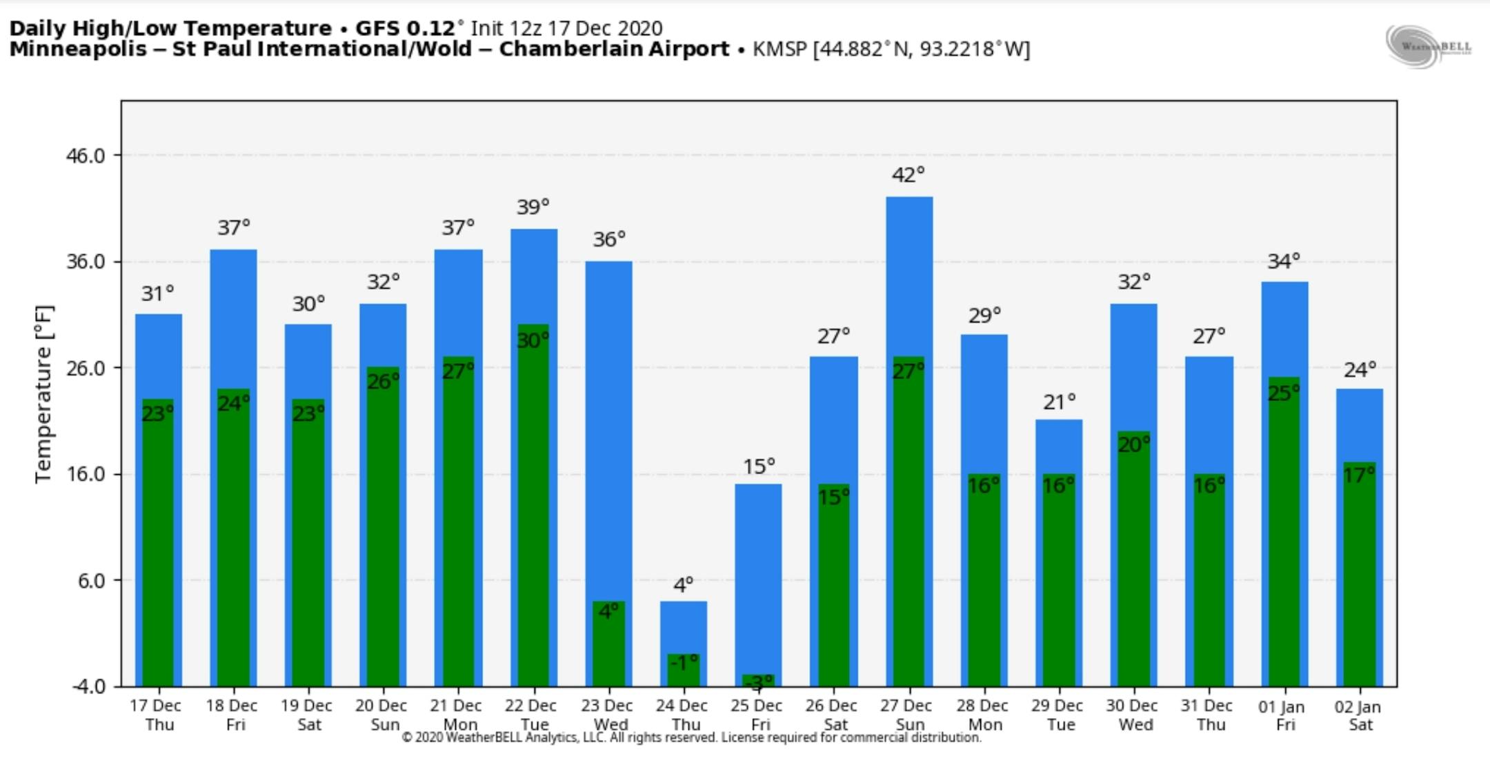 One thing is quite certain: Your jingle bells may freeze solid by late next week. ECMWF predicts a metro high of -3F Christmas Eve. NOAA's GFS model says 4 above. All or nothing.