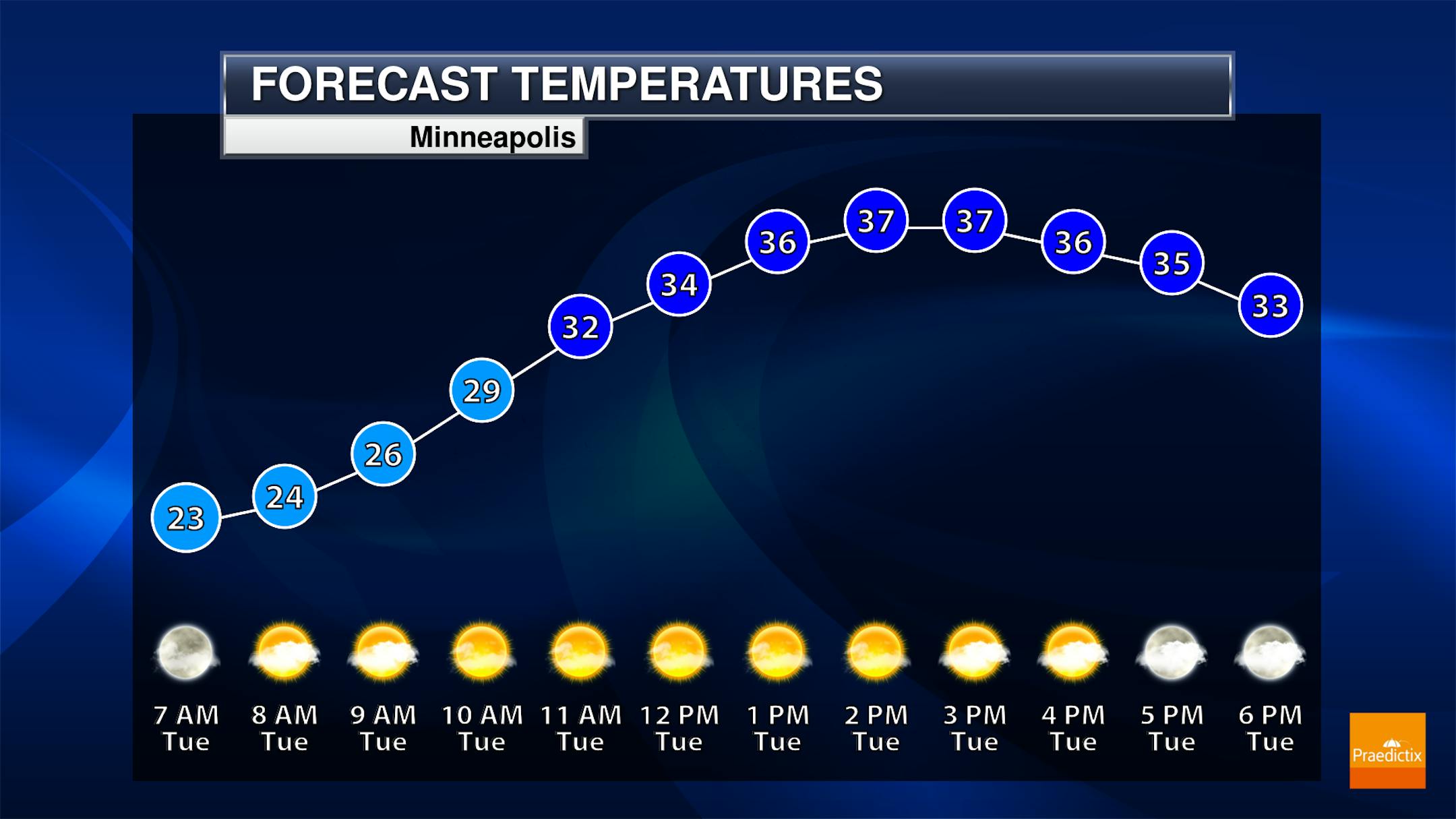 Temperatures in the Twin Cities will start in the low to mid 20s in the morning and will warm into the upper 30s by the afternoon with dry and sunny skies. Southwesterly winds will be around 15mph to 25mph, which may make it feel more like the freezing mark or below through the day.