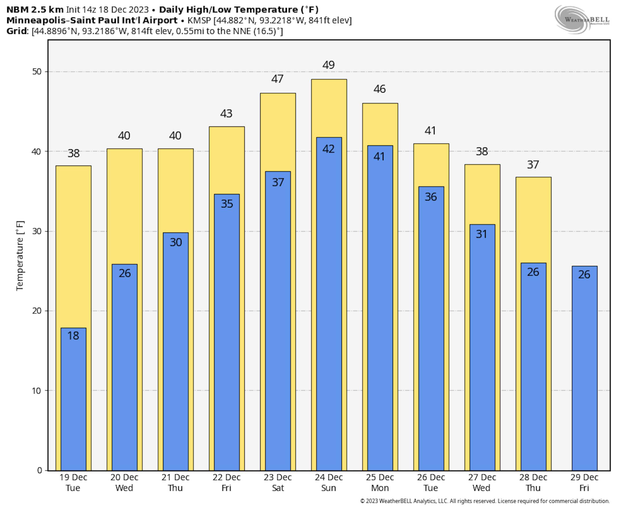 The weather outlook for the Twin Cities on Tuesday, December 19th will be dry and quiet with temperatures warming into the upper 30s by the afternoon, which will be nearly +10F above average for this time of the year. Skies will be dry and mostly sunny once again with southwesterly winds around 15mph to 25mph through the day.