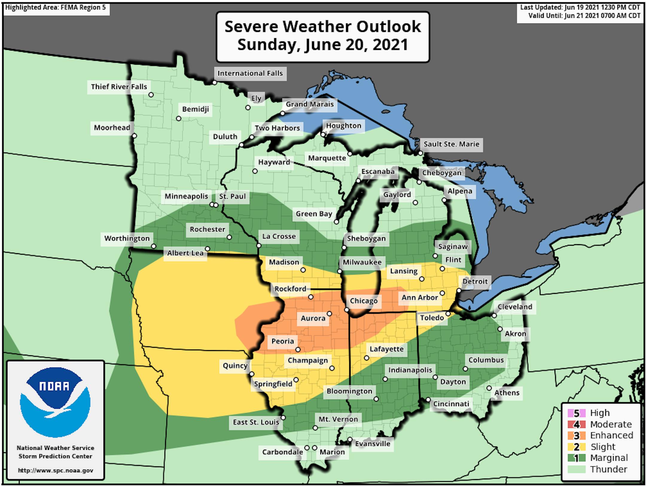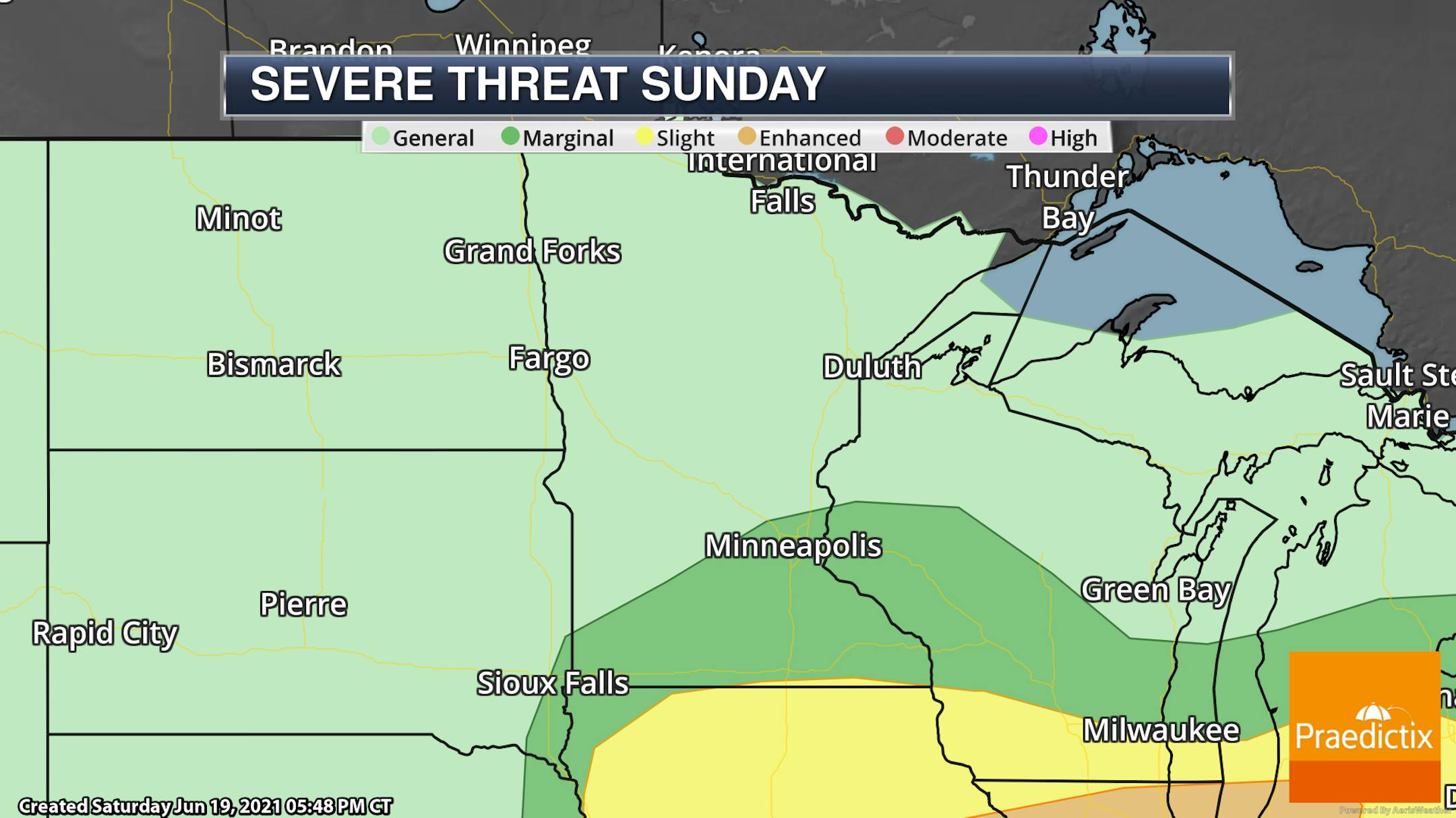 A few of the storms could be on the strong side, and due to that, a Marginal Risk of severe weather (threat level 1 of 5) is in place across southern Minnesota up to the metro. Large hail and damaging winds are the main threats, but a tornado or two can't be ruled out across far southern Minnesota.