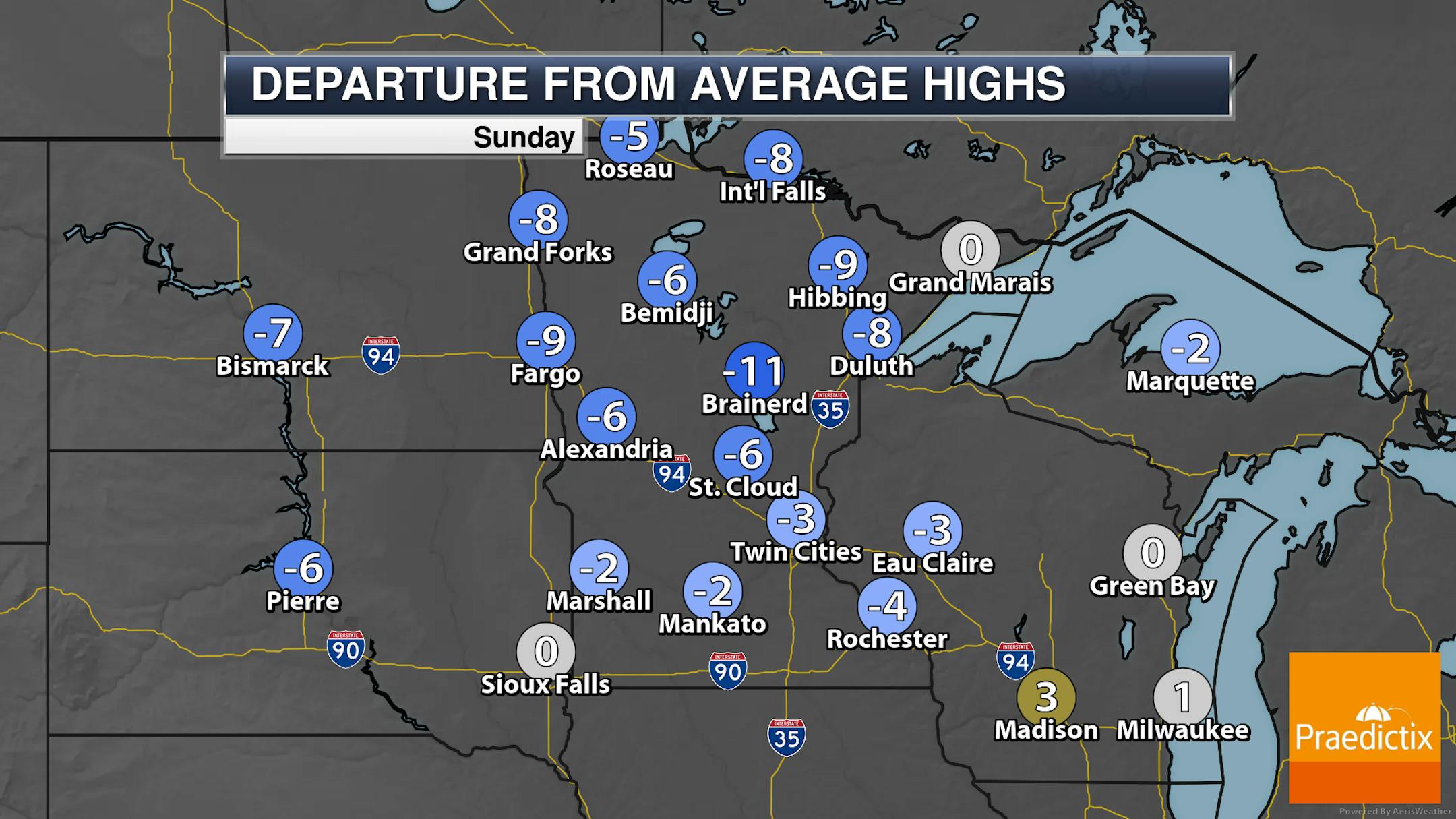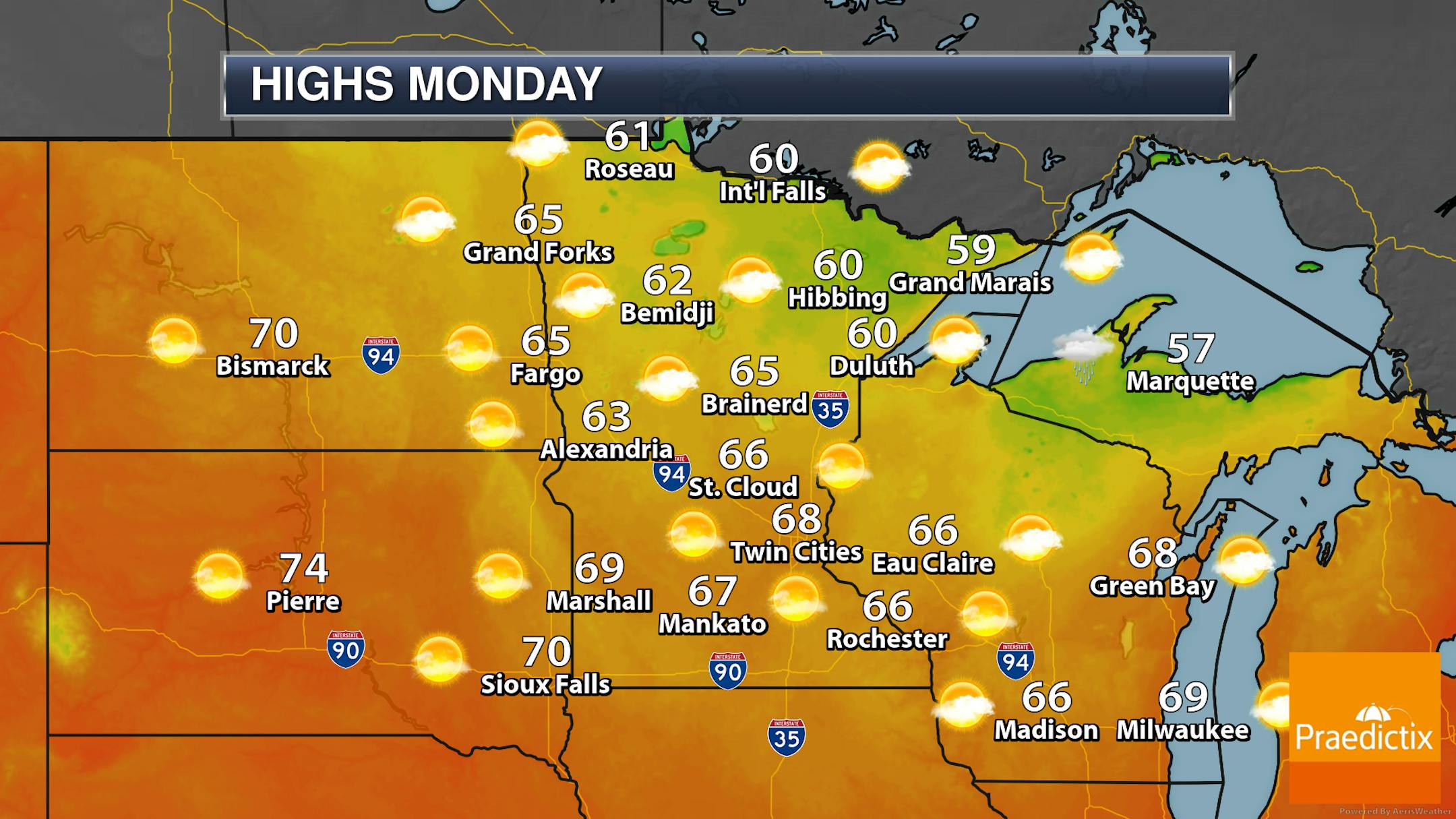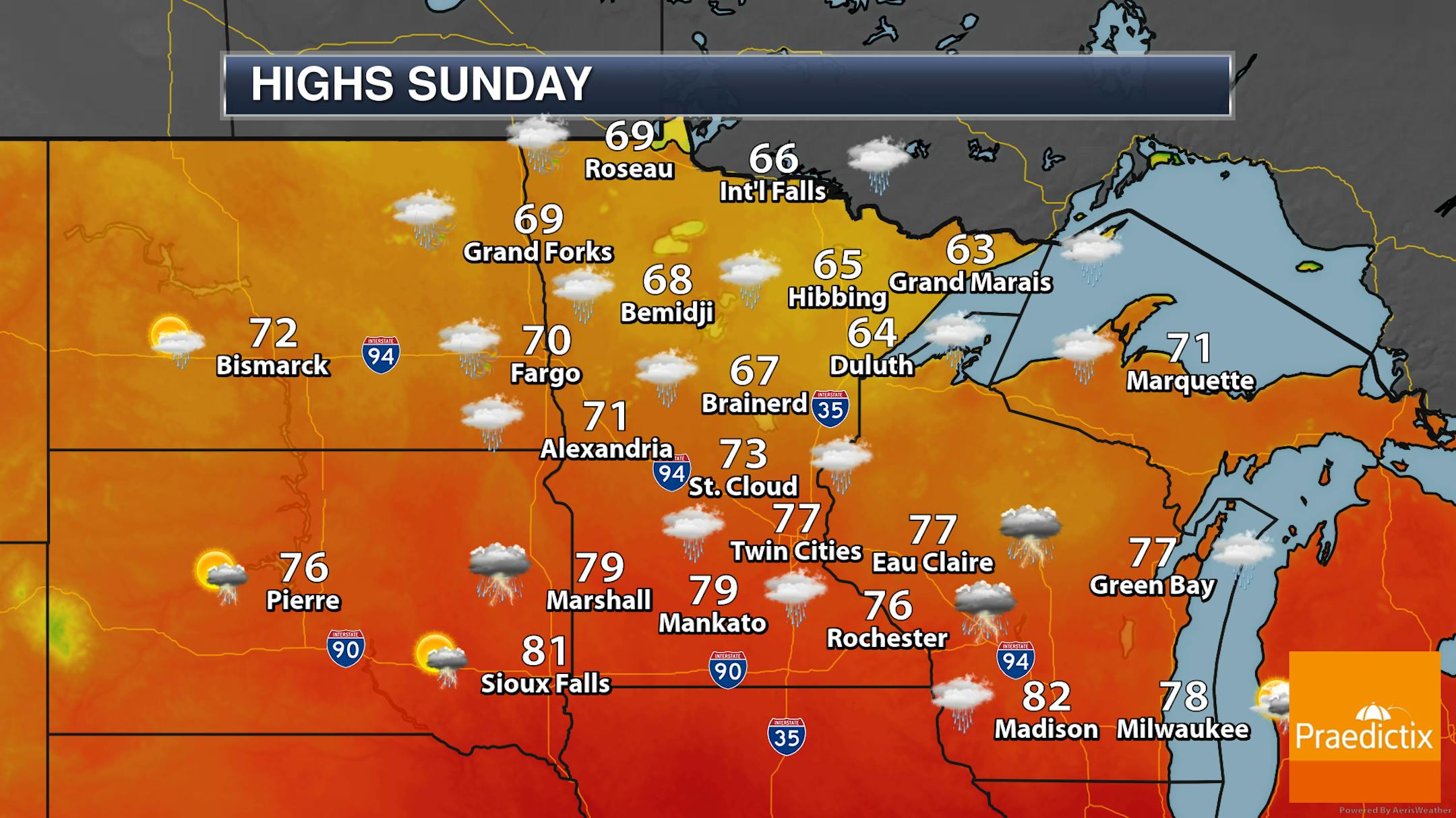 So we will see those rain chances throughout the day across the state. Highs will range from the 60s up north to the low 80s across southern Minnesota.