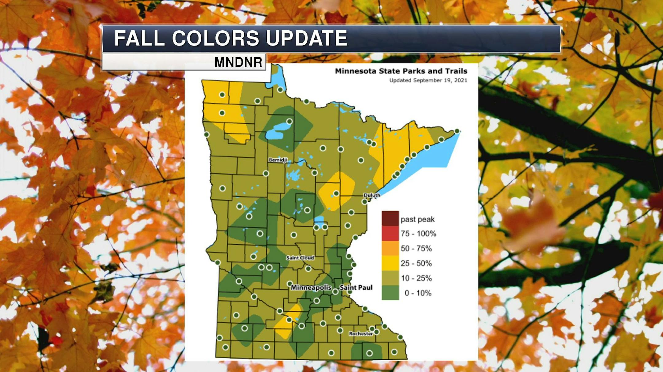 According to the MN DNR, much of the state is already experiencing minor changes in the fall color. Keep in mind that much of the summer was hot and dry, so some of the trees are a bit stressed and could be prematurely changing. With that being said, we are getting closer to that time of the year. See the latest update from the MN DNR HERE: