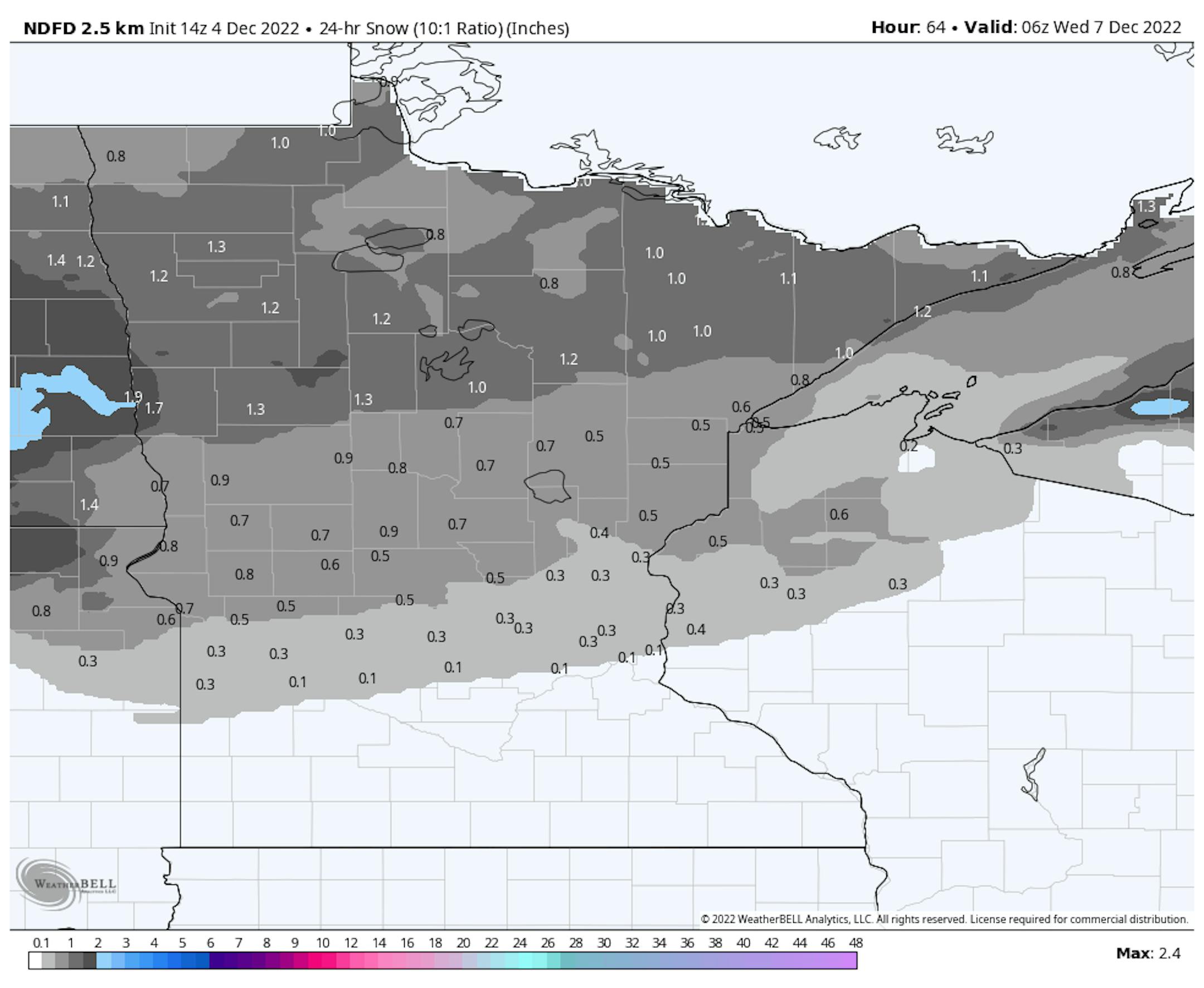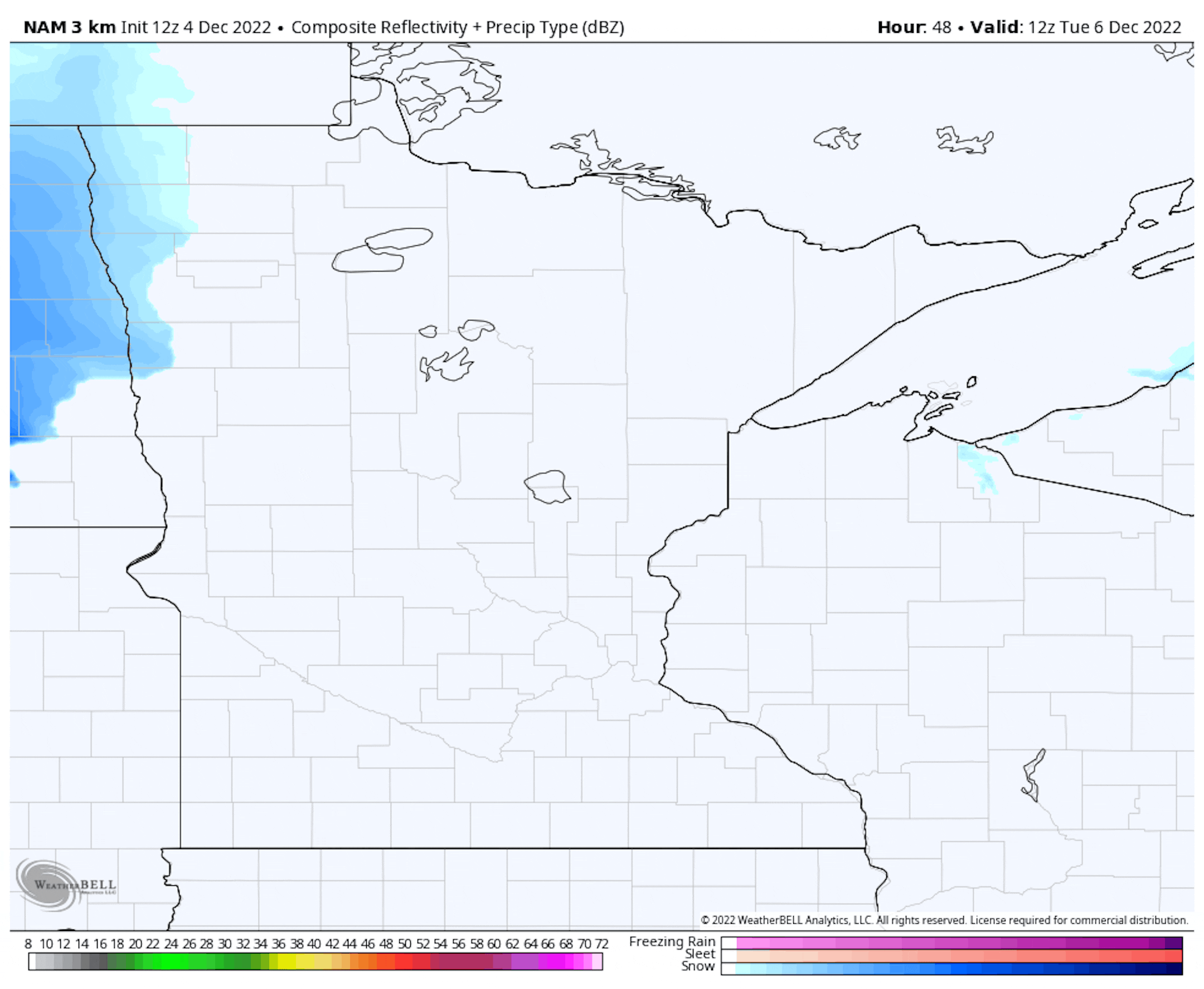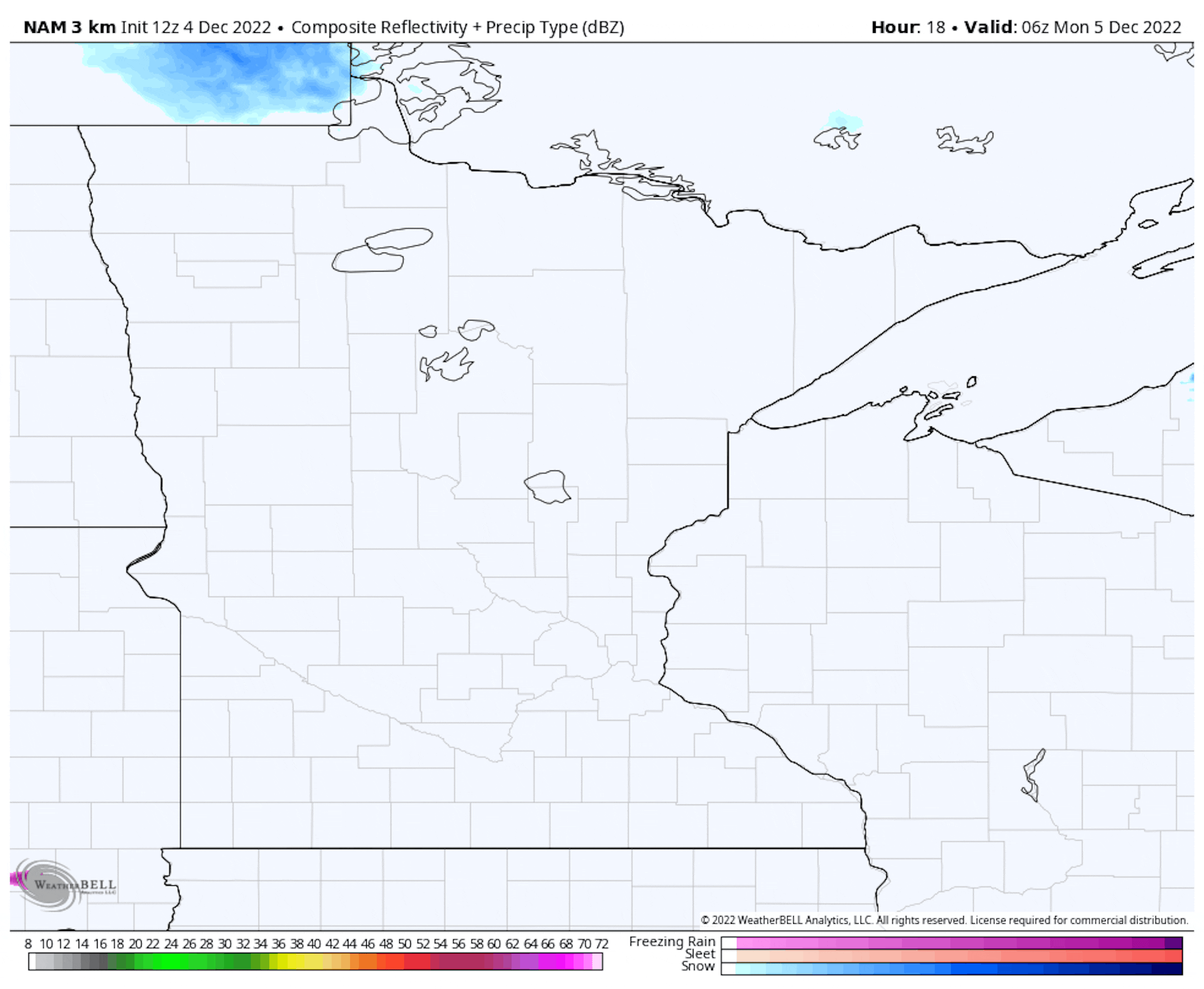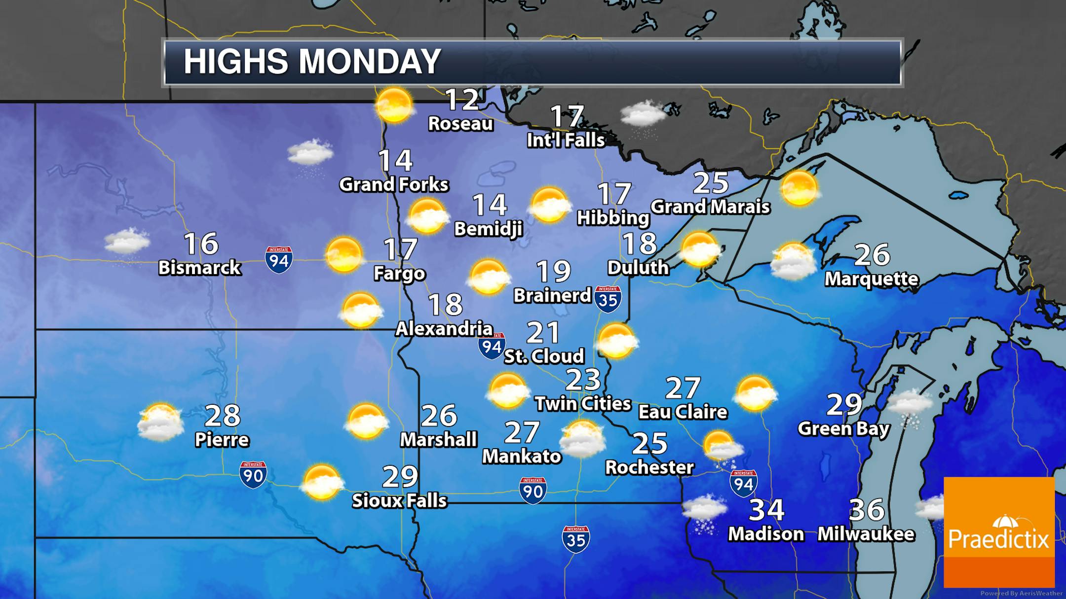 The first half of this week will be peppered by light snow and even some light freezing drizzle chances. The initial one moves through on Monday, with some morning light snow or freezing drizzle across southern Minnesota, mainly south of the metro. During this time, some light snow will also be possible up across northern Minnesota.
