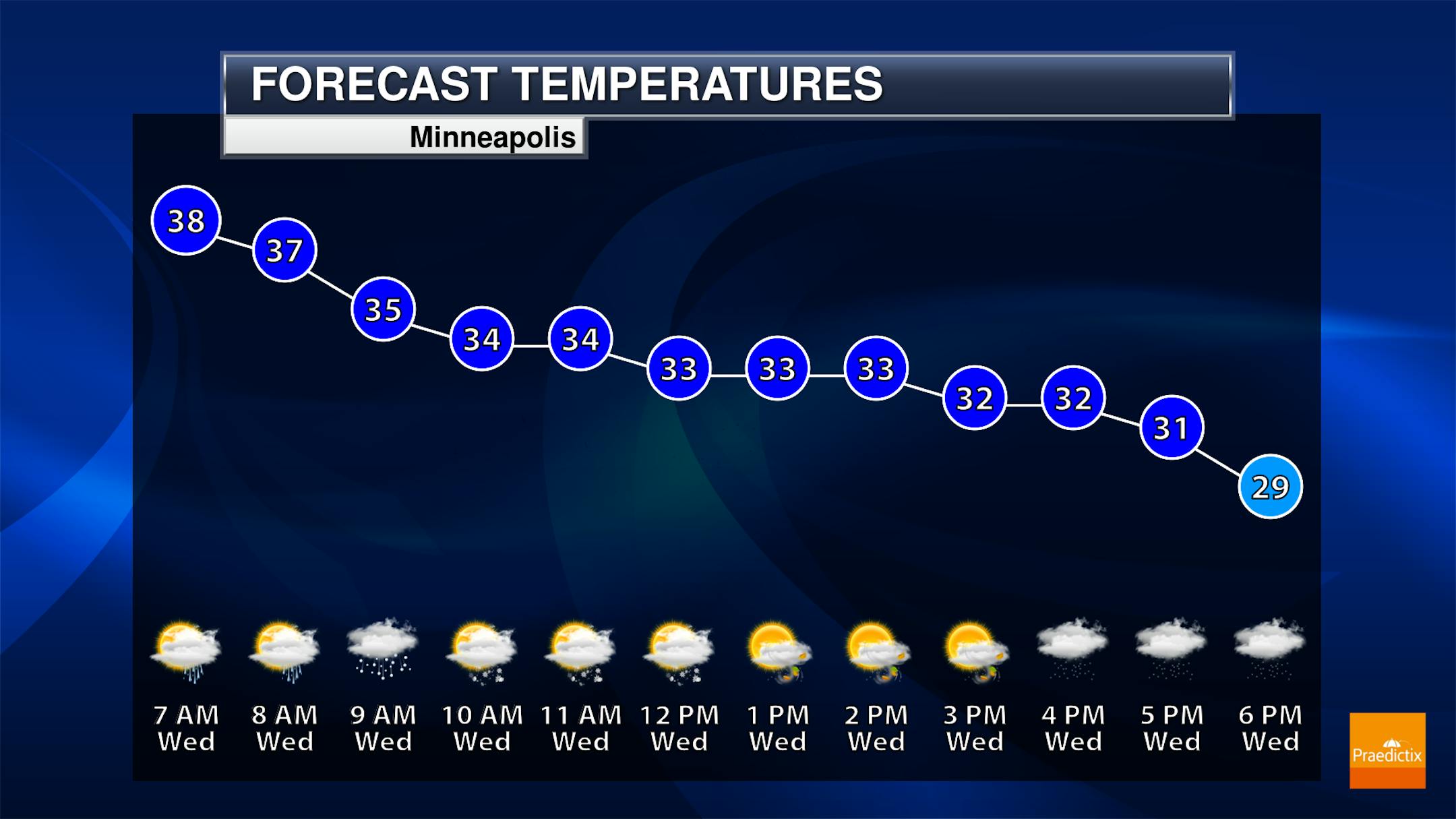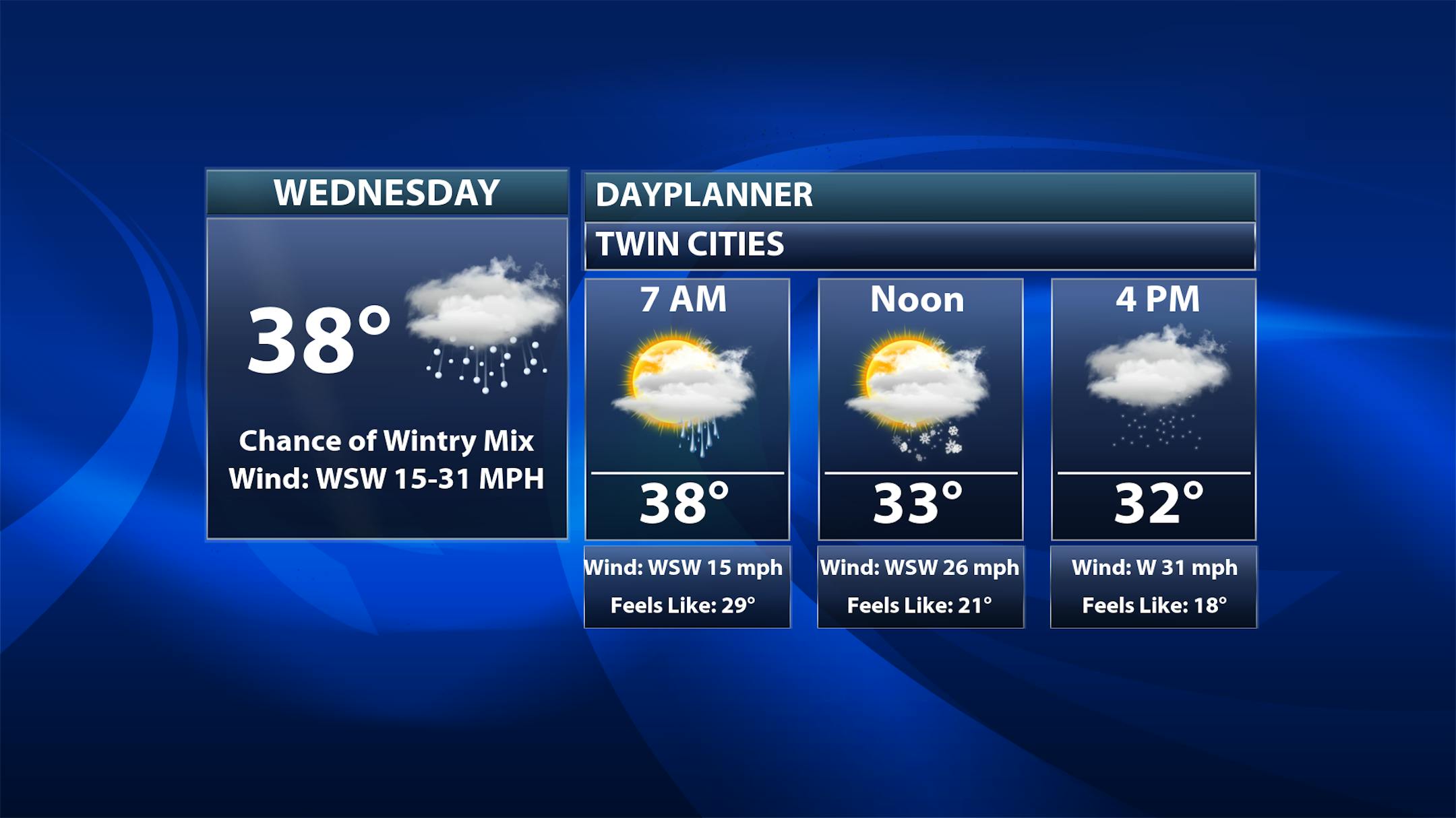 So taking a closer look at Wednesday in the metro, we will see windy weather with dropping temperatures. Any precipitation will start as some rain before tapering off as snow toward the midday hours.