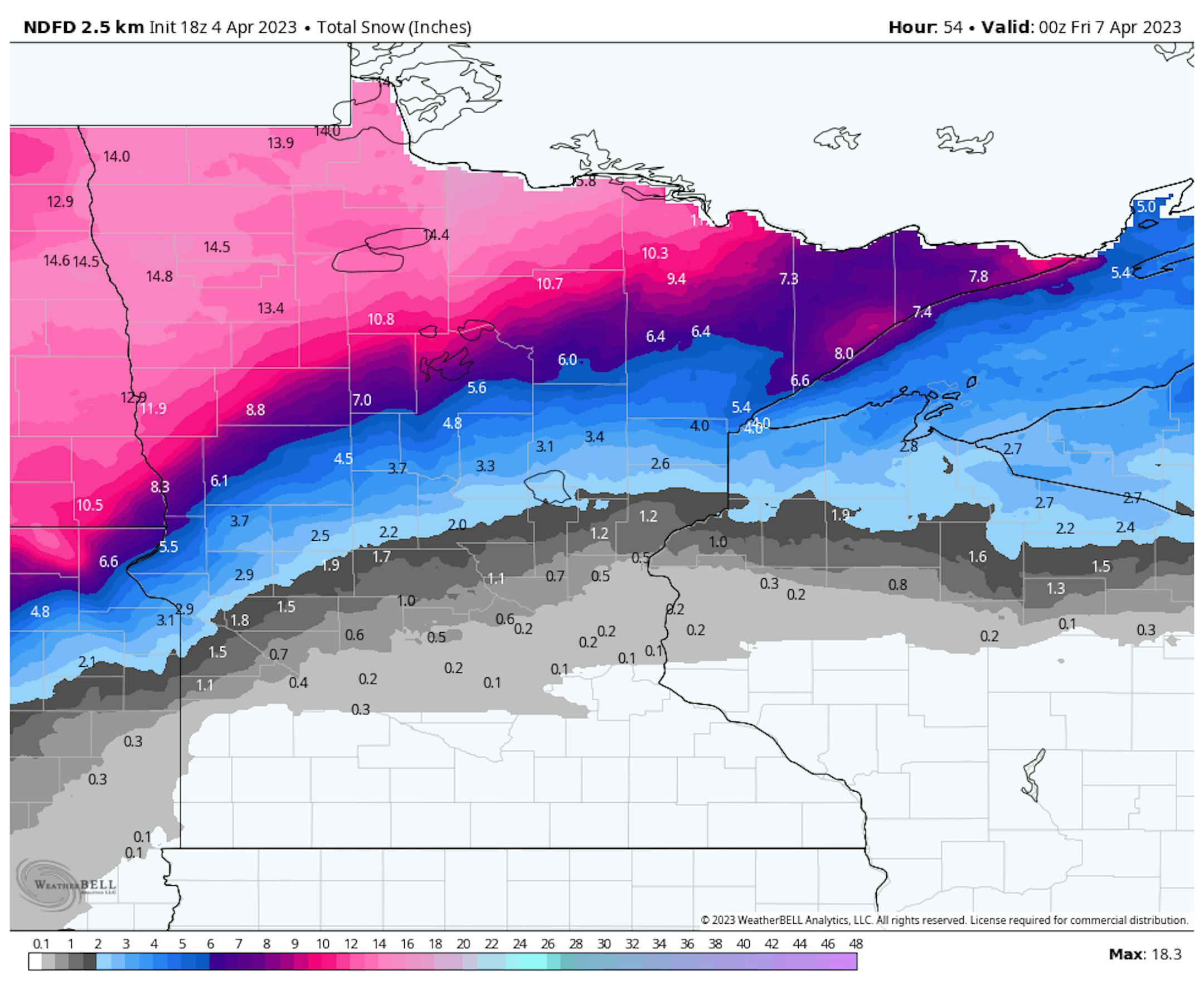 The heaviest snow will continue to fall across northern Minnesota, where a band of 6-15" of snow is expected to fall. With strong winds (shown below), blowing and drifting snow will continue to be a major concern where snow falls.