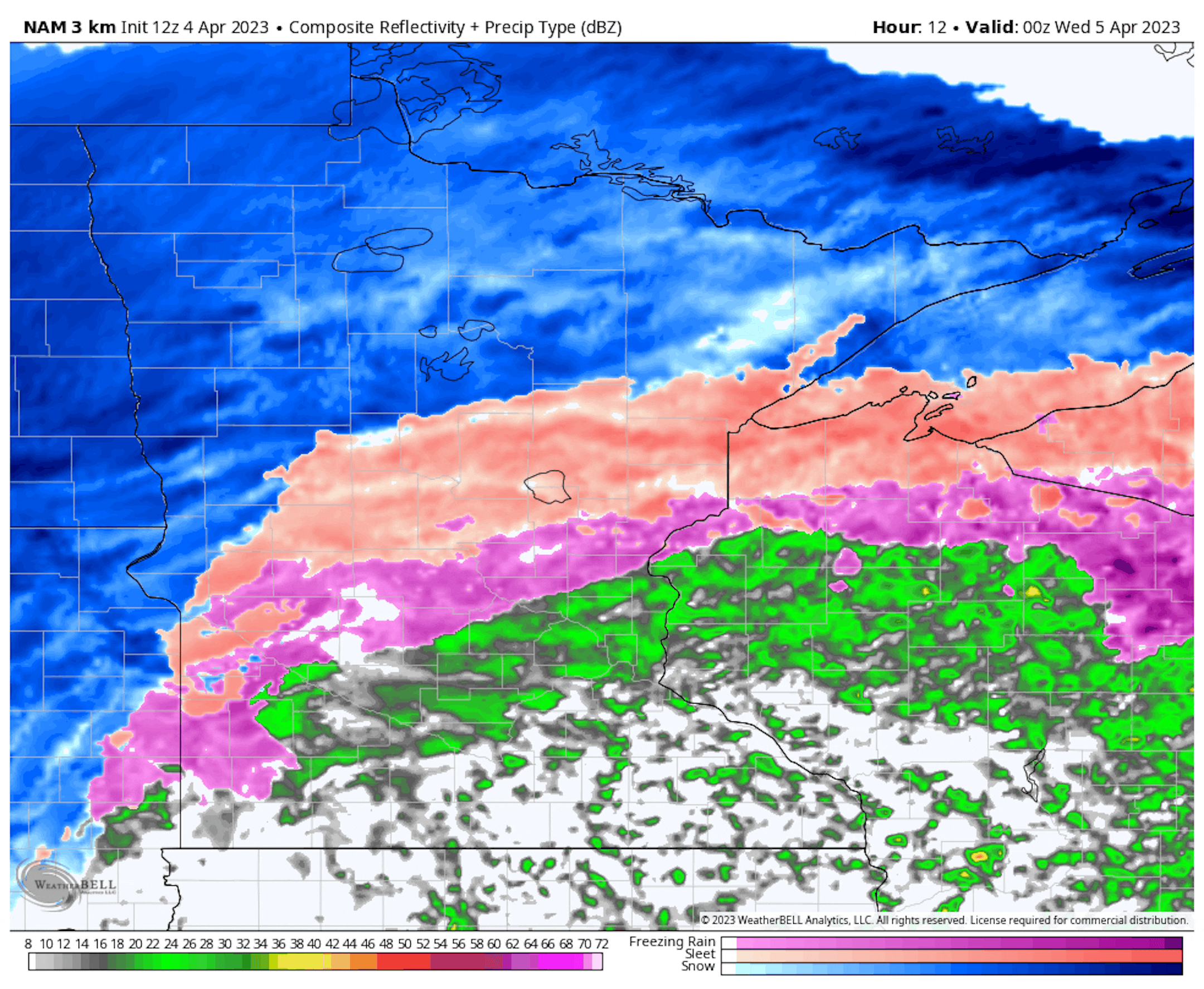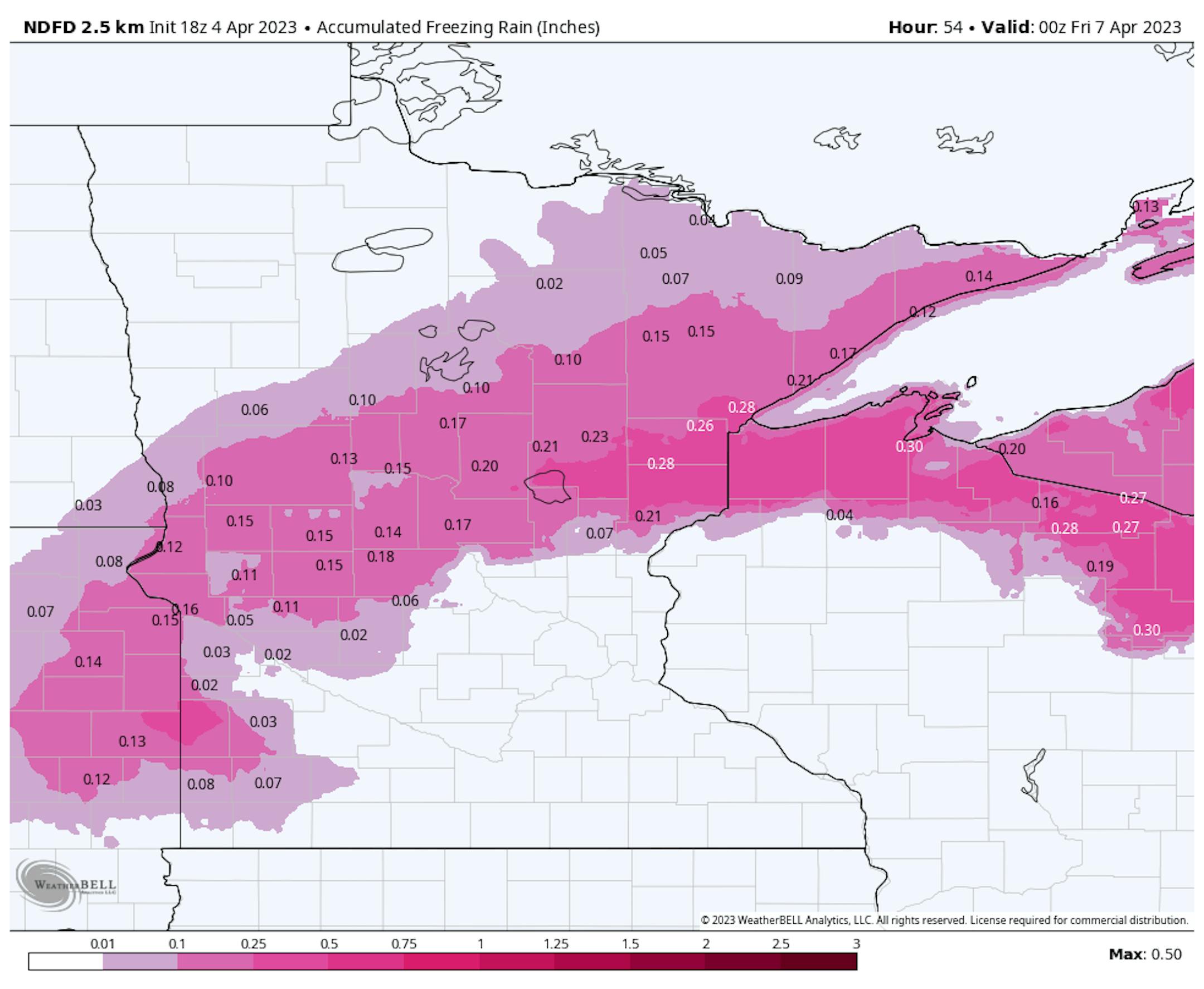 Meanwhile, this is total freezing rain expected through mainly Wednesday morning. A band of at least a tenth of an inch of ice is possible from eastern South Dakota to the North Shore, with the potential of a quarter inch or more possible near/around the Twin Ports and into northern Wisconsin.