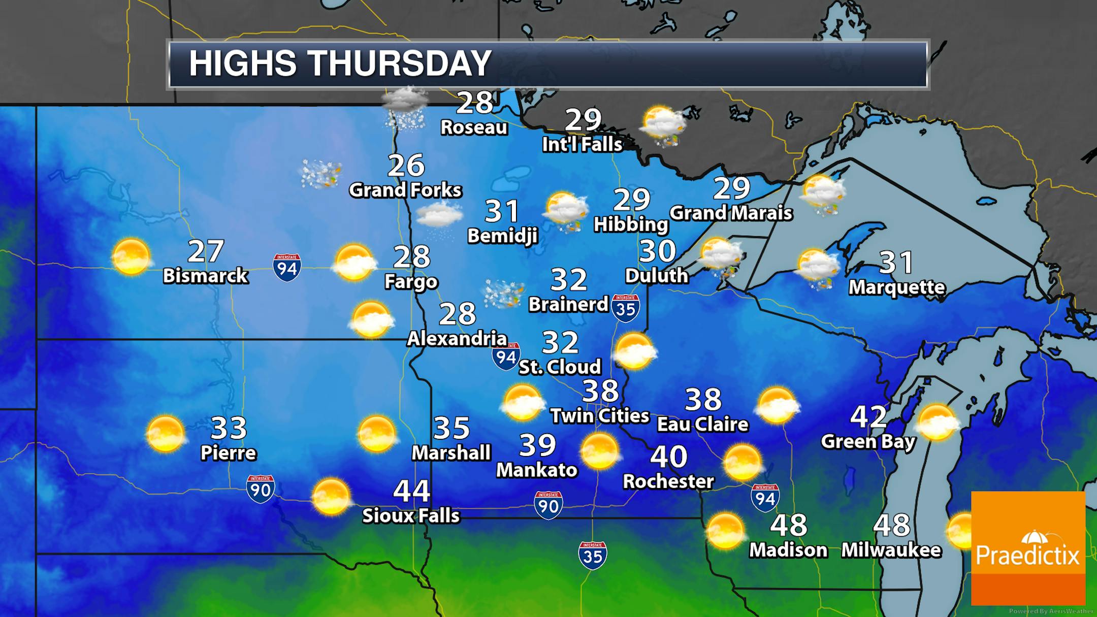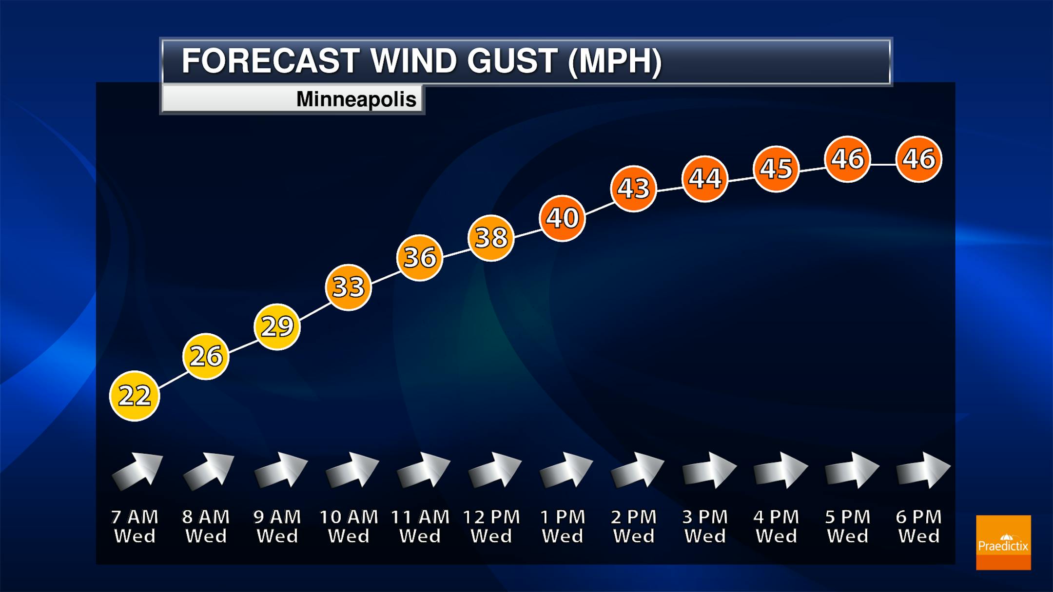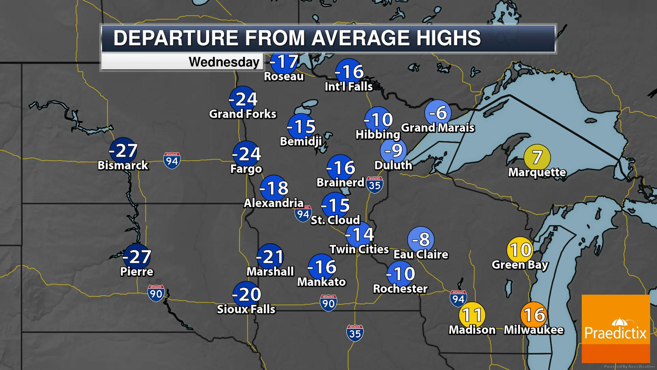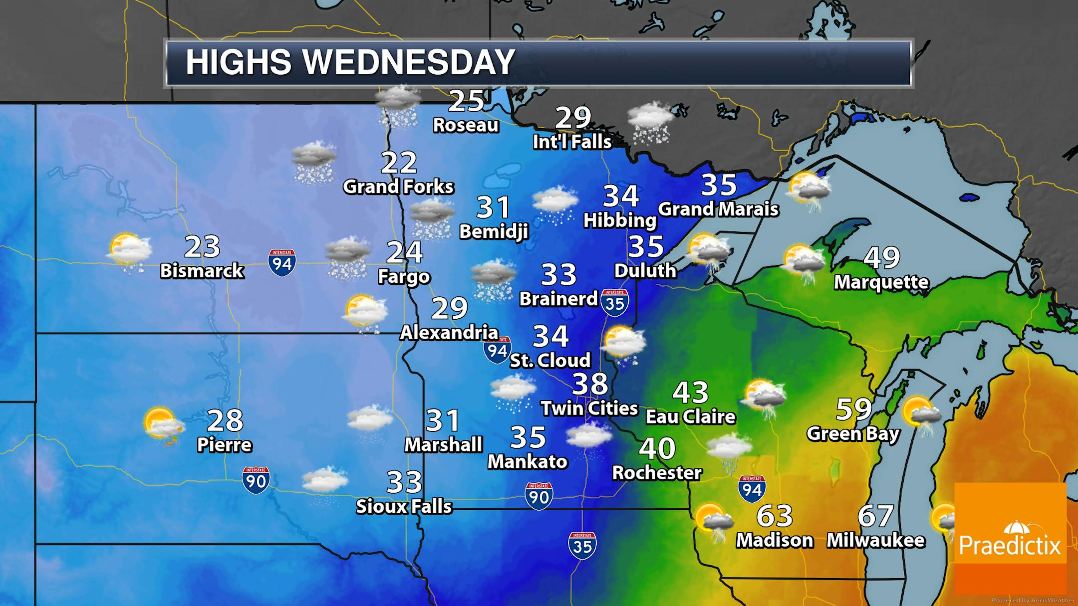 We also continue to watch strong winds across the region today into Wednesday. Some of the strongest winds Tuesday Night will be along the North Shore (50-60+ mph), with more widespread 40+ mph wind gusts across central and southern Minnesota on Wednesday. In areas where snow falls, this will lead to whiteout conditions. We will also watch the potential for power outages and other property damage (trees topping or limbs falling, etc).