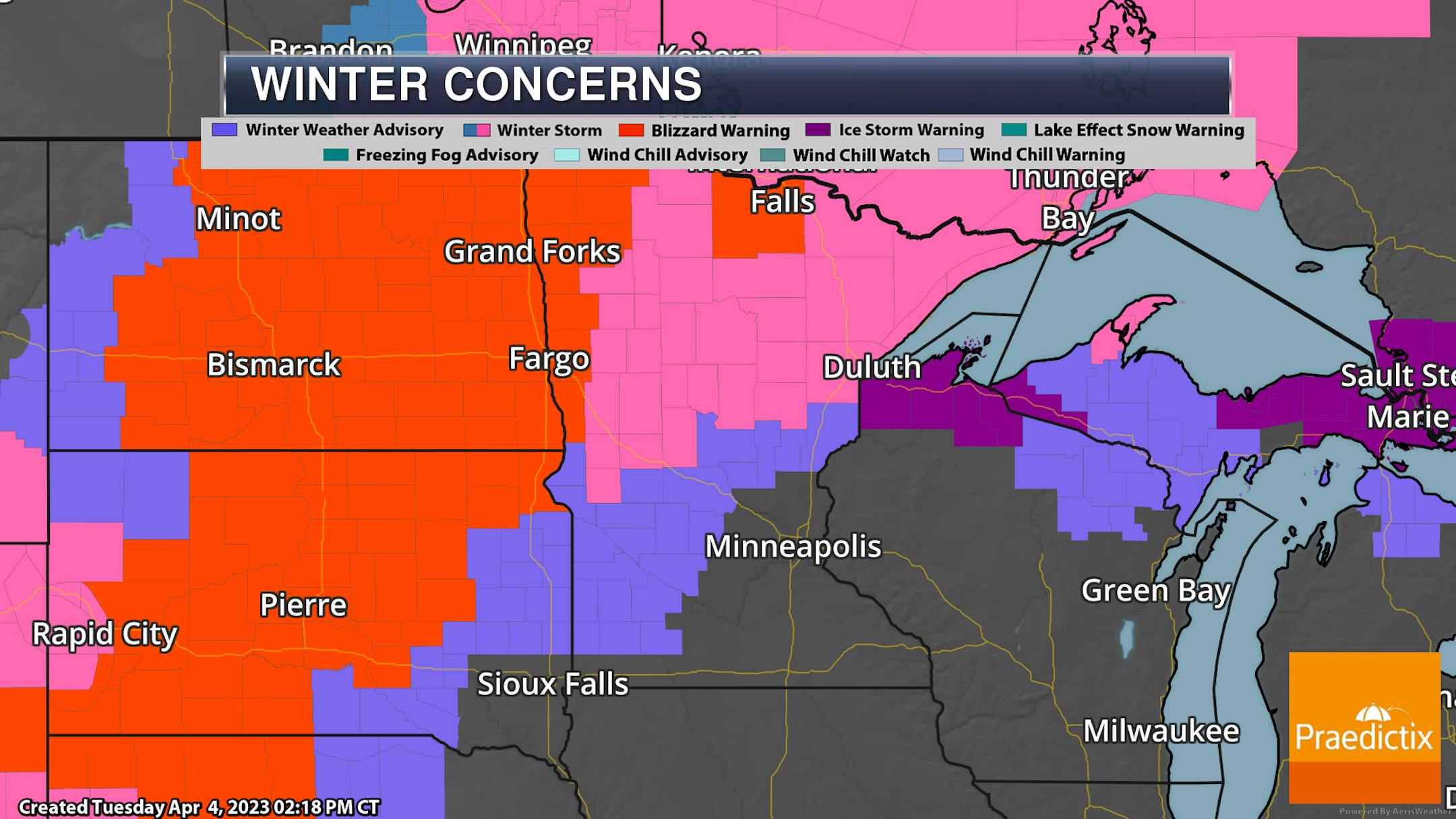 Blizzard Warnings are in place across western and northern Minnesota due to the expected strong winds and heavy snowfall leading to reduced visibility. Winter Storm Warnings are in place from Alexandria to Brainerd to the North Shore and northward to the Canadian border for 6"+ of snow (or a heavy mix of snow and ice) along with gusty winds. Winter Weather Advisories are in place from southwestern Minnesota to the St. Cloud and Hinckley areas for lower amounts of snow and/or ice.