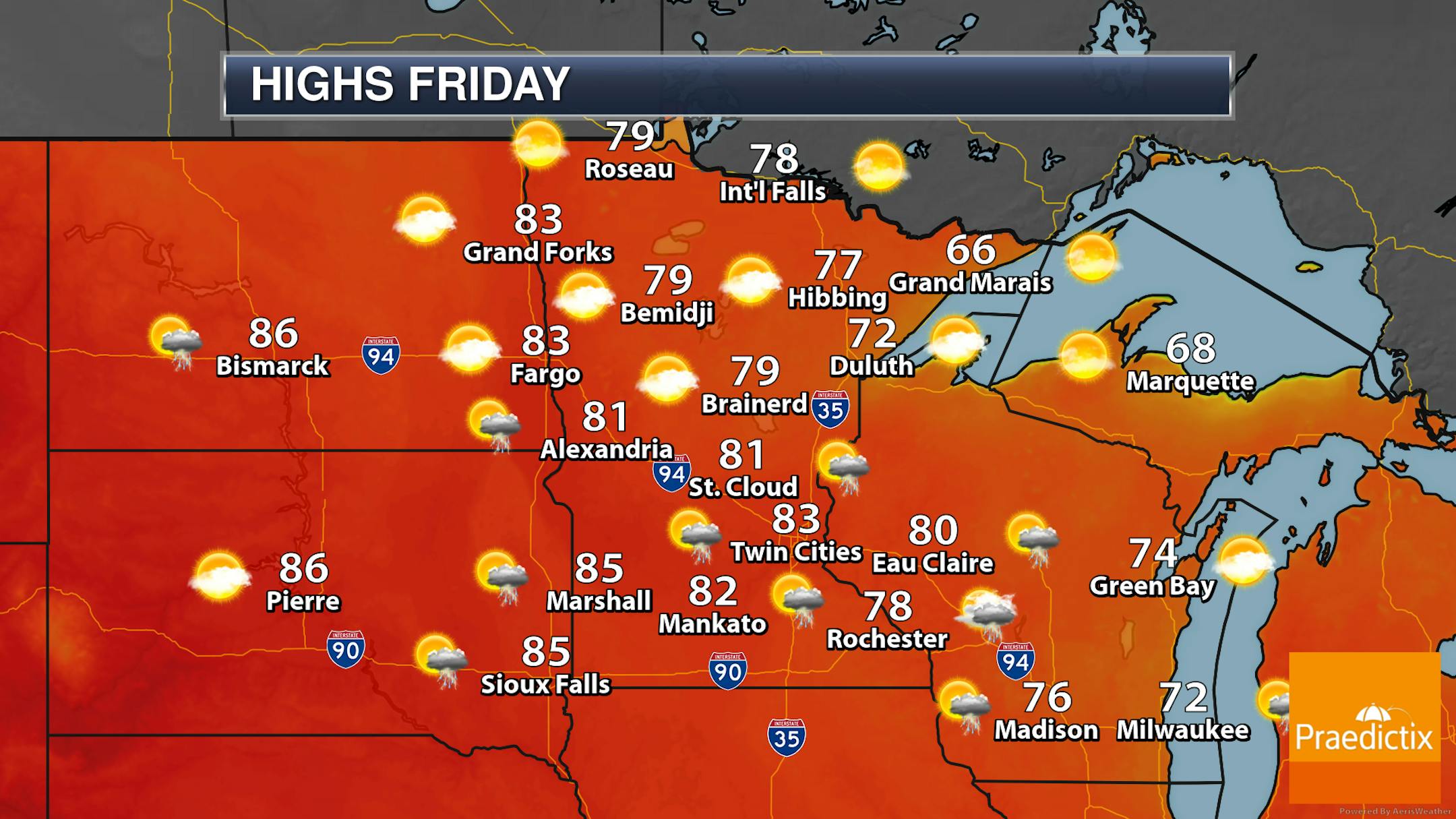 The best chance of those showers and storms at times throughout the day will be across central and southern Minnesota - particularly from St. Cloud southward. Highs will generally be around average across the entire state, from the 60s along parts of the North Shore to the 80s in southern and western Minnesota.