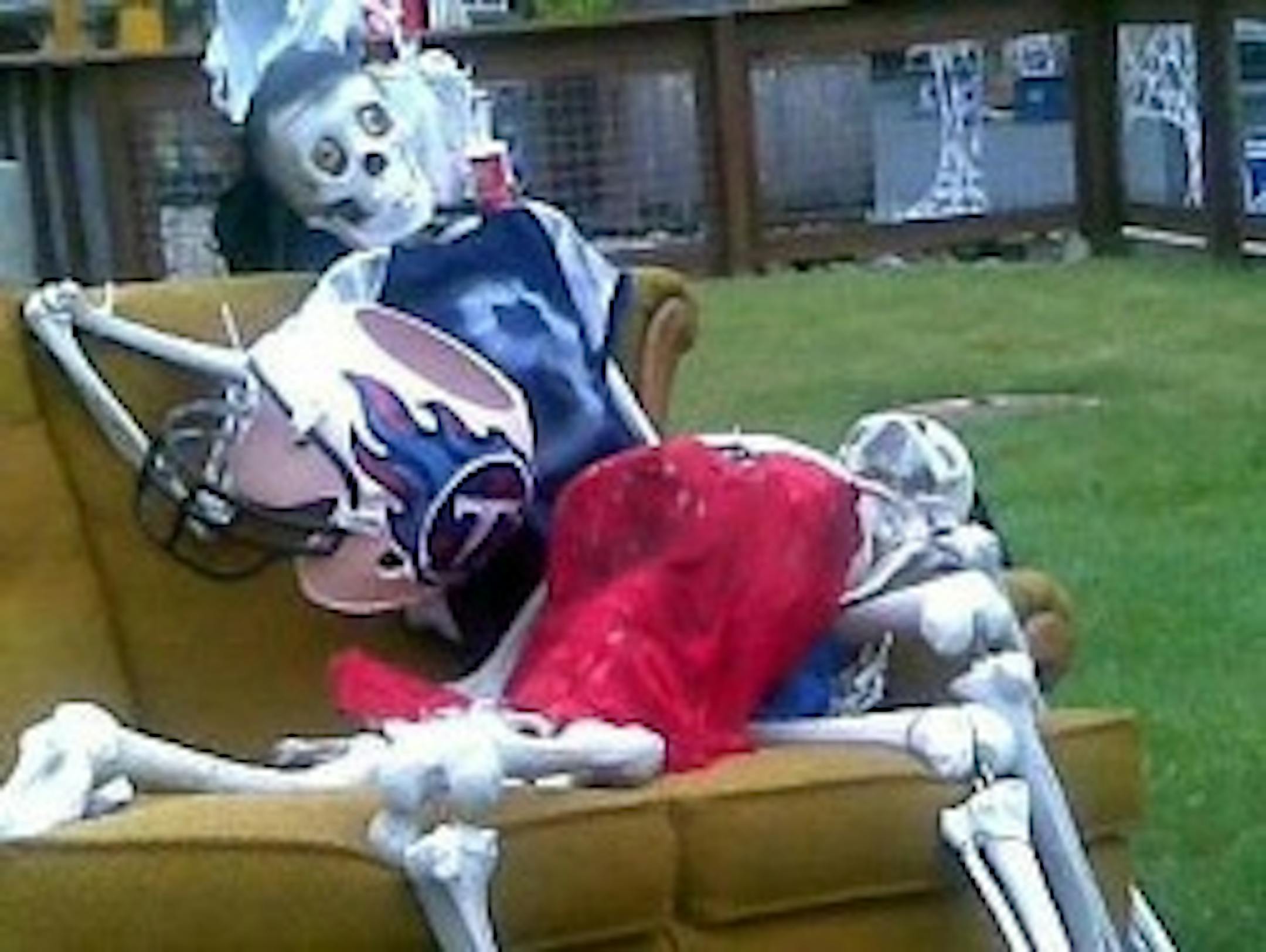 Nothing says Halloween like the fake skeleton of an NFL quarterback murdered by his mistress. At least that was the initial opinion of King's Island Amusement Park -- because, as part of their Halloween Haunt show, a skeleton depicting Steve McNair wearing a No. 9 jersey and holding a Titans helmet with the top blown off was on display, an apparent reference to the two bullet wounds McNair suffered on the night he died. As if that weren't enough, a skeleton depiction of Sahel Kazemi, McNair's 20-year old mistress who Nashville police have said murdered the football star in the early morning hours of July 4, 2009, lies across the McNair skeleton's lap, wearing a piece of slinky red lingerie.
