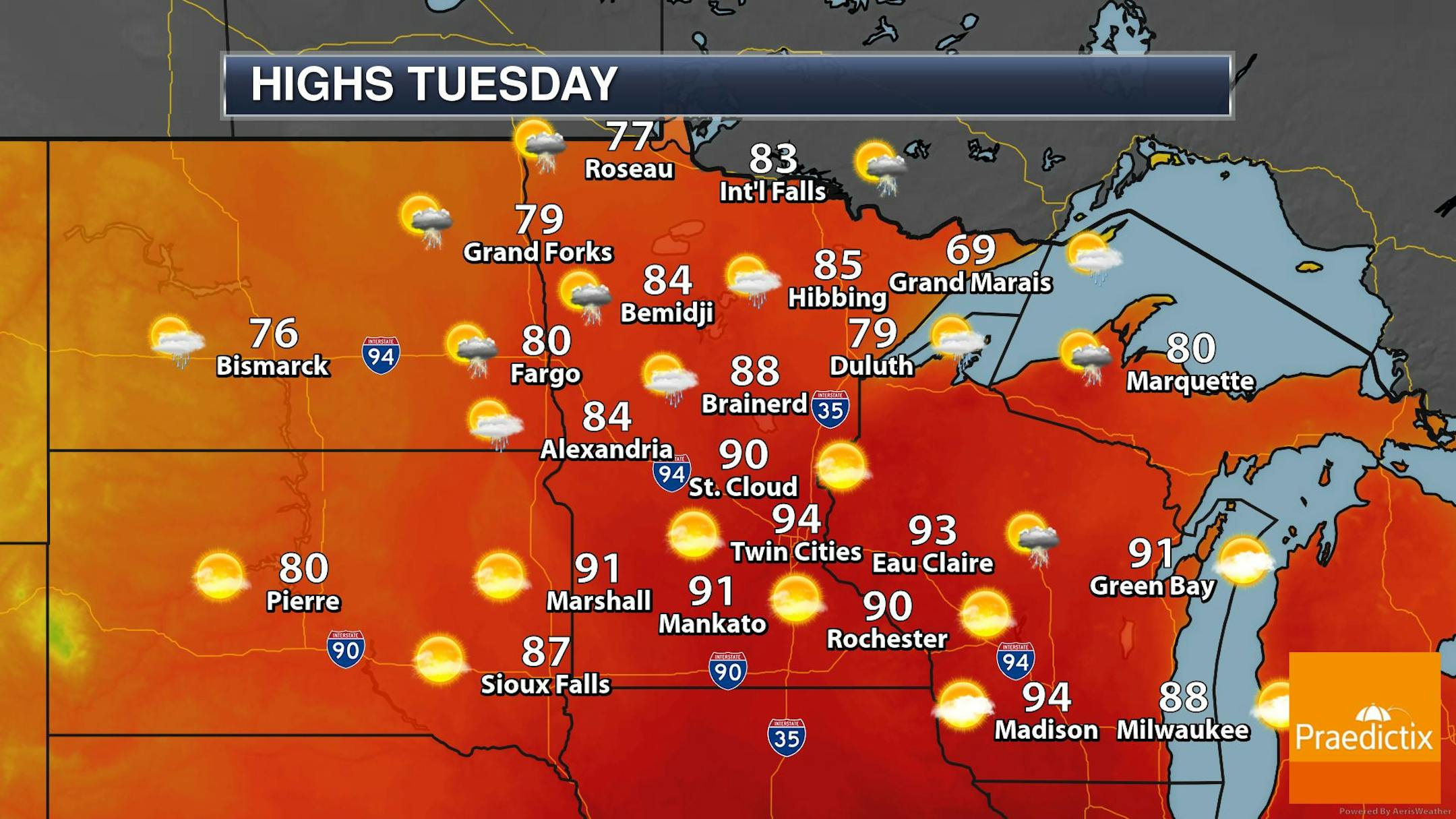 Here's a look highs around the region on Tuesday. Readings around the region will be well above average with highs warming into the 80s and 90s. The Twin Cities could warm into the mid 90s, which will be near +15F above average and potentially the warmest day of the year.