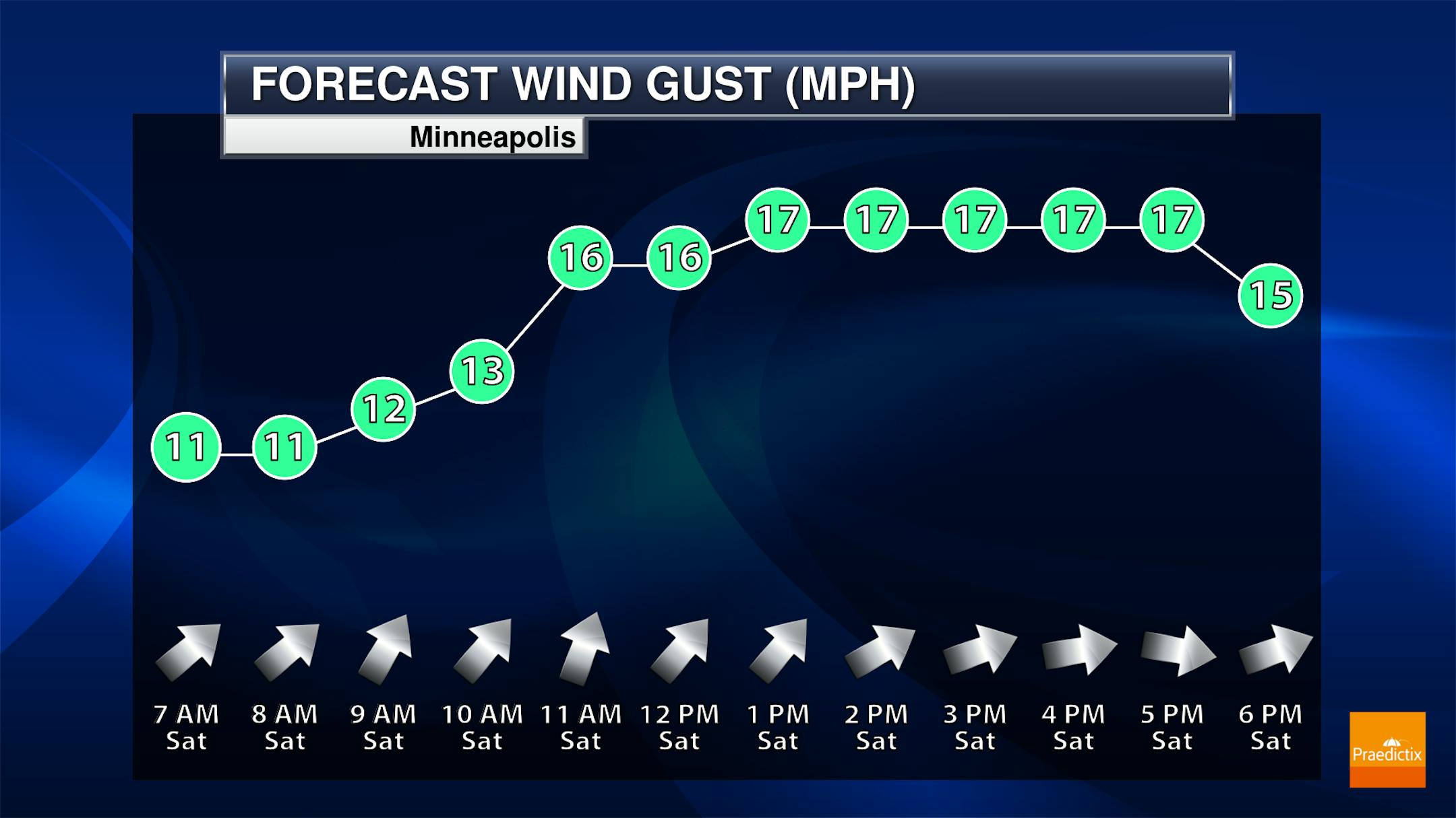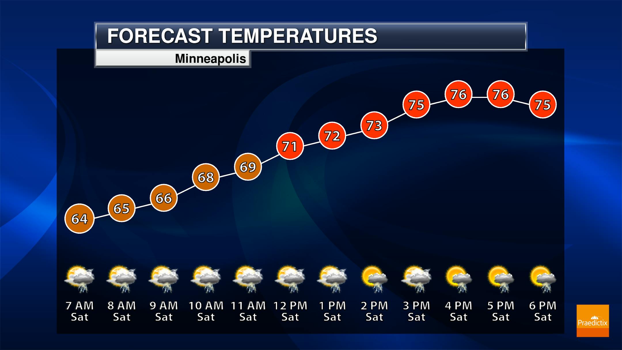 The hourly temps for Minneapolis on Saturday shows temperatures starting in the mid 60s in the morning and warming into the mid/upper 70s by the afternoon. Showers and a few rumbles of thunder will be likely in the morning with an isolated t-storm in the afternoon. West to Southwesterly winds will gust close to 15mph during the day.