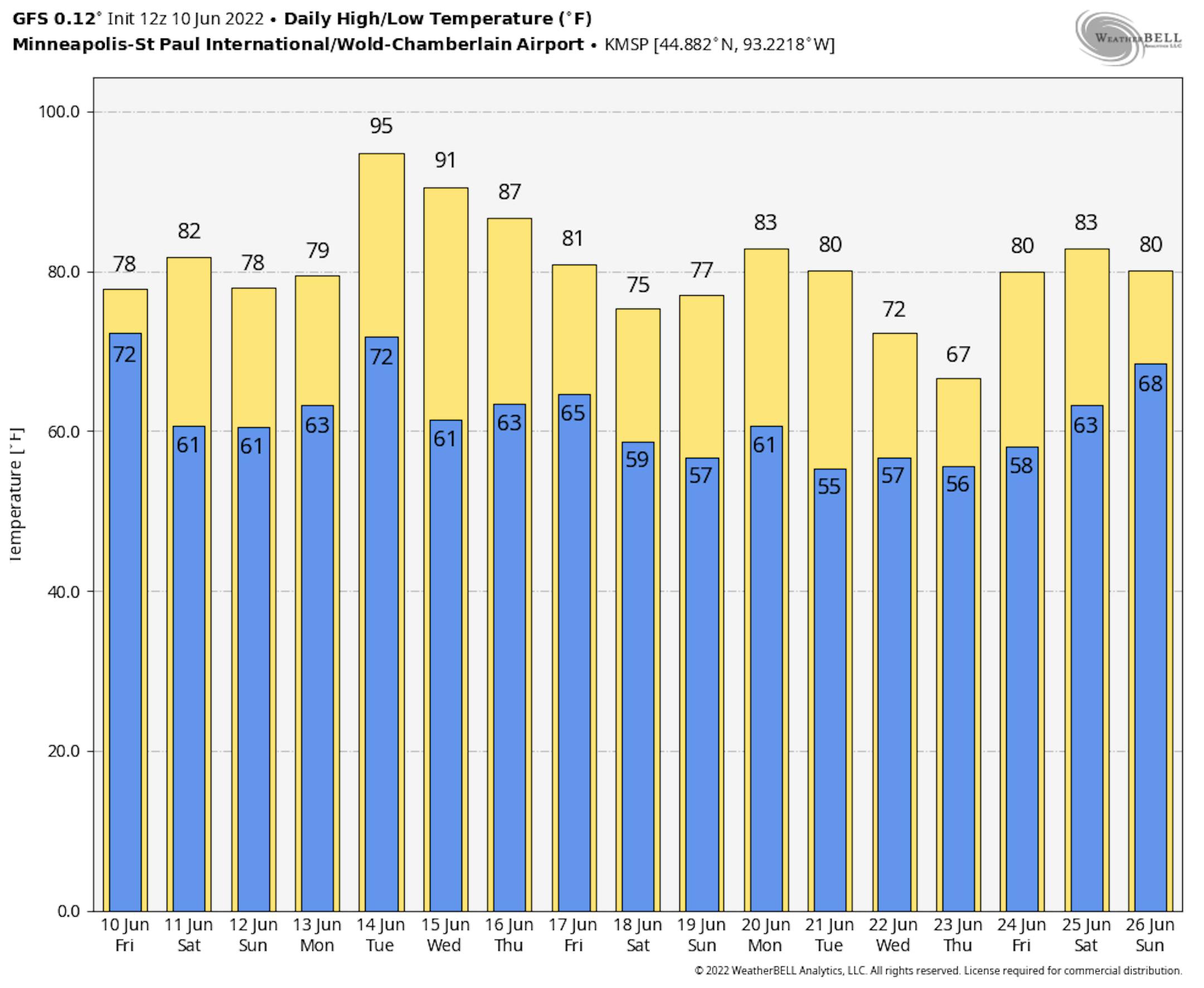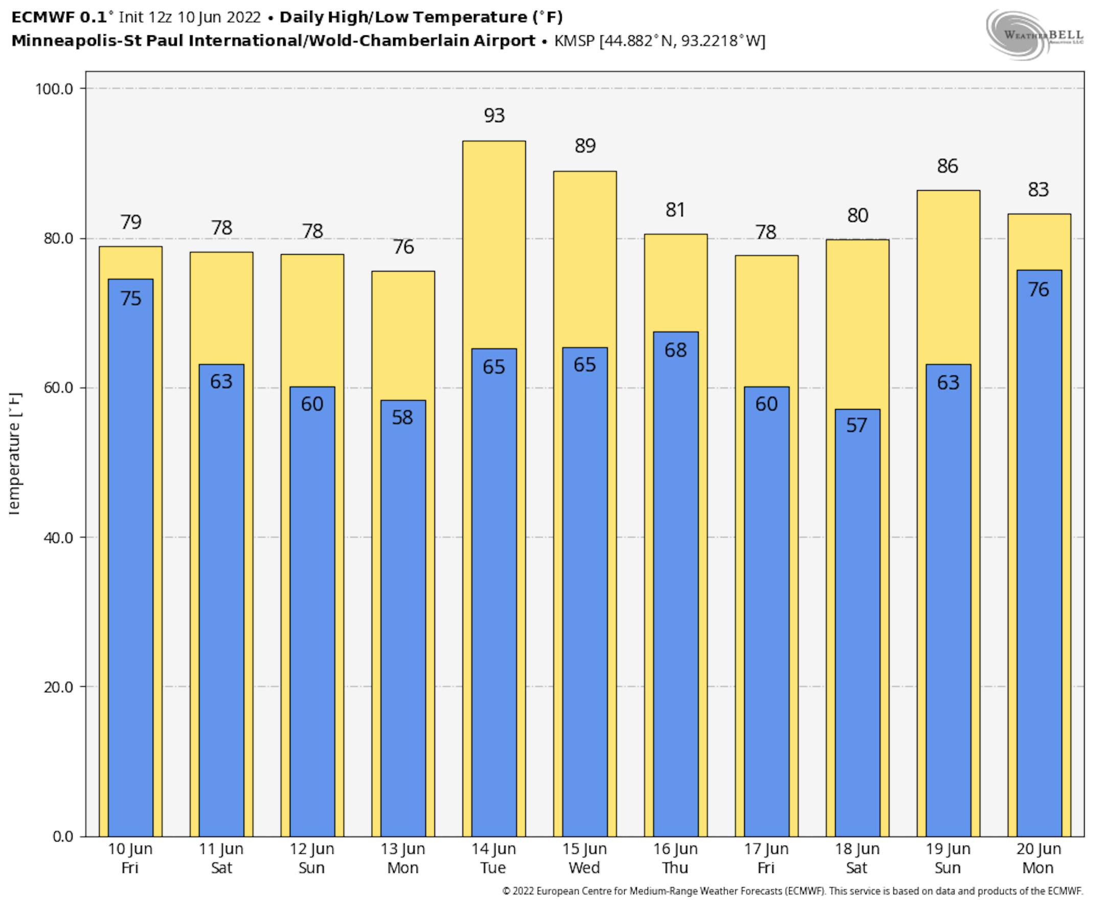 Here are the top 10 warmest days of 2022 so far in Minneapolis. Note that we've only hit 90F or warmer twice. 92F was the warmest day, which was on May 12th. The forecast on Tuesday if 94F, if it holds it will be the warmest day of the year so far. Last year, there 12 days in June that warmed into the 90s.