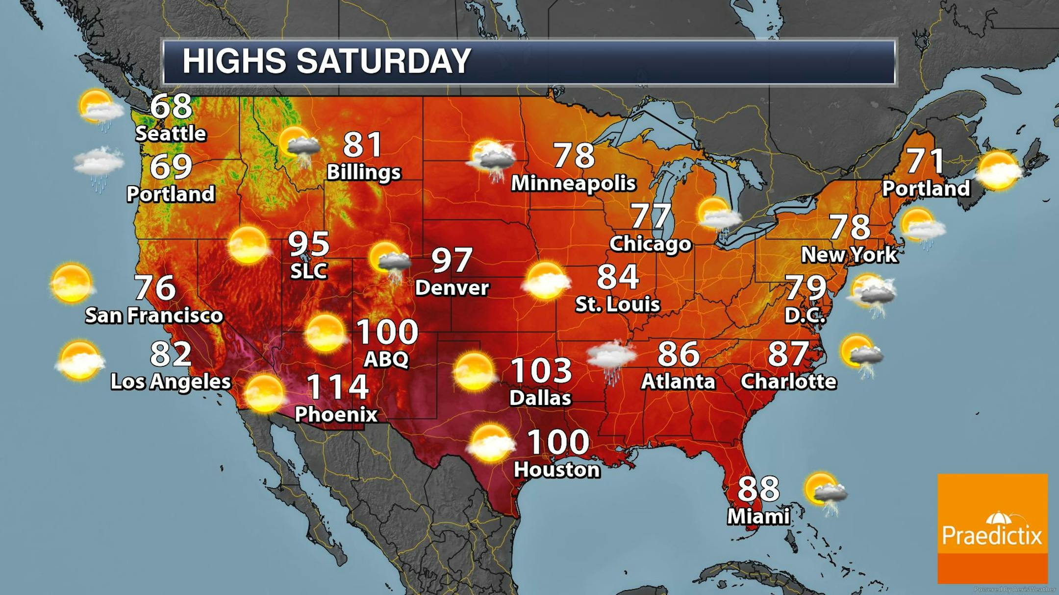 The weather outlook for Minneapolis on Saturday shows high temps warming into the mid/upper 70s with chances of showers and thunderstorms. Most of the rain will fall through the first half of the day with spotty afternoon t-showers possible.