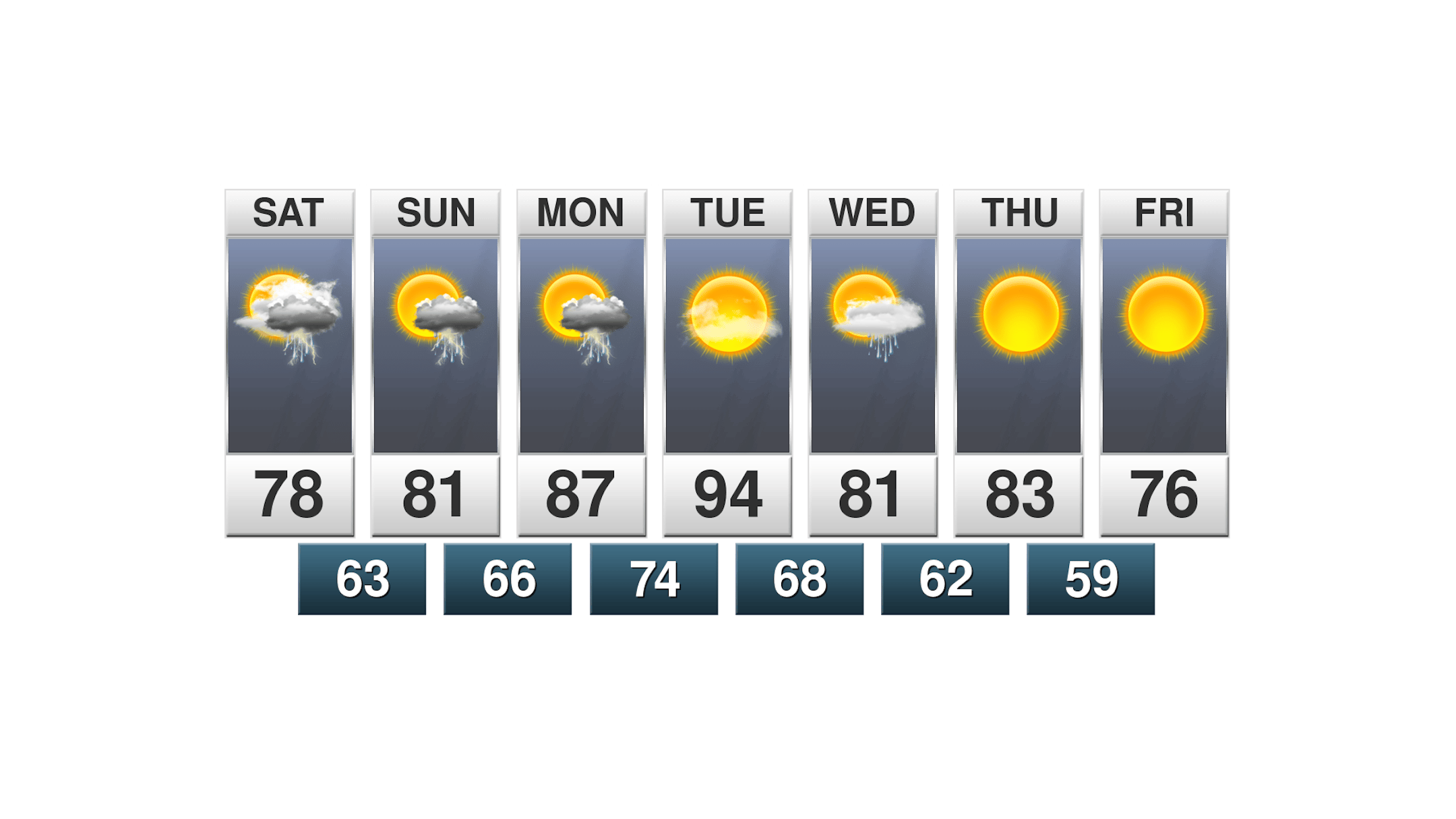 Here's the weather outlook from AM Saturday to PM Sunday. It appears that our Saturday will start on somewhat of a soggy note with showers and storms sliding southeast through the region. There could be a few isolated t-showers in the afternoon on Saturday, but most locations will stay dry during the afternoon. Sunday afternoon could also feature a few isolated PM t-showers.