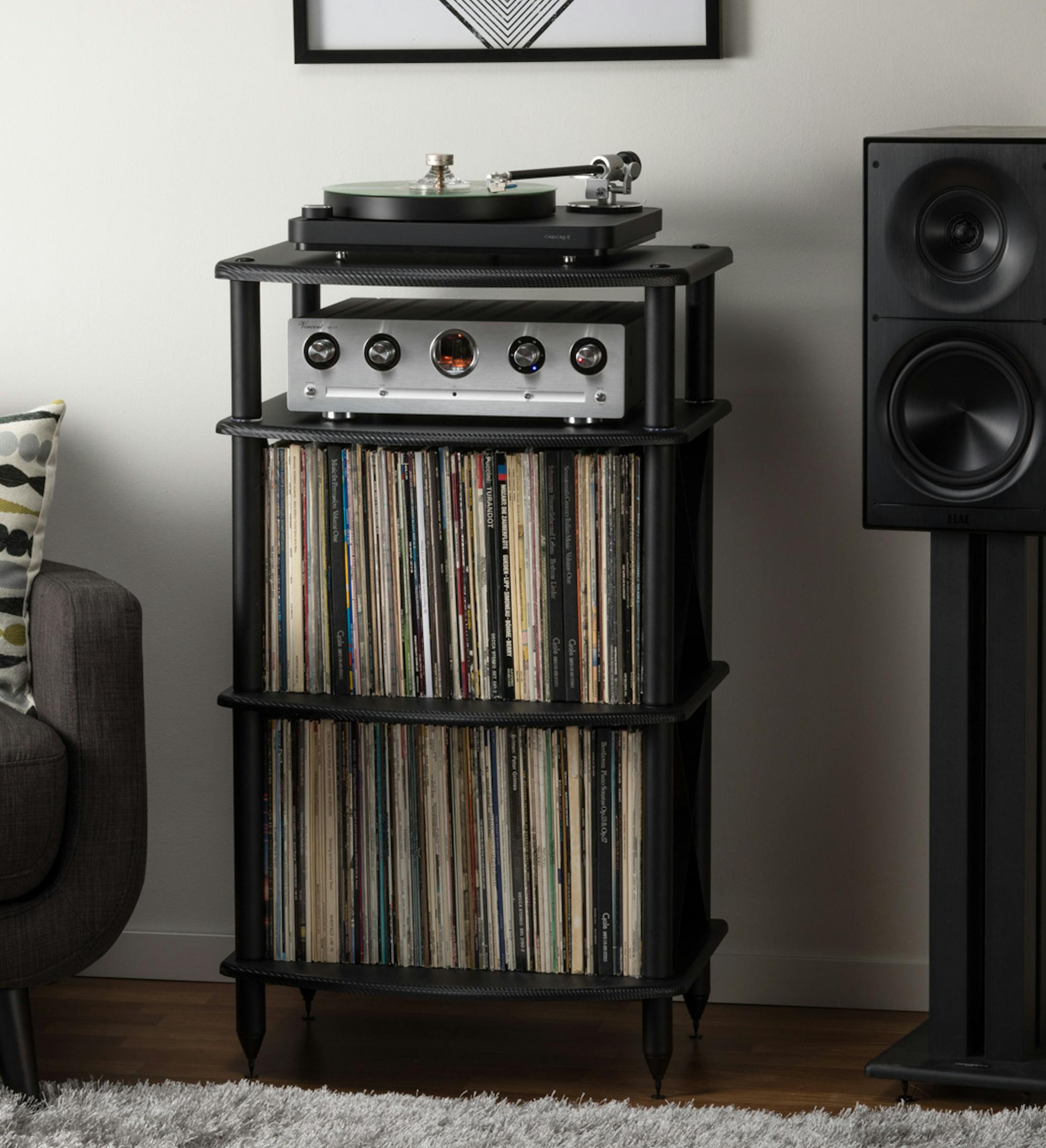 The second product is the Vulcan TTx2 Turntable Stand. It not only provides a sturdy, vibration-free platform for your turntable, but has storage for more than 200 records. It is available in black for $169.90, or carbon fiber vinyl or rosenut for $199.90. Proper audio furniture and media storage can be very expensive, and the Vulcan TTx2 gets you both at a bargain price. It is selling extremely well and frequently on back order, so if you want one, don't wait too long.