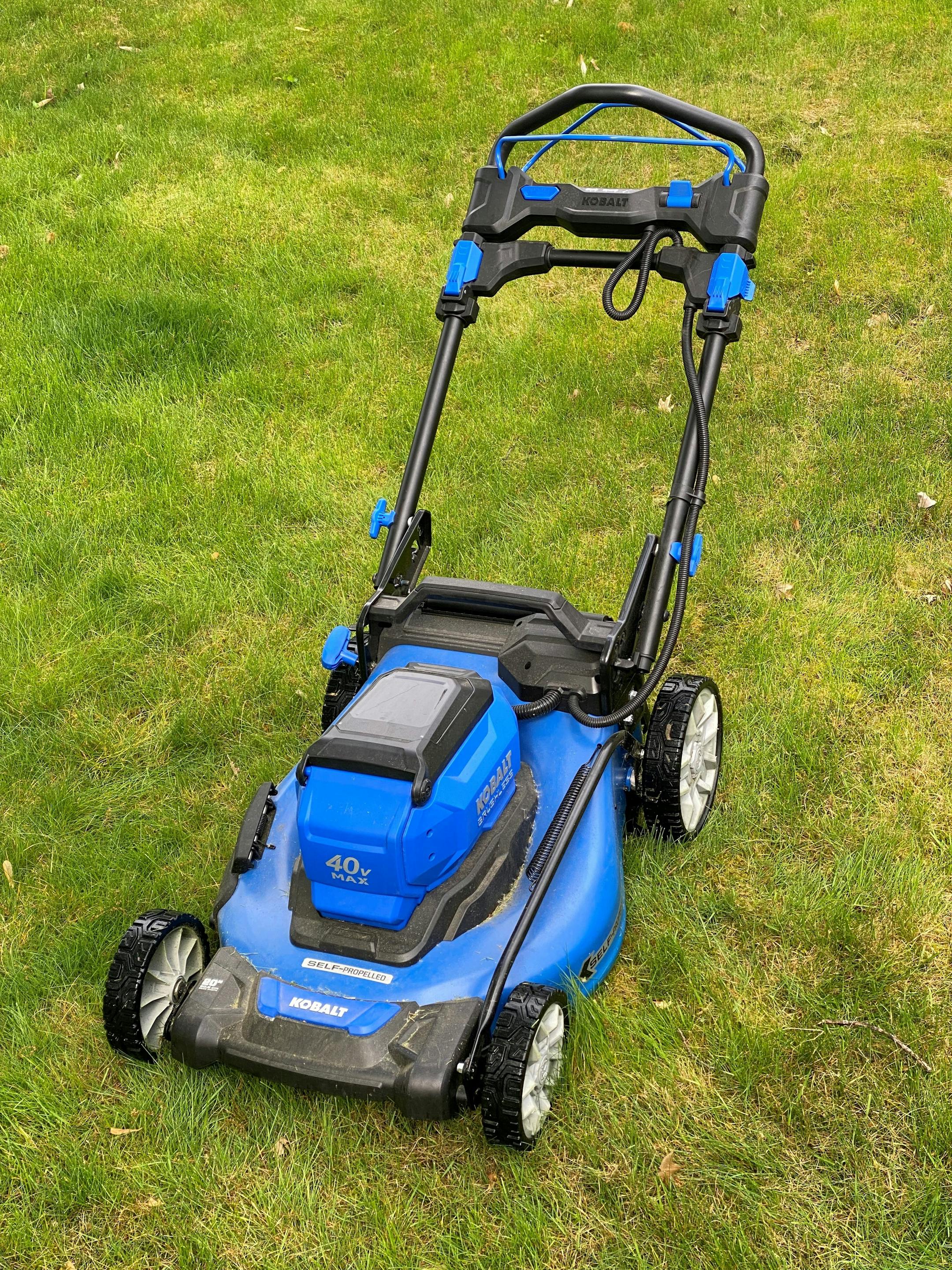 I decided to try cutting the whole yard with the self-propelled electric to see if I could satisfactorily ditch both gas mowers. The self-propelled Kobalt works much like the basic version, but using propulsion drains the battery more rapidly, so I recommend using it only when going uphill. (It is easy to push on flat ground.)