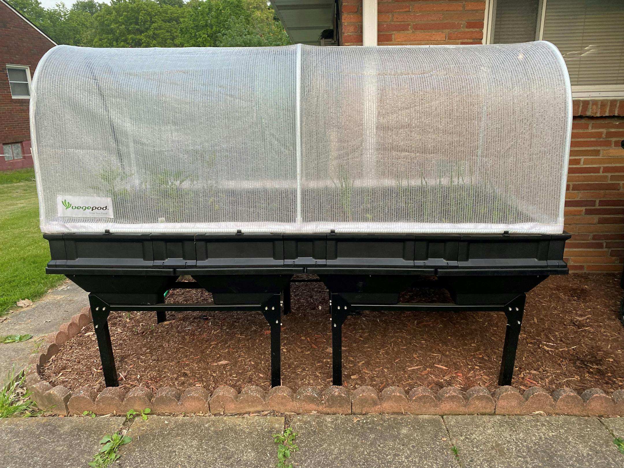 I learned of the Vegepod at a home show and realized it would solve my problem. It is a raised bed planter with water wells in the bottom, a cover and an integrated sprinkler system that connects to a hose. I bought the large Vegepod with stand for $749 from Home Depot. Assembling it was somewhat difficult and took several hours, but I finally got it put together.