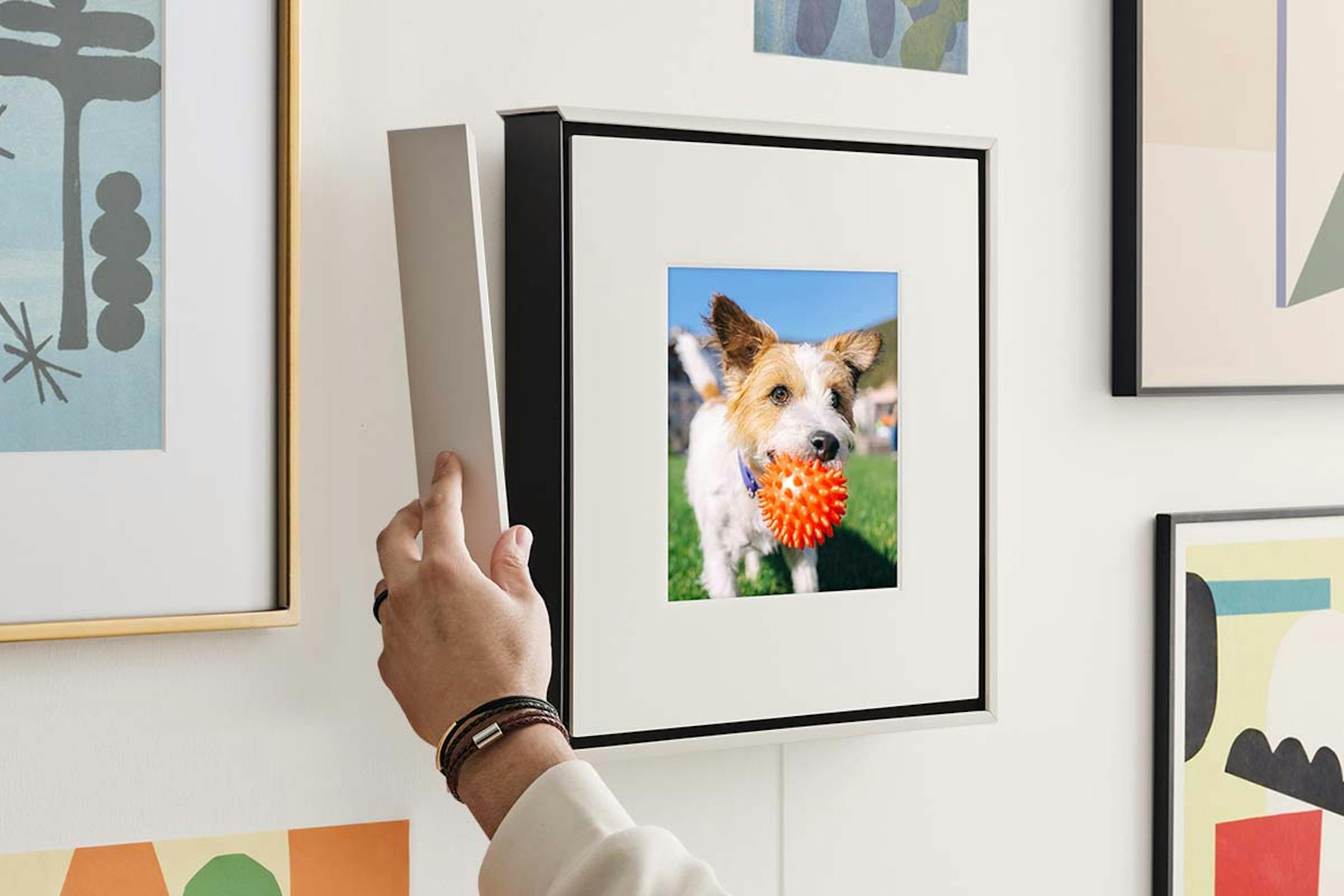 Samsung’s Music Frame Smart Speaker is a box frame about the size of a vinyl LP jacket that holds printed artwork. It is also a three-way stereo speaker with Dolby Atmos music and sound.