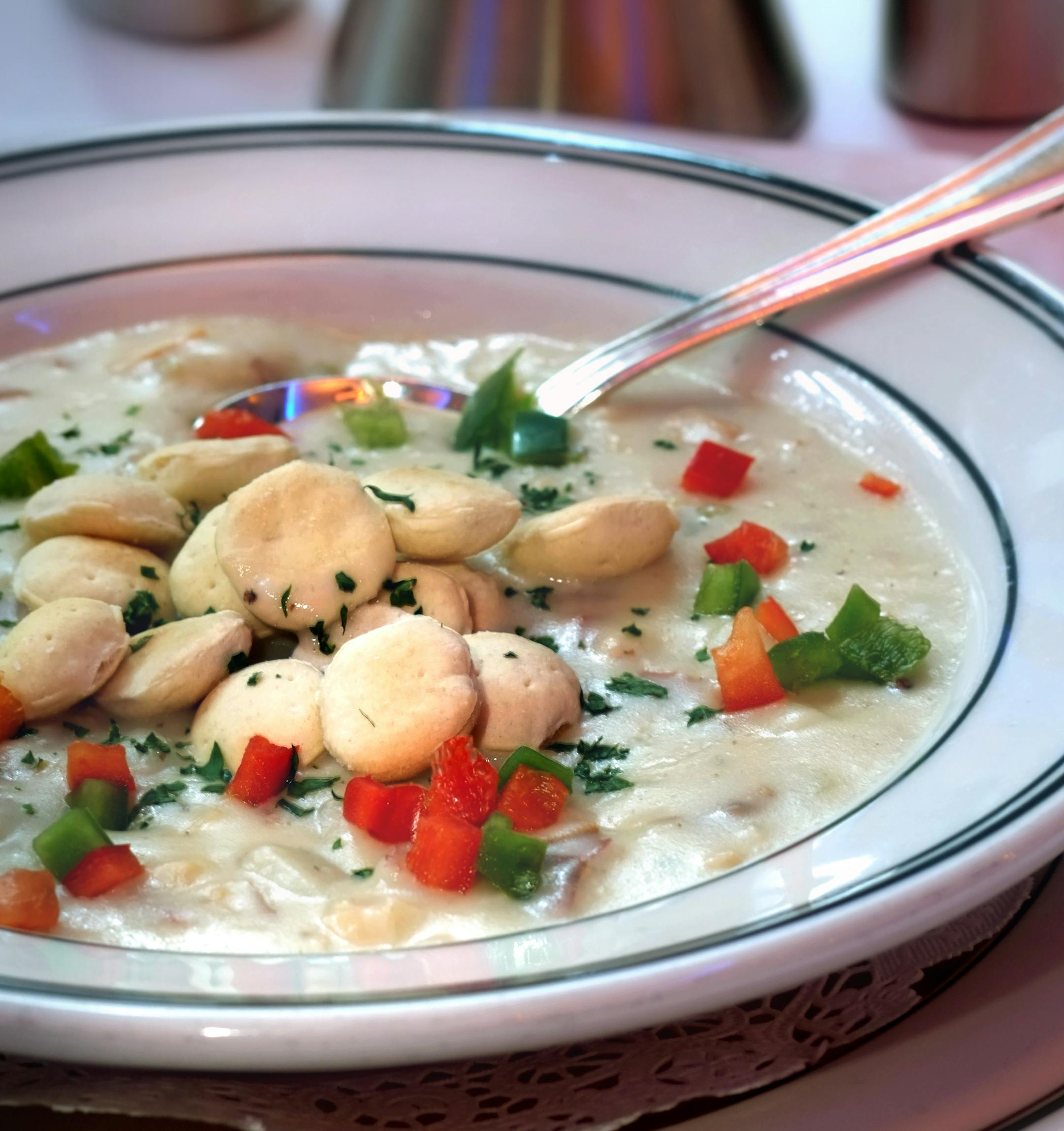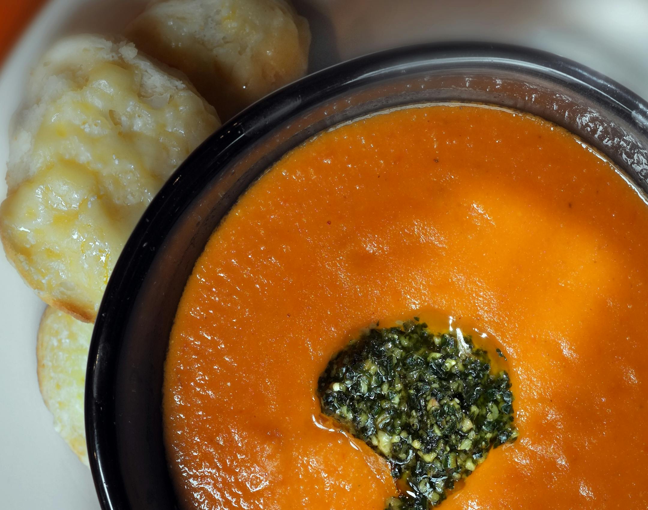 At the Belmore/New Skyway Lounge, Doug Anderson refers to his cooking as "idiot-proof," but no dummy could craft the superb tomato bisque ($5) served at this breakfast-to-late-night-er. It's simplicity itself, with roasted Roma tomatoes underscored by slow-sweated onions, traces of garlic and rosemary and a splash of cream. Its vivid color is an eye-catching contrast to the bright green (and bright-tasting) pesto garnish. Enjoy it with one of Anderson's warm, melt-in-your-mouth buttermilk biscuits.