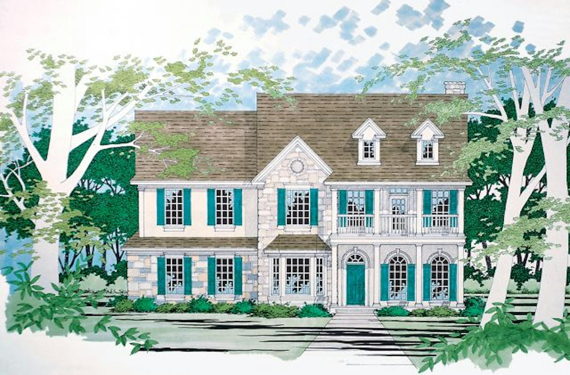 The stone and stucco facade and covered front porch give this two-story home timeless style.
