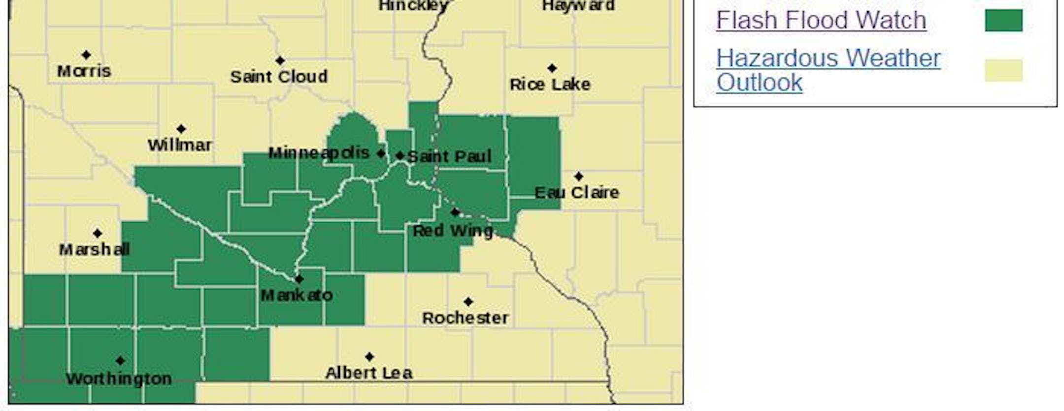 In Minnesota, the flash flood watch covers these counties: Blue Earth, Brown, Carver, Dakota, Goodhue, Hennepin, Le Sueur, Martin, Mcleod, Nicollet, Ramsey, Redwood, Renville, Rice, Scott, Sibley, Waseca, Washington and Watonwan. West central Wisconsin counties of Dunn, Pepin, Pierce and St. Croix also are included in the watch.