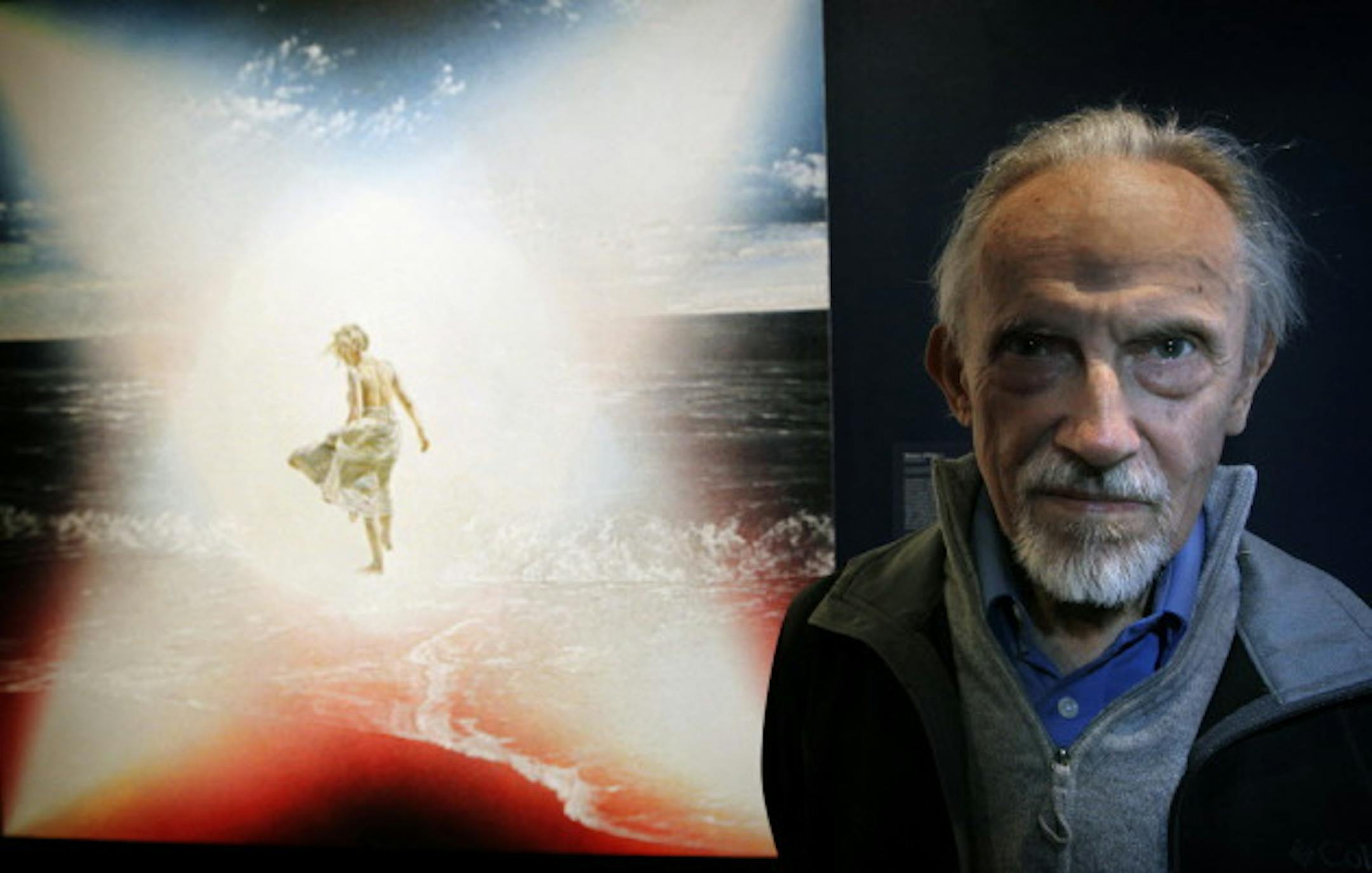 Portrait of Oleg Vassiliev with his painting of his wife Kira walking from a beach into a bowl of light. Star Tribune photo by Tom Wallace taken in November 2011.