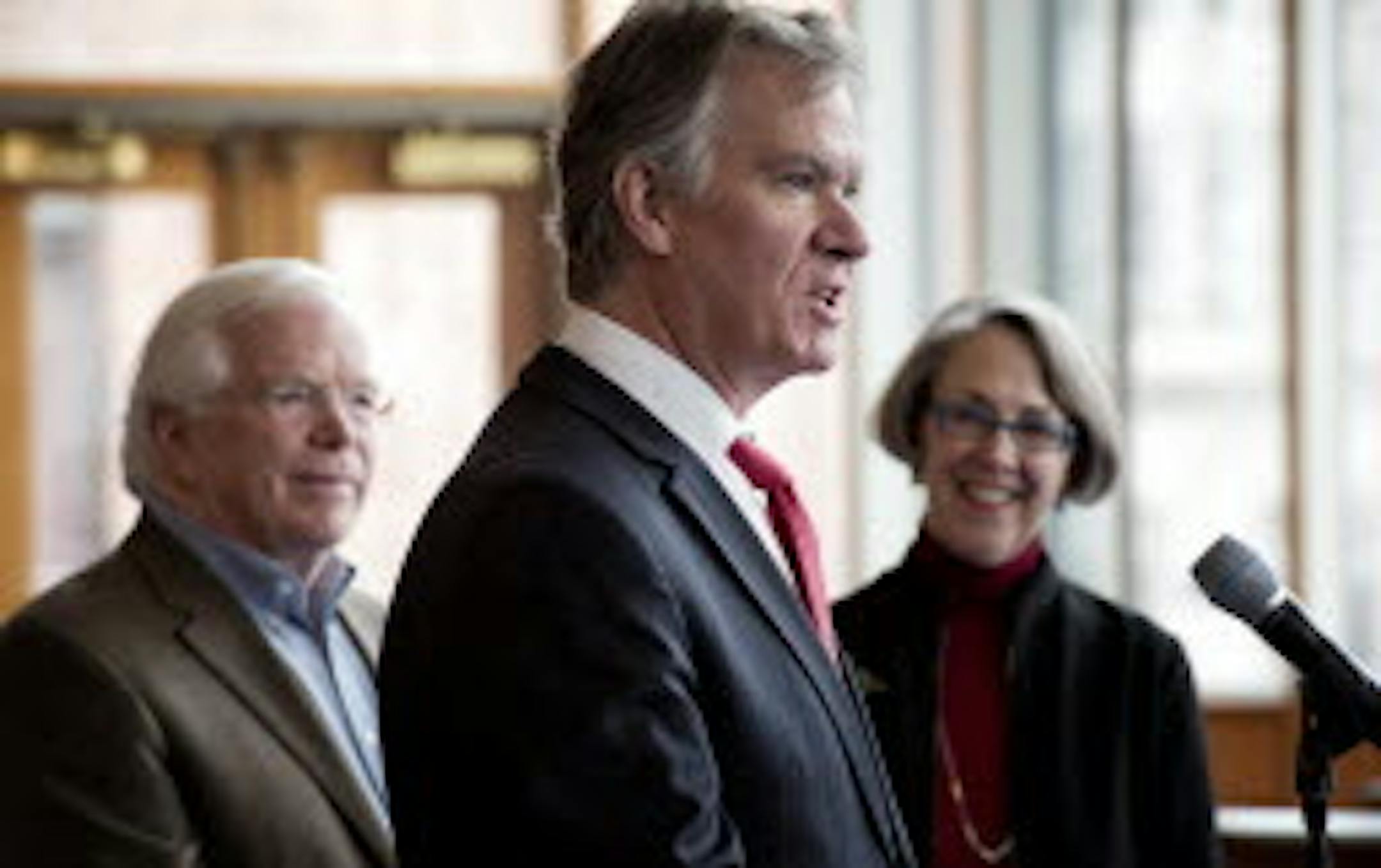 Mayor Chris Coleman spoke at a press conference Wednesday at the Ordway Center, flanked by SPCO board chairman Dobson West and Ordway President Patricia Mitchell./Photo by Glen Stubbe