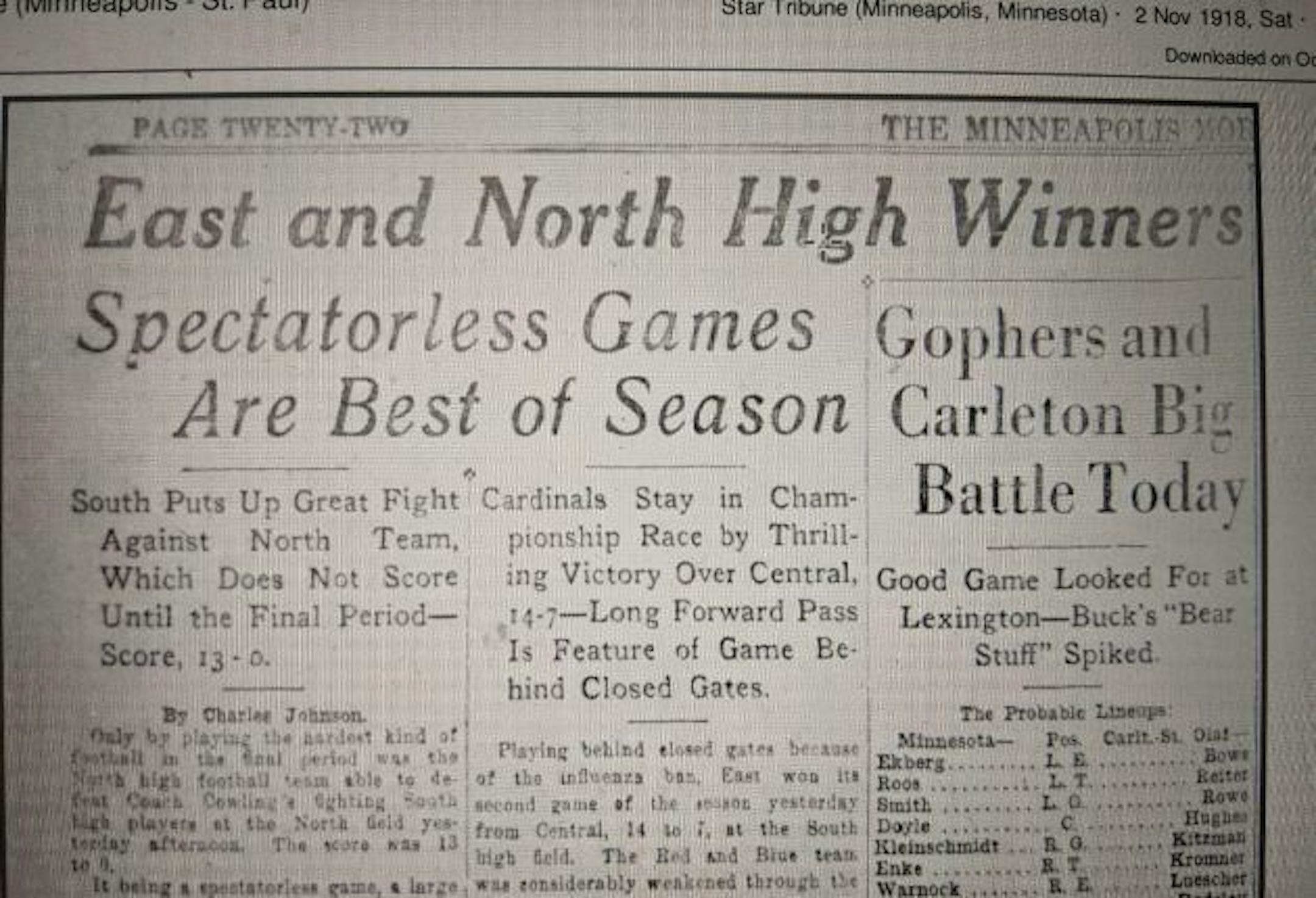 On that day two games were played in the city. North defeated South 13-0, while East defeated Central 14-7. "Spectatorless games are best of season," read a headline in the Nov. 2 edition of the Minneapolis Tribune.