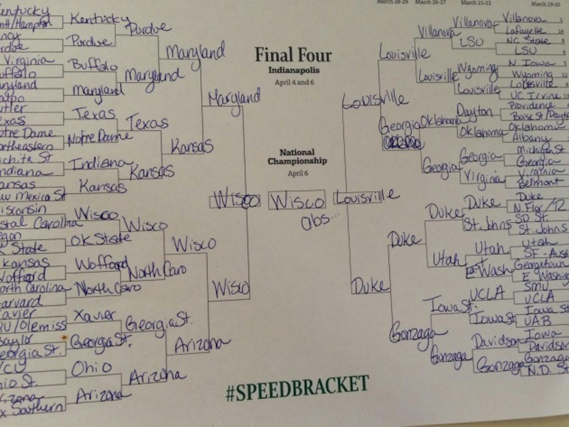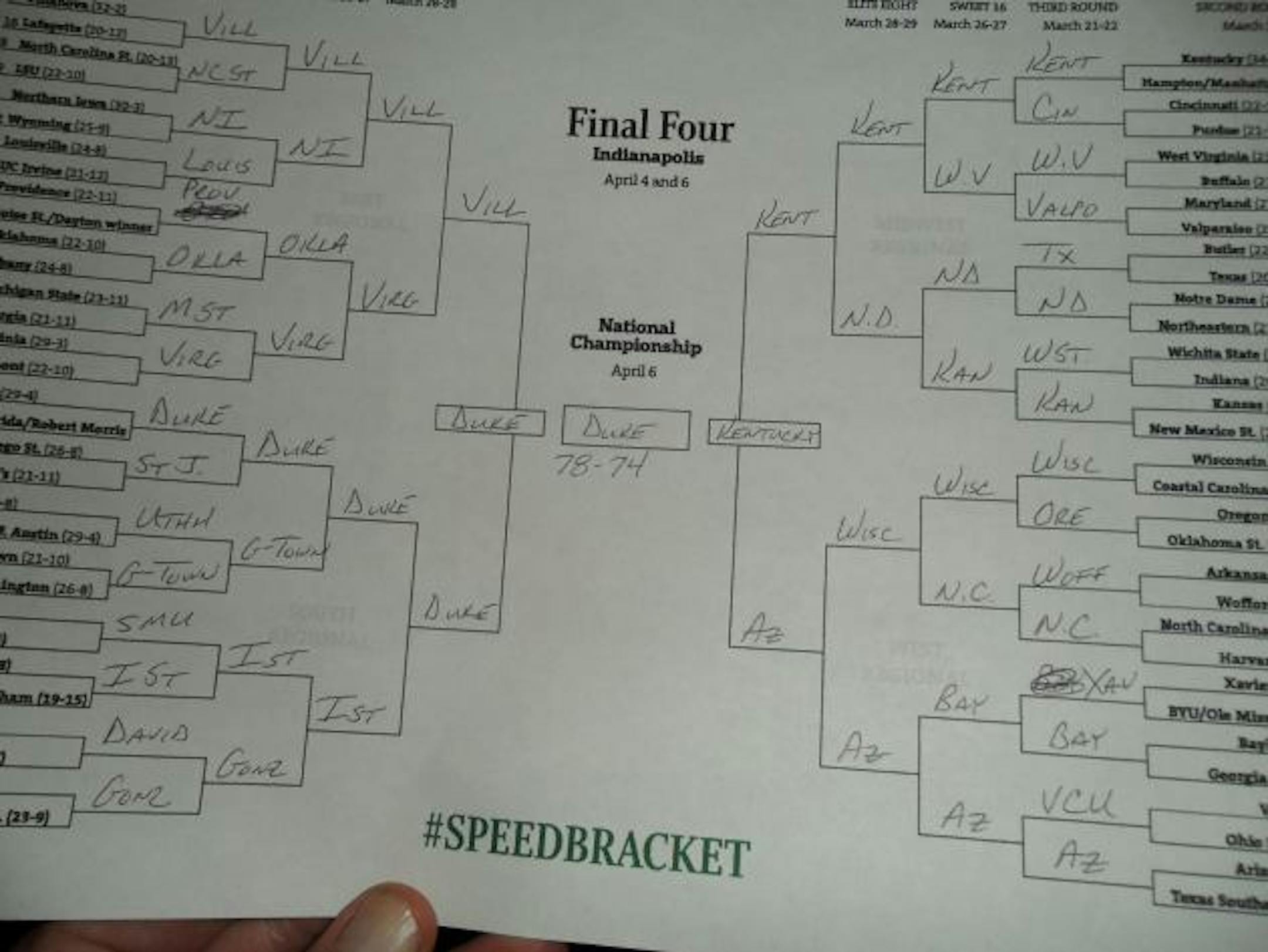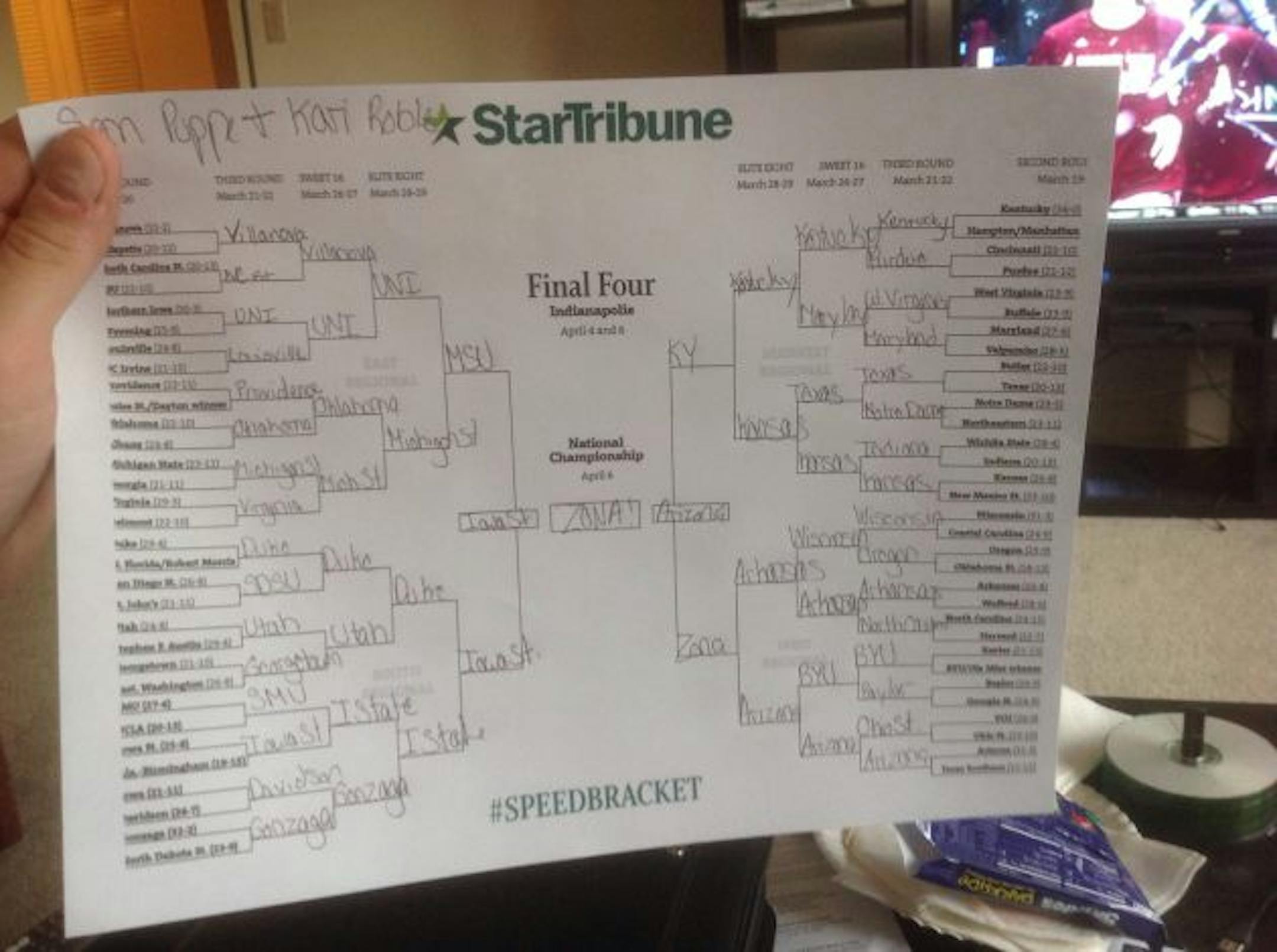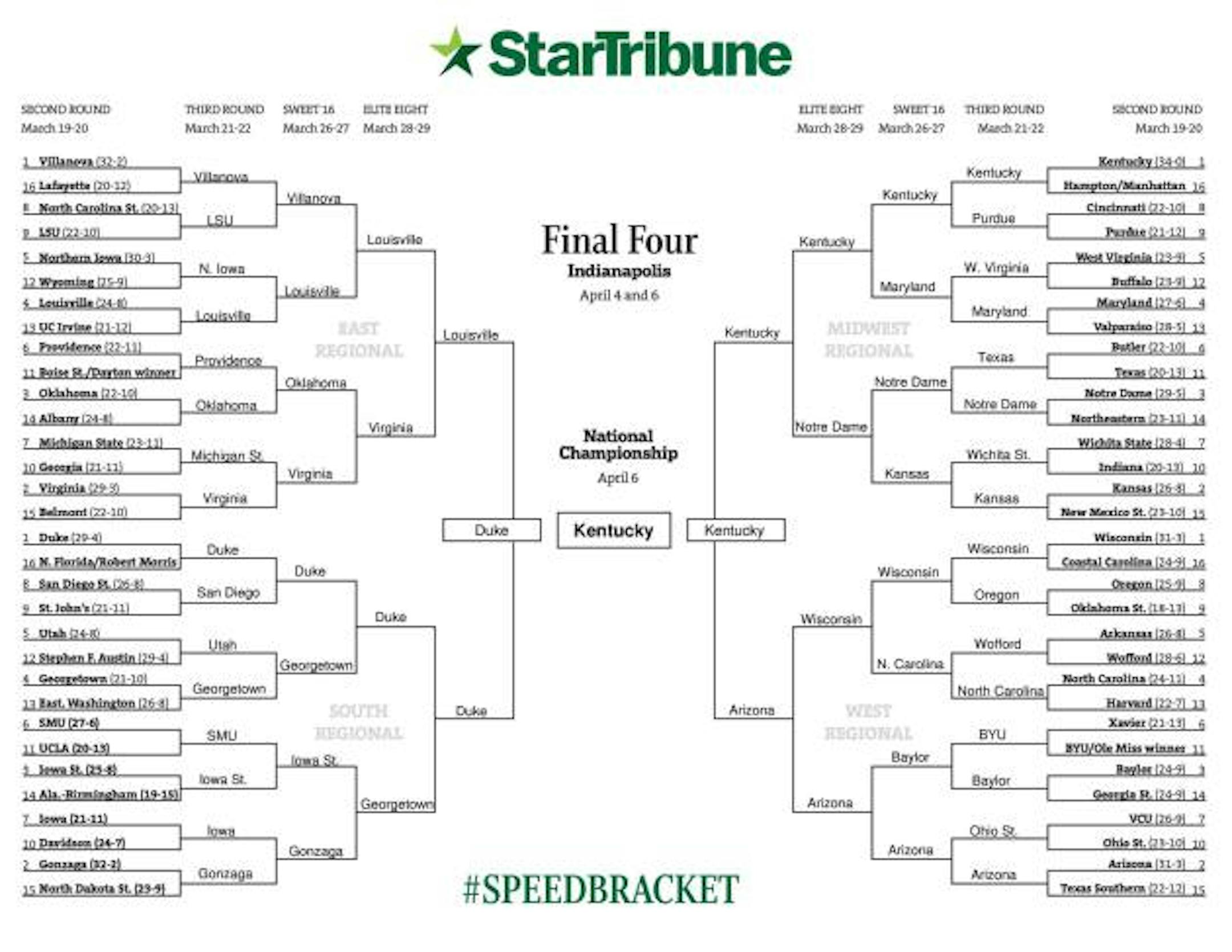 One thing is for sure: Heavy-favorite Kentucky ruled the evening. Seven of 10 Star Tribune staff brackets have the Wildcats cutting down the nets (The others: Wisconsin, Duke and ... NDSU).