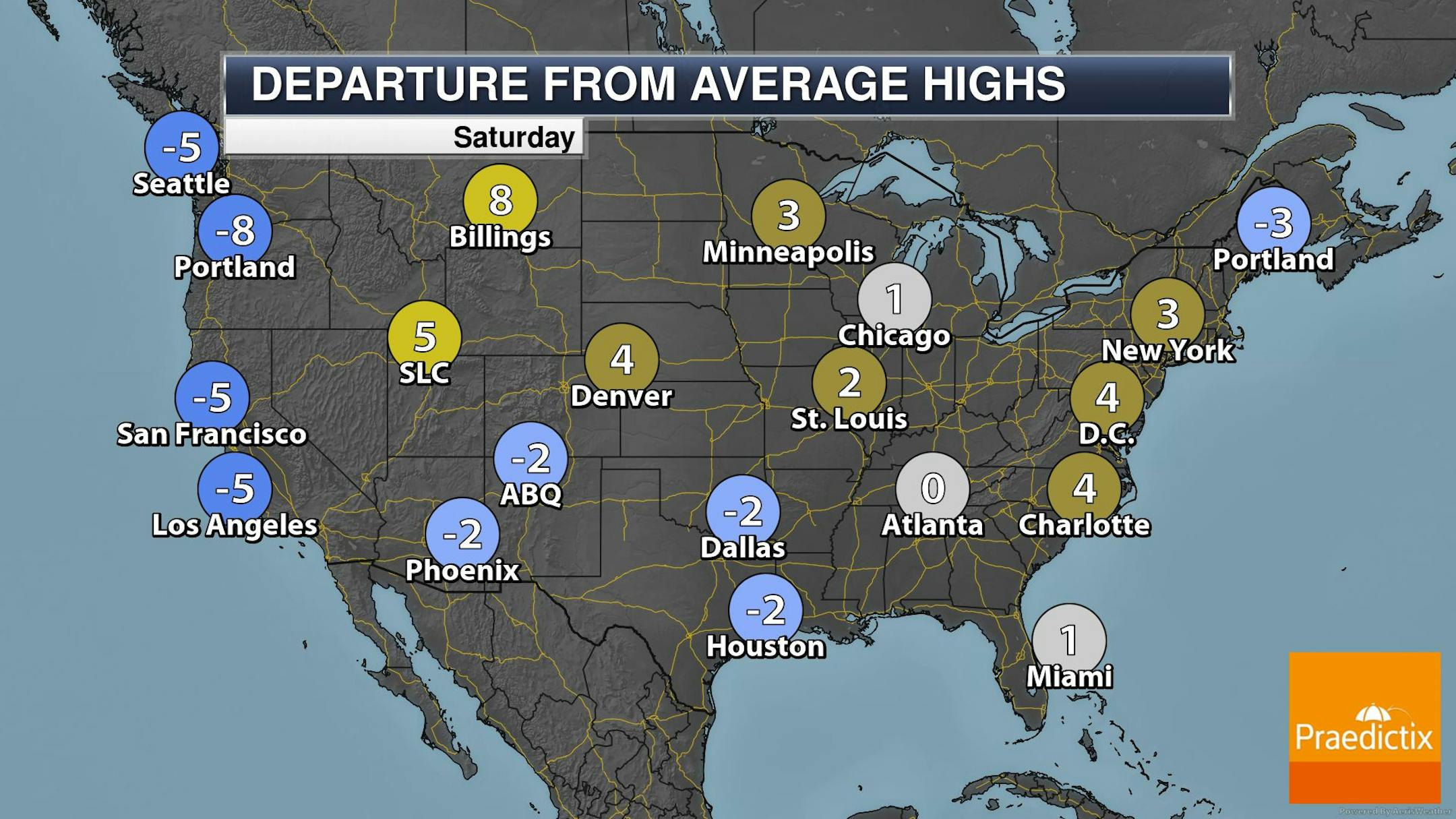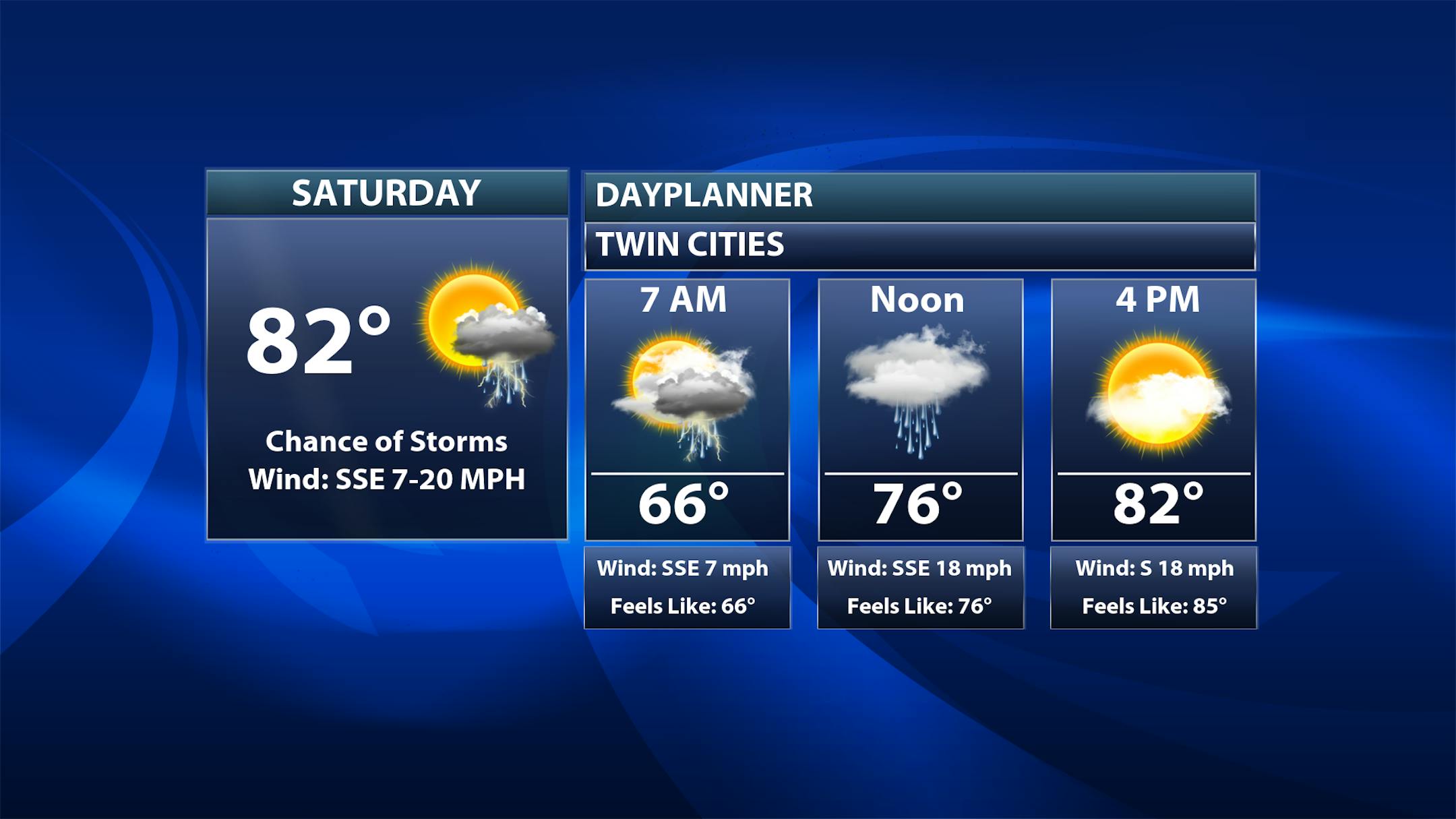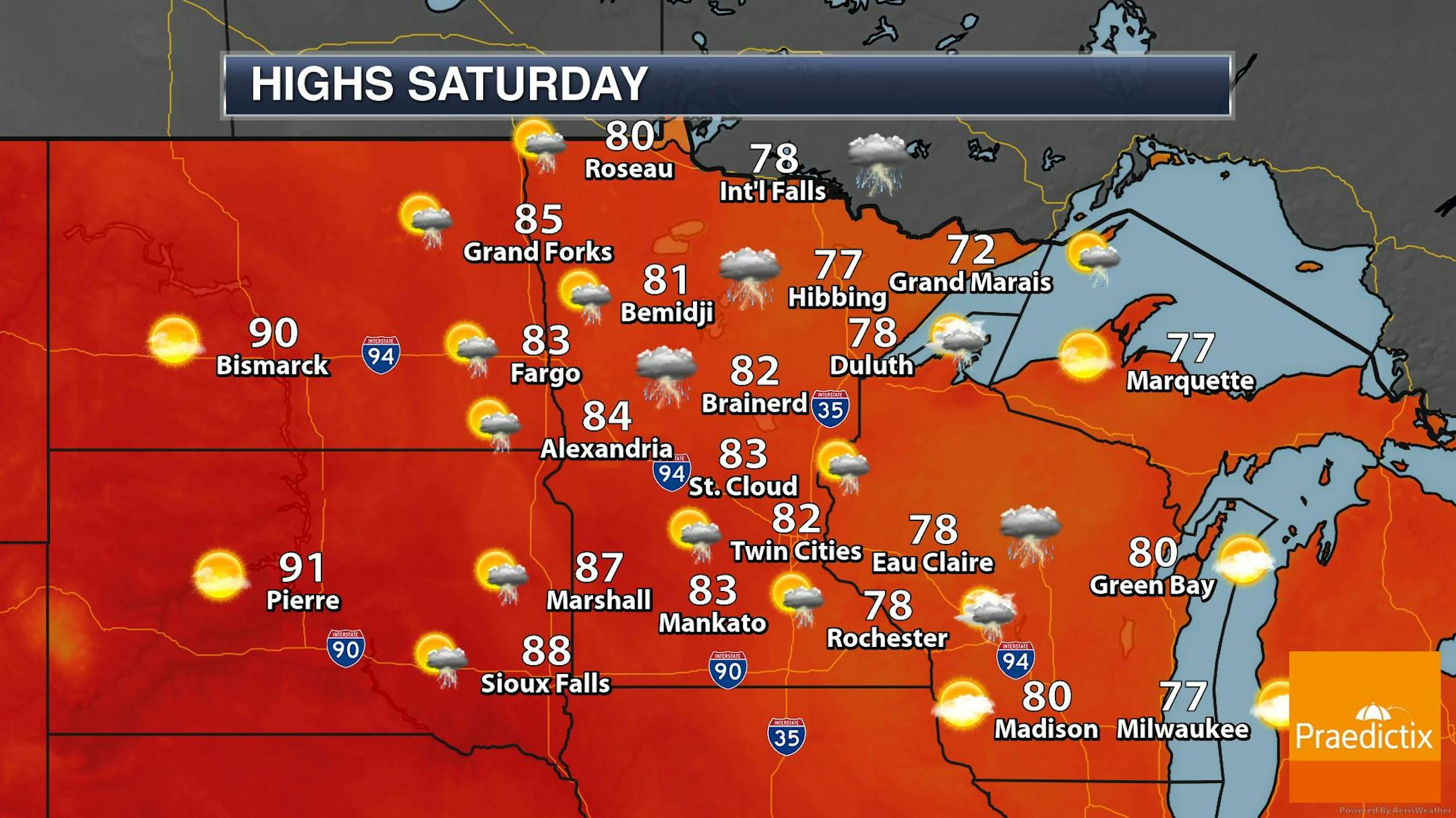 The weather outlook for Saturday shows temps running above average by nearly +5F with readings warming into the 70s and 80s. There could be a few low 90s across the Dakotas. There will also be a few showers and storms, some of which could be strong with locally heavy rainfall.