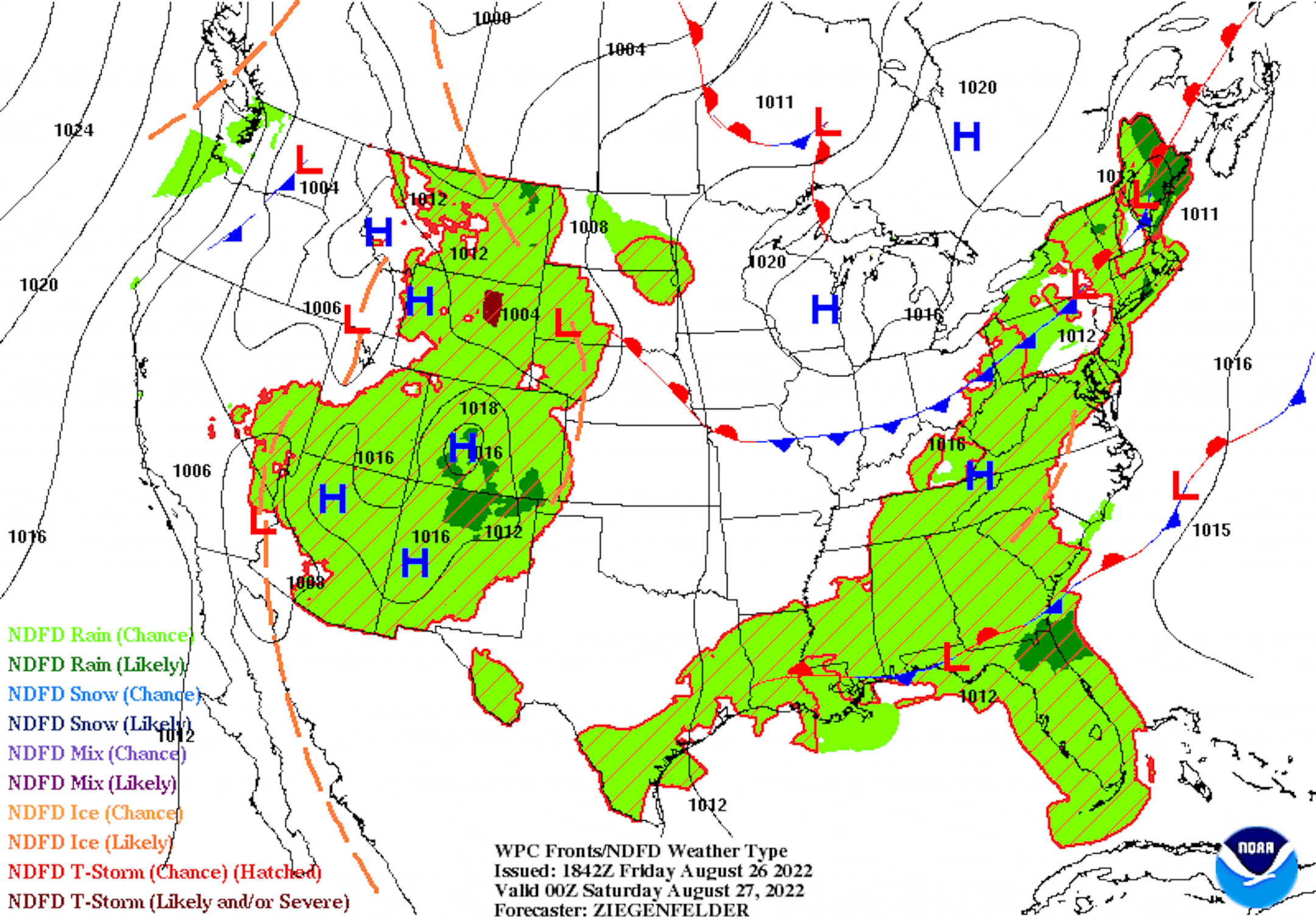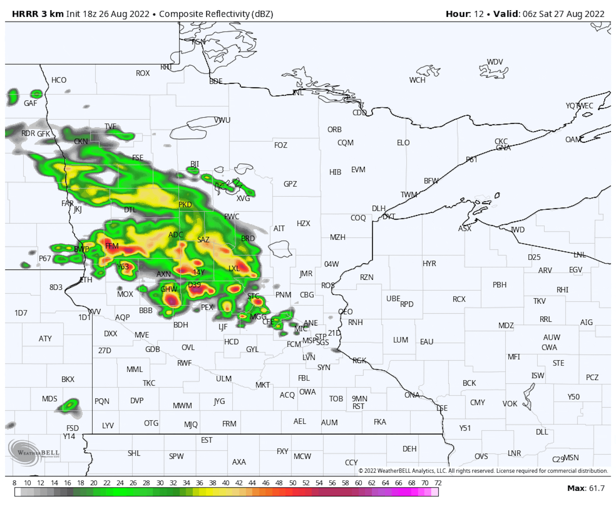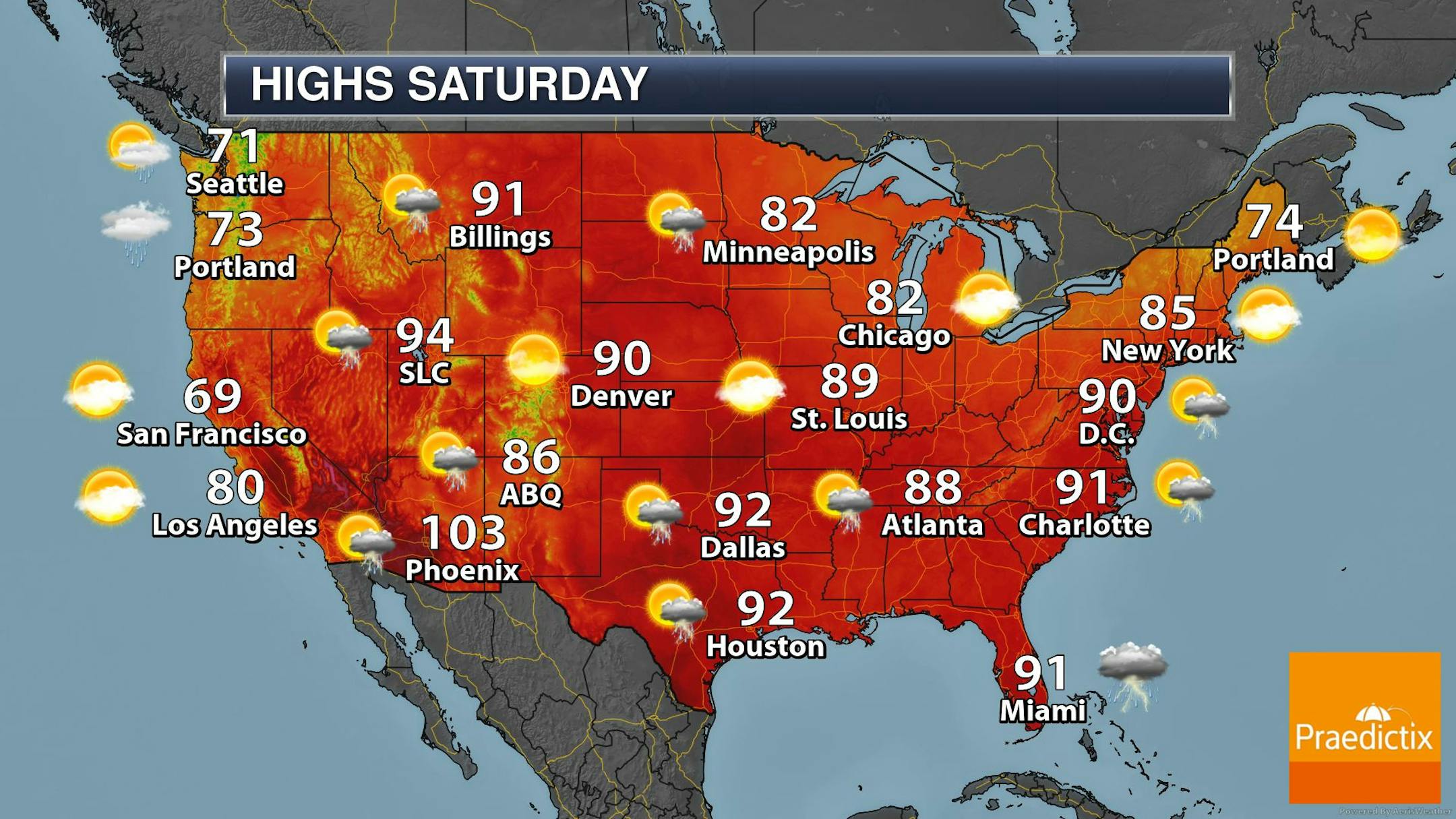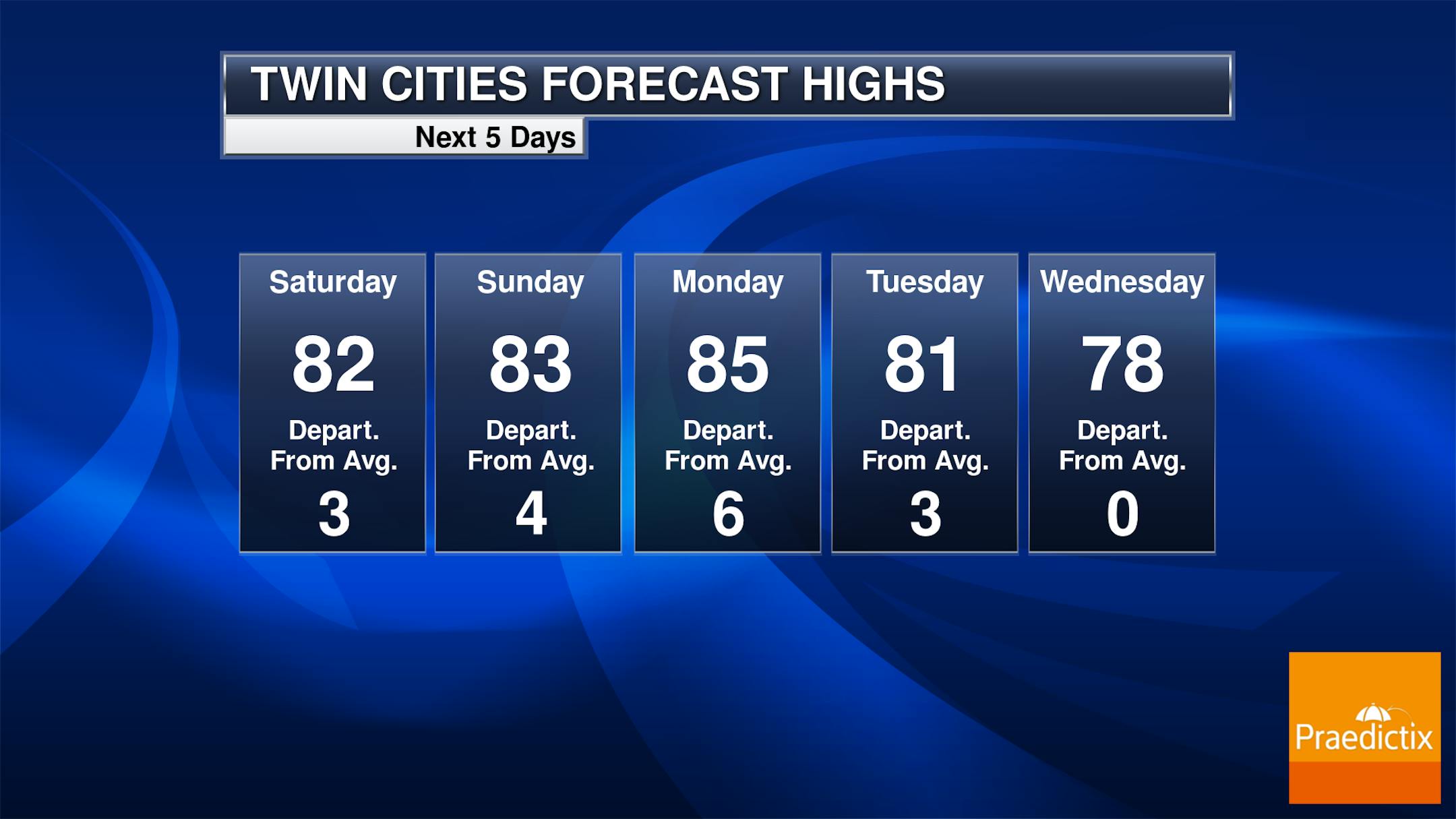 The weather outlook for Saturday shows temps running above average by nearly +5F with readings warming into the 70s and 80s. There could be a few low 90s across the Dakotas. There will also be a few showers and storms, some of which could be strong with locally heavy rainfall.