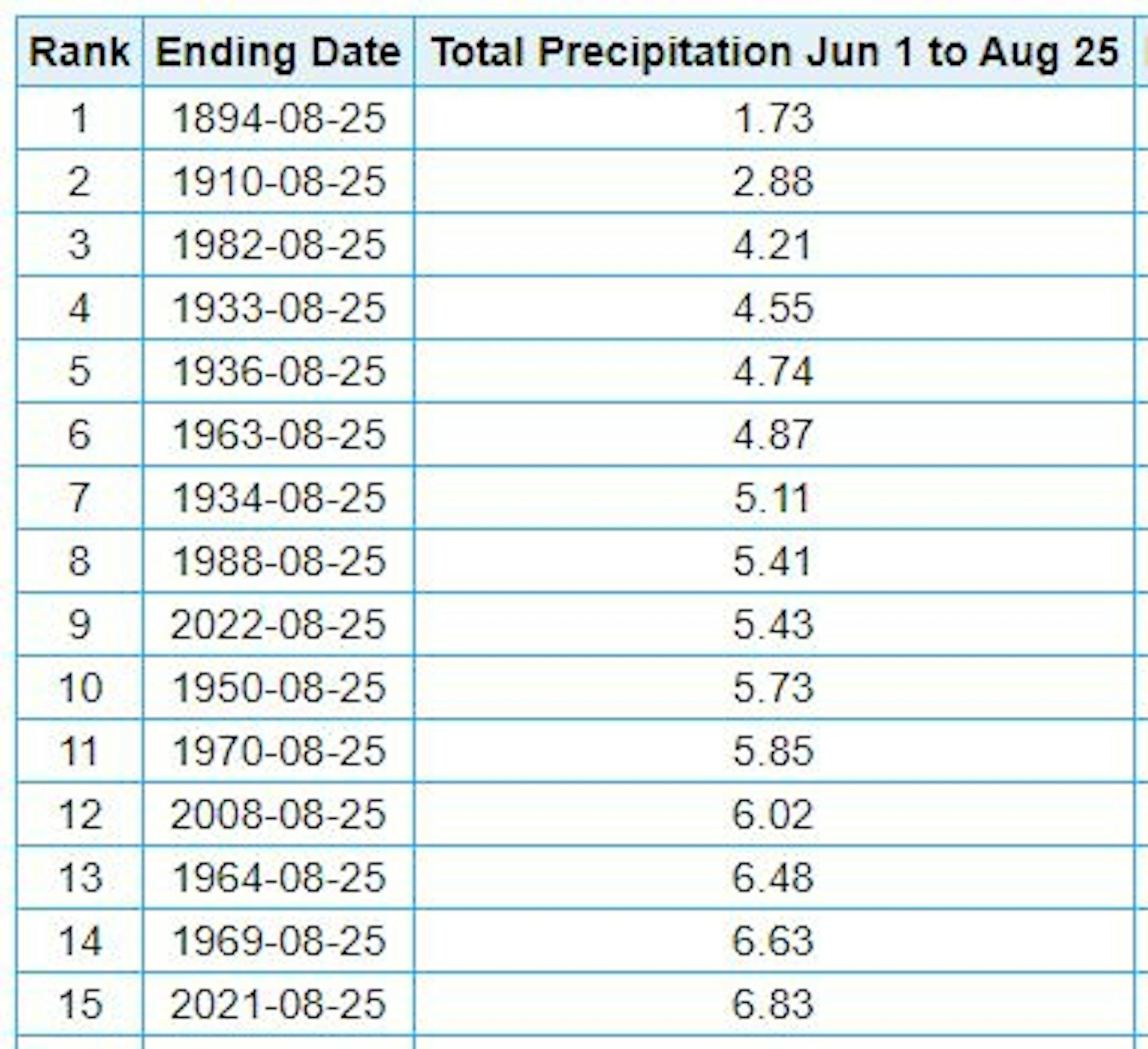 Here are the 15 driest summer's on record at MSP. Note that this summer (since June 1st) has been the 9th driest, last year was the 15th driest. If MSP doesn't see any additional rainfall through the rest of August, this would be the 6th driest summer on record.
